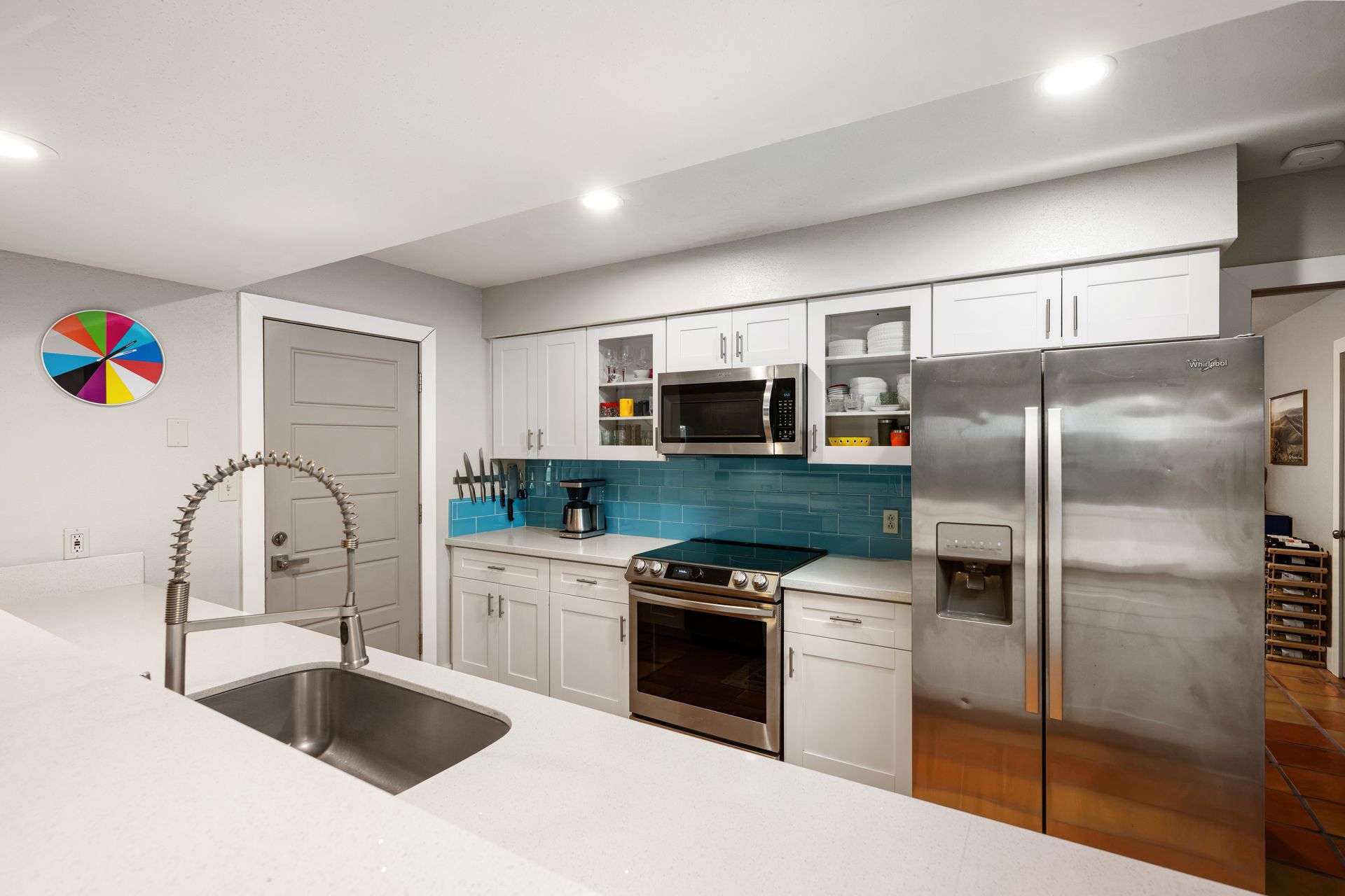 The kitchen blends function and style with quartz countertops, white cabinetry, stainless appliances, a turquoise subway tile backsplash, and a generous breakfast bar designed for gathering.