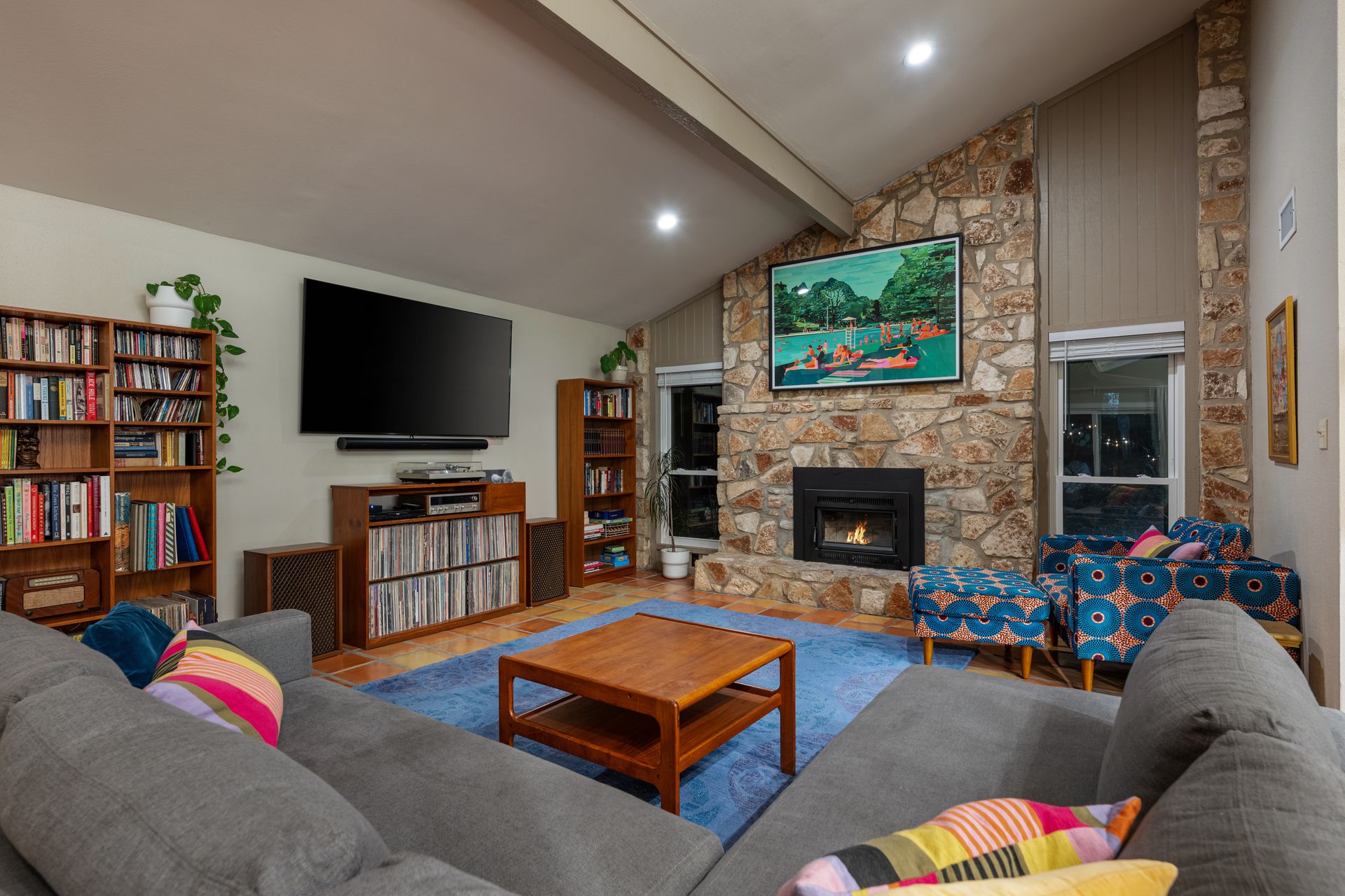Outdoors, the fenced backyard offers stone terracing and multiple seating areas beneath mature trees, creating a relaxed setting for entertaining or unwinding.