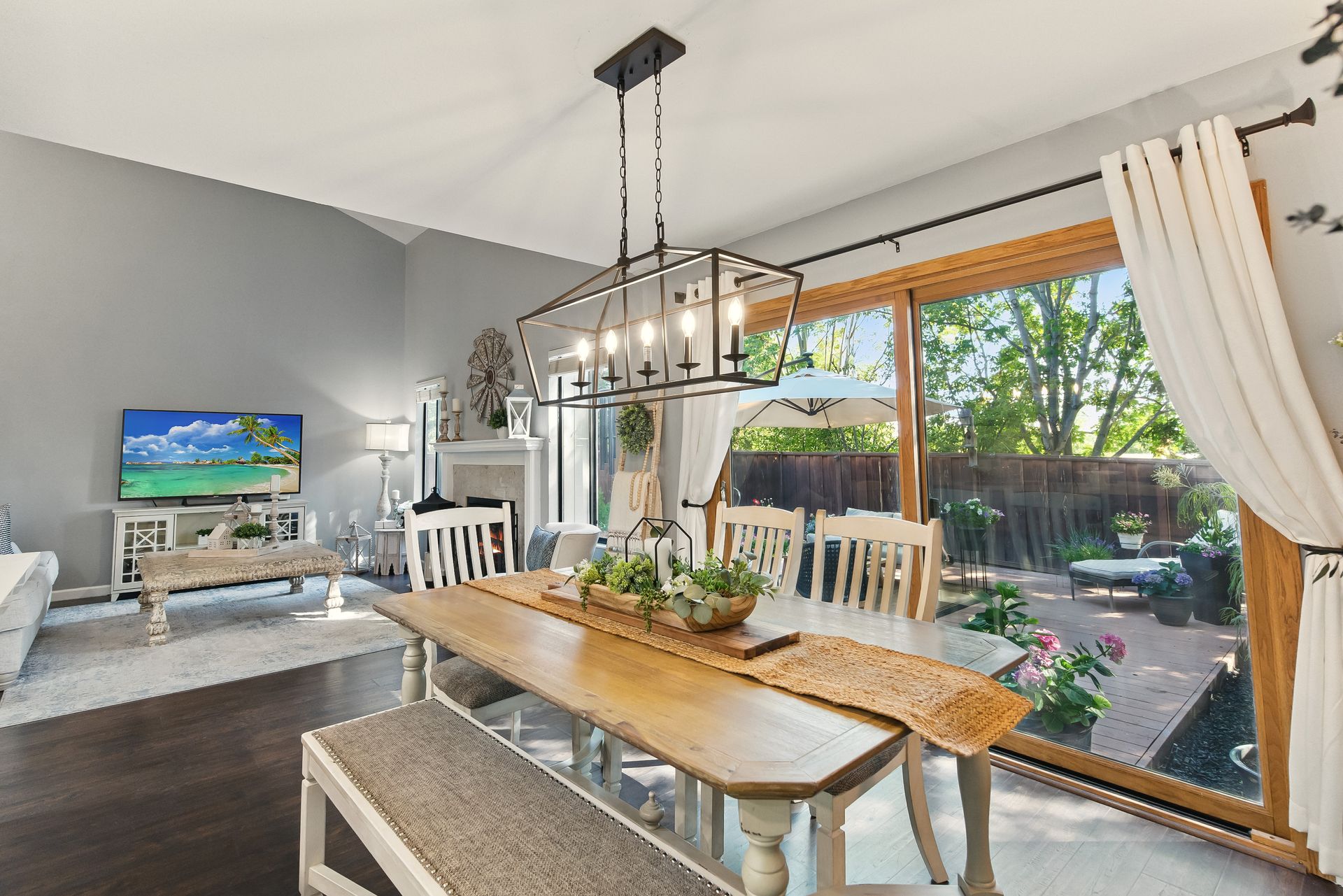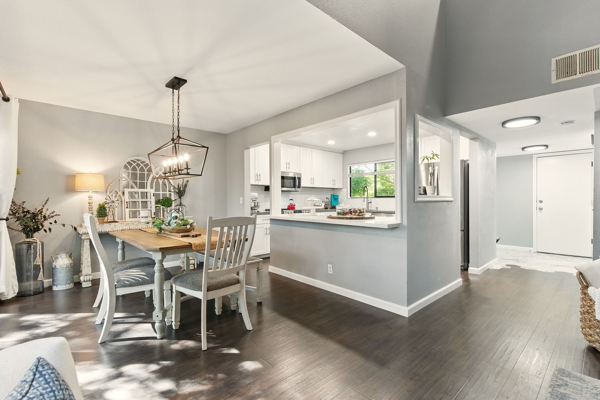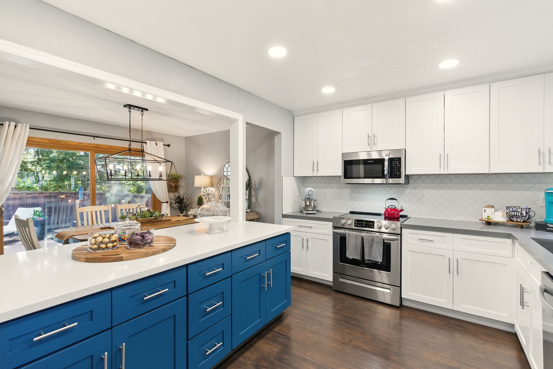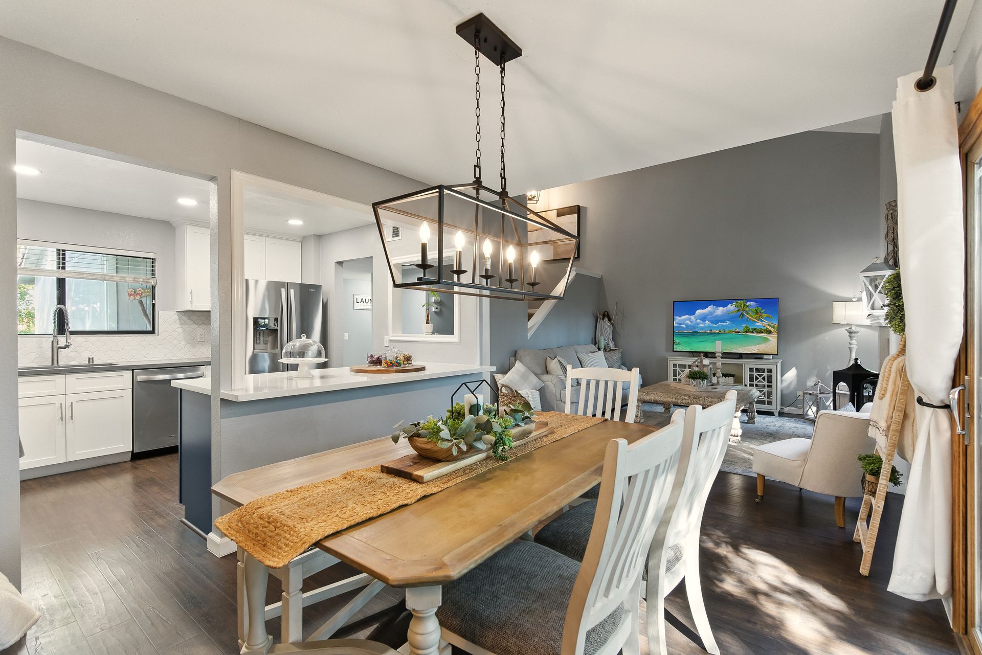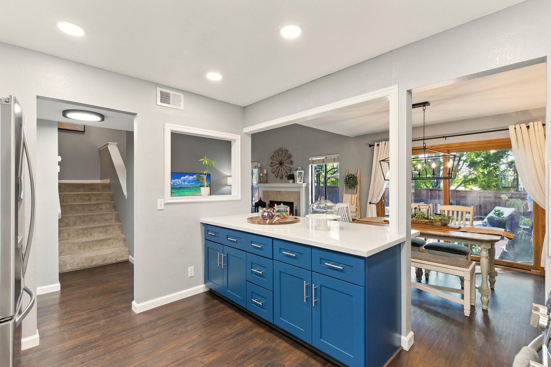 Inside, the remodeled kitchen is both stylish and functional, with modern quartz surfaces, stainless steel appliances, and a seamless connection to the dining and living areas. Whether you're preparing a casual weeknight meal or hosting a dinner party, the layout feels inclusive and inviting.