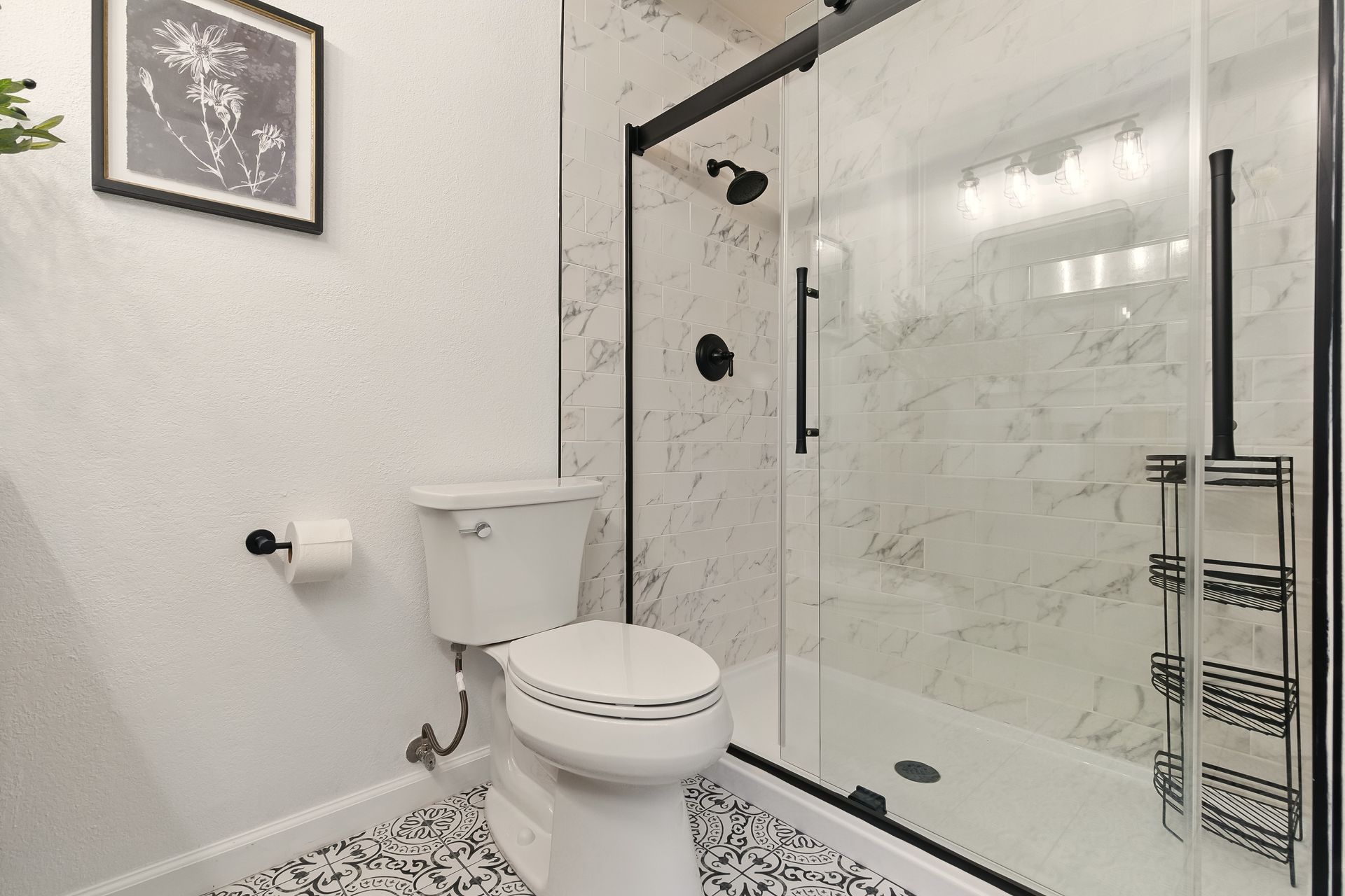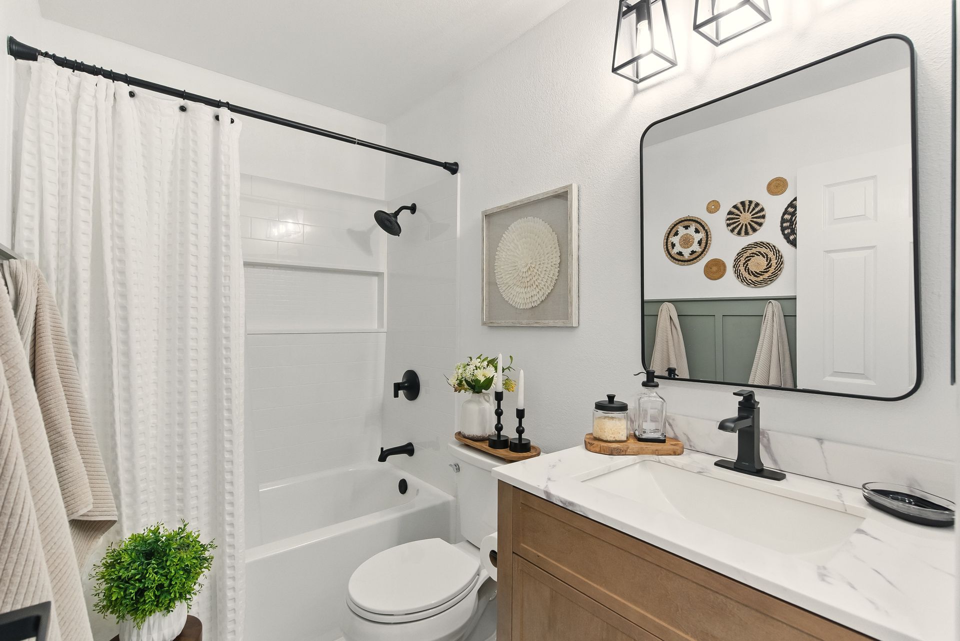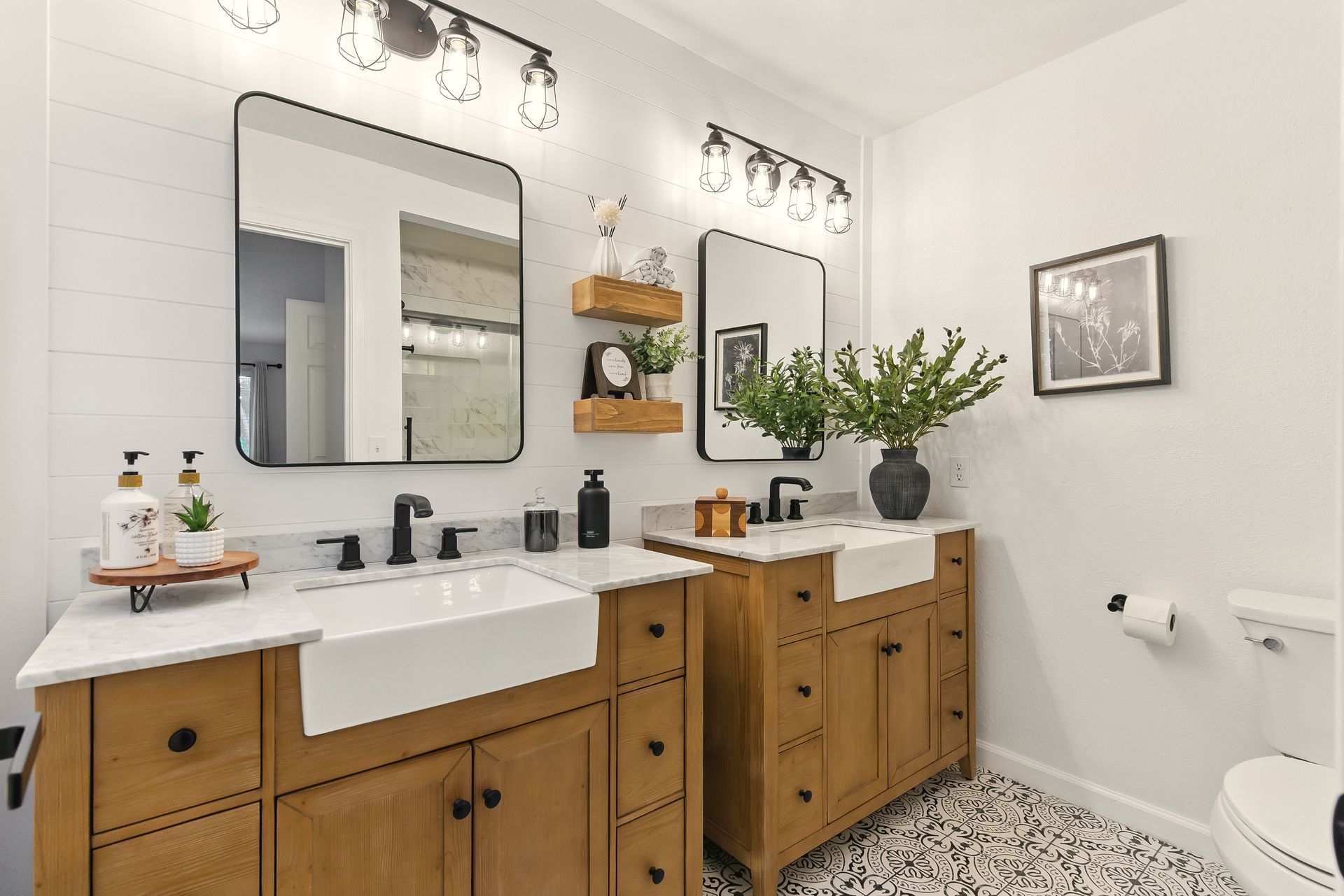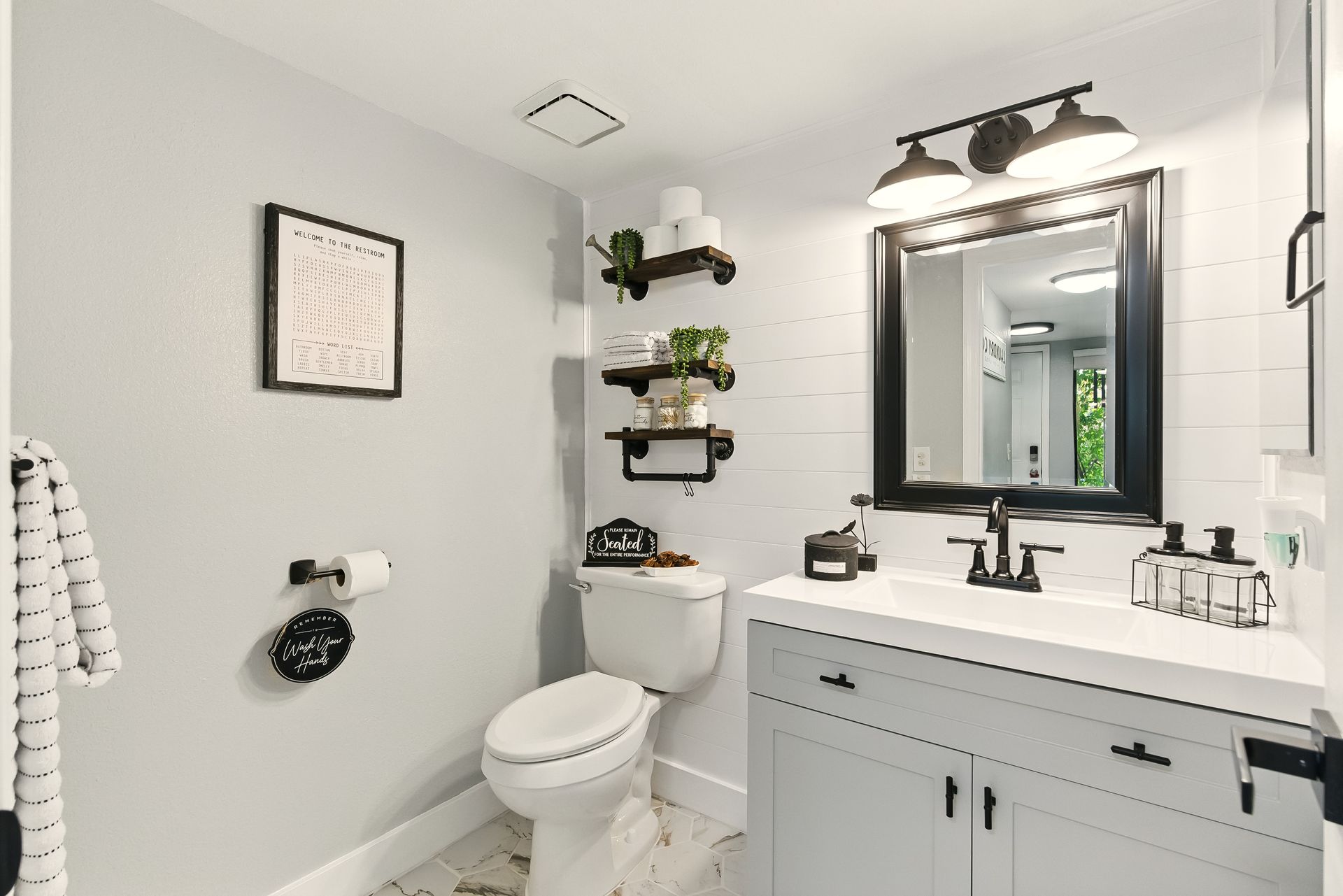 Upstairs, the primary suite offers a quiet retreat with a walk-in closet and an updated en-suite bathroom featuring a sleek, modern shower. A second full bathroom includes a tub, ideal for a relaxing soak, while the main-level powder room adds charm with its wood accent wall and contemporary design.
