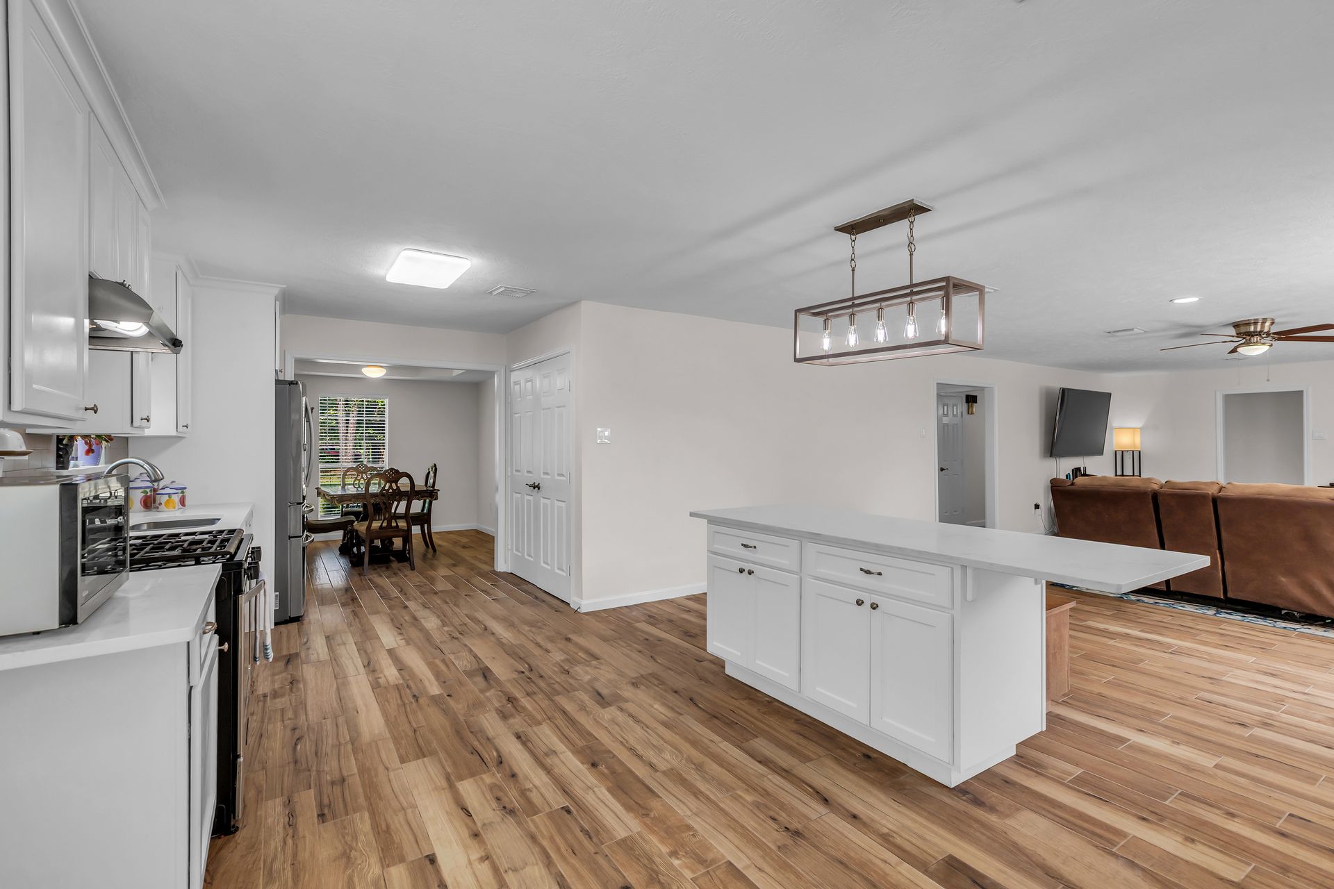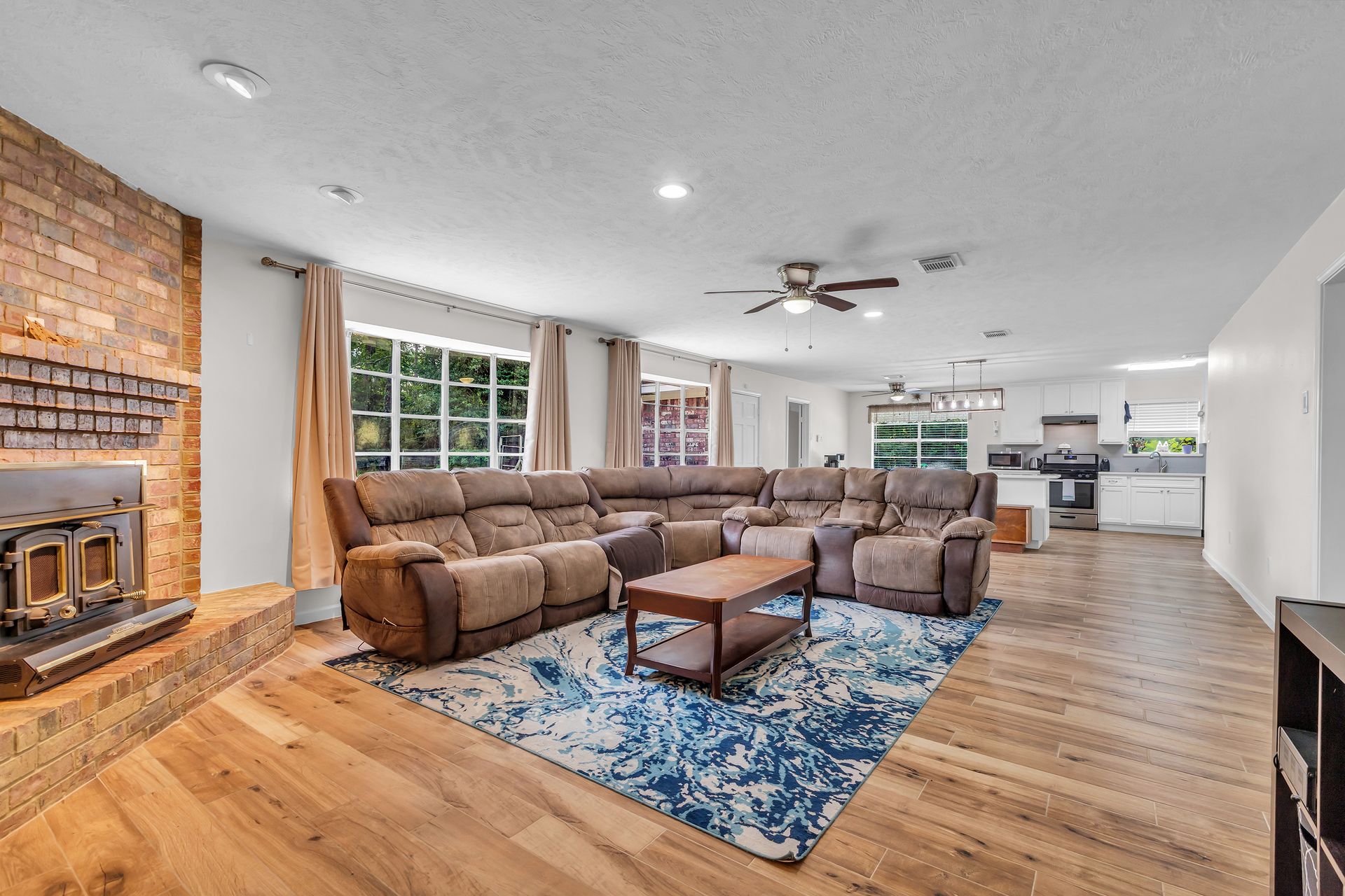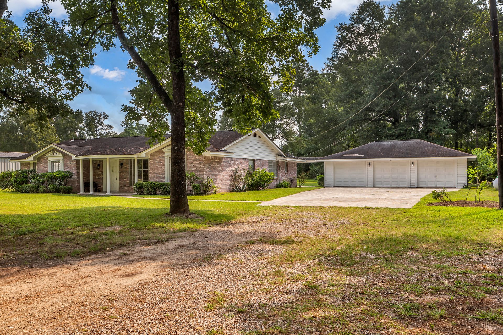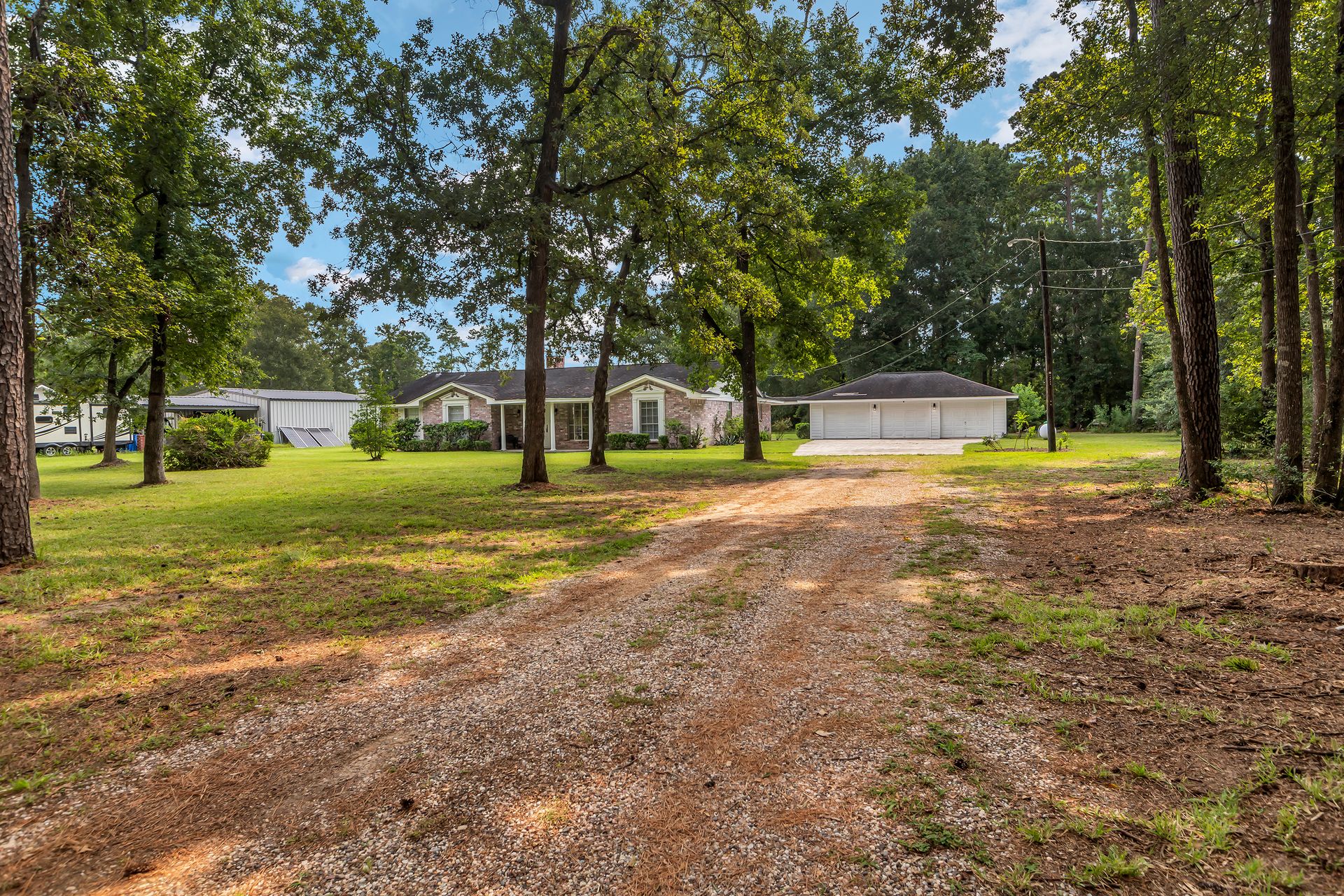 Retreat to peaceful surroundings and to this home on a partially wooded two-and-a-half-acre lot, with no restrictions! This home offers the ultimate country living and freedom to create your dream lifestyle. Venture inside this thoughtfully designed home, which lives larger than its size, as it boasts open and spacious rooms throughout. An entry foyer welcomes you to the formal living and dining areas, which could easily convert to a home office/study or adapt to your needs. An island kitchen features crisp white cabinets, elegant quartz countertops, stainless steel appliances, and overlooks a spacious family room with tons of light and a wood-burning fireplace. Popular wood-look ceramic throughout main areas for seamless flow. Enjoy the luxury of a detached three-car garage, offering room for vehicles, hobbies, and your outdoor toys. Endless possibilities for your garden, play area, or workshop! Situated between Grand Parkway and Hwy 59 to get you around easily to shopping, dining, and nearby schools!