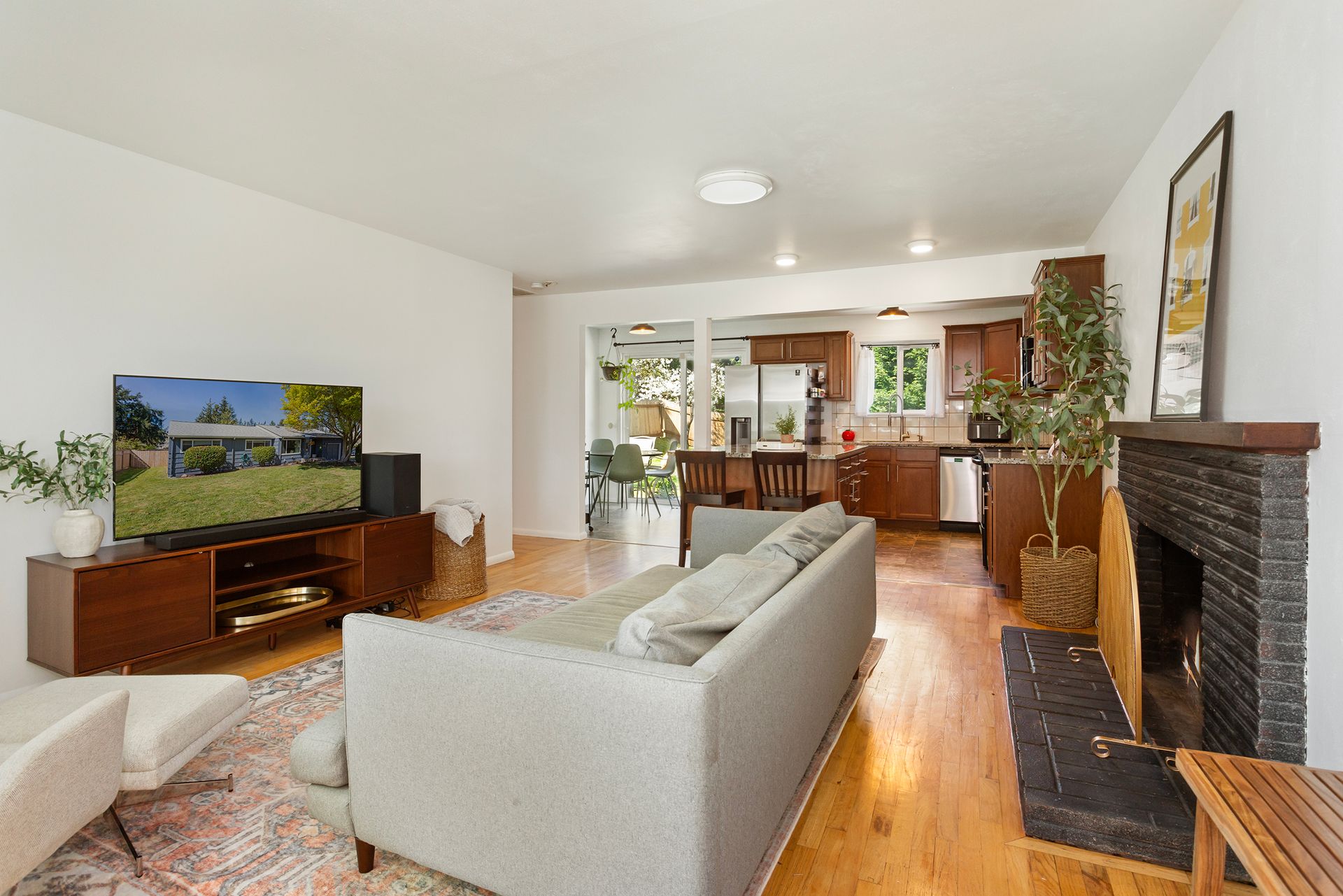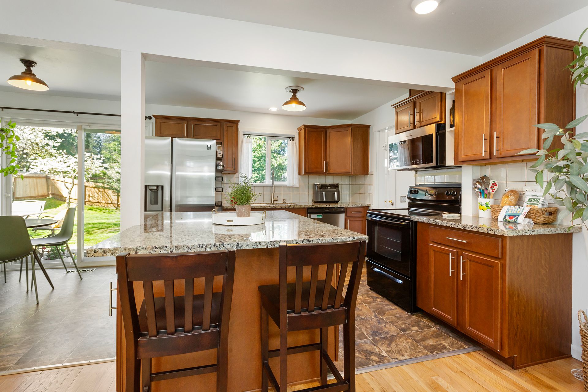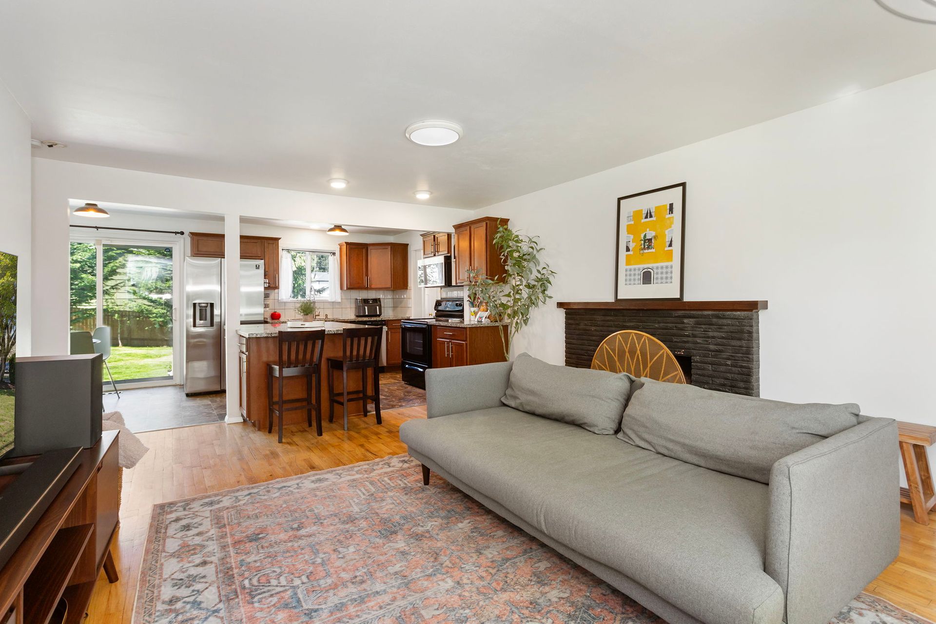 Great room with large kitchen, slab granite island and SS/Blk appliances and includes Living room with cozy wood burning Fireplace. Home features updated plumbing, counters, vinyl windows, doors, interior and exterior paint.