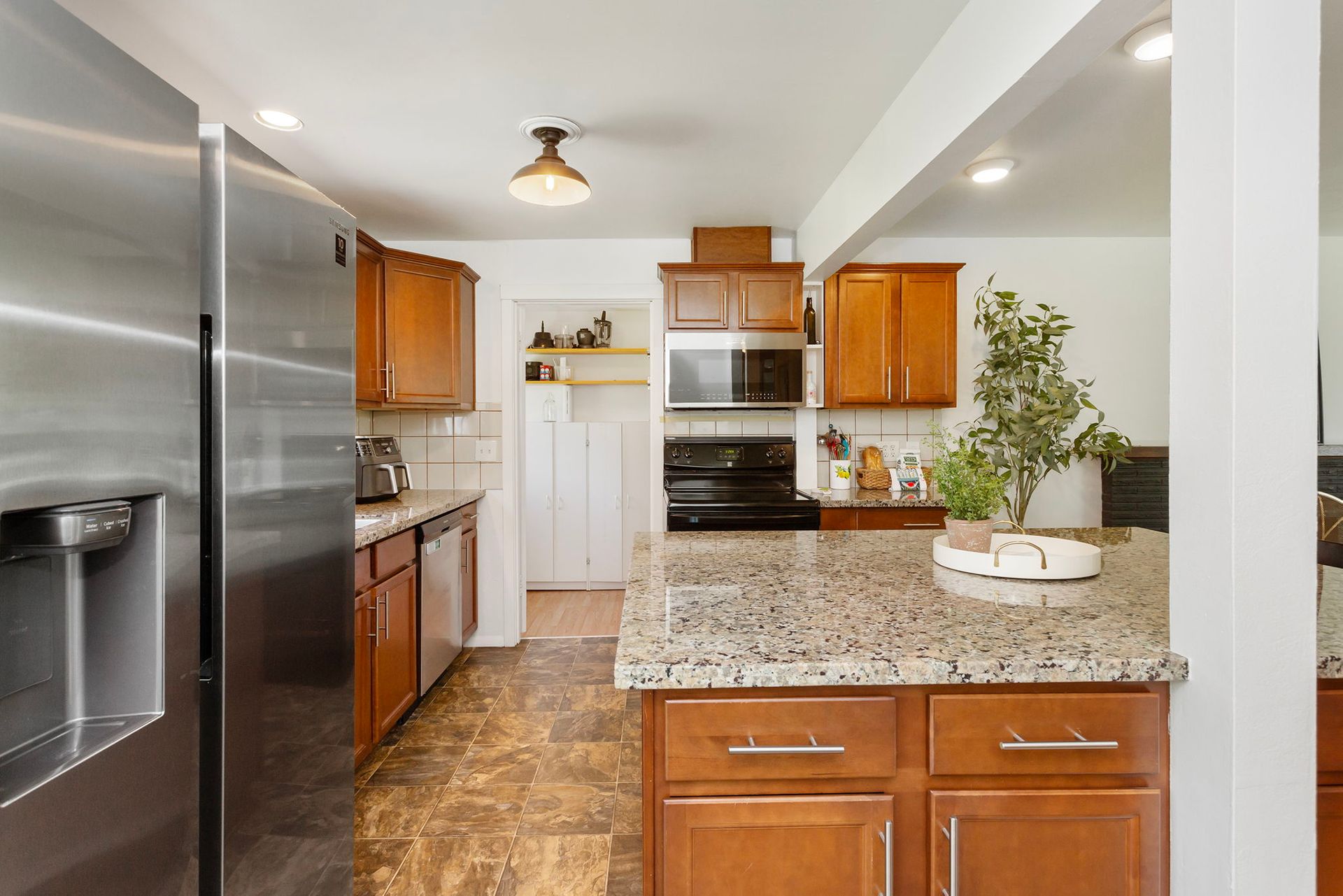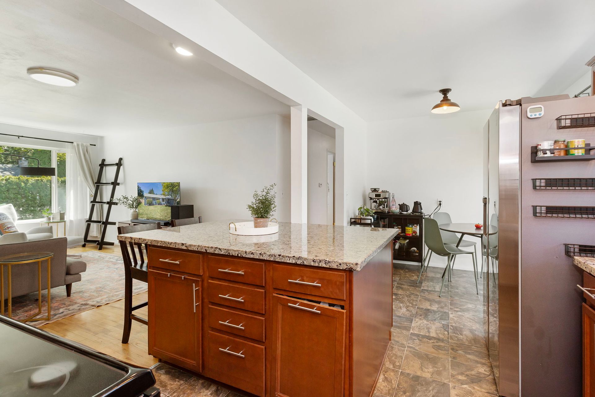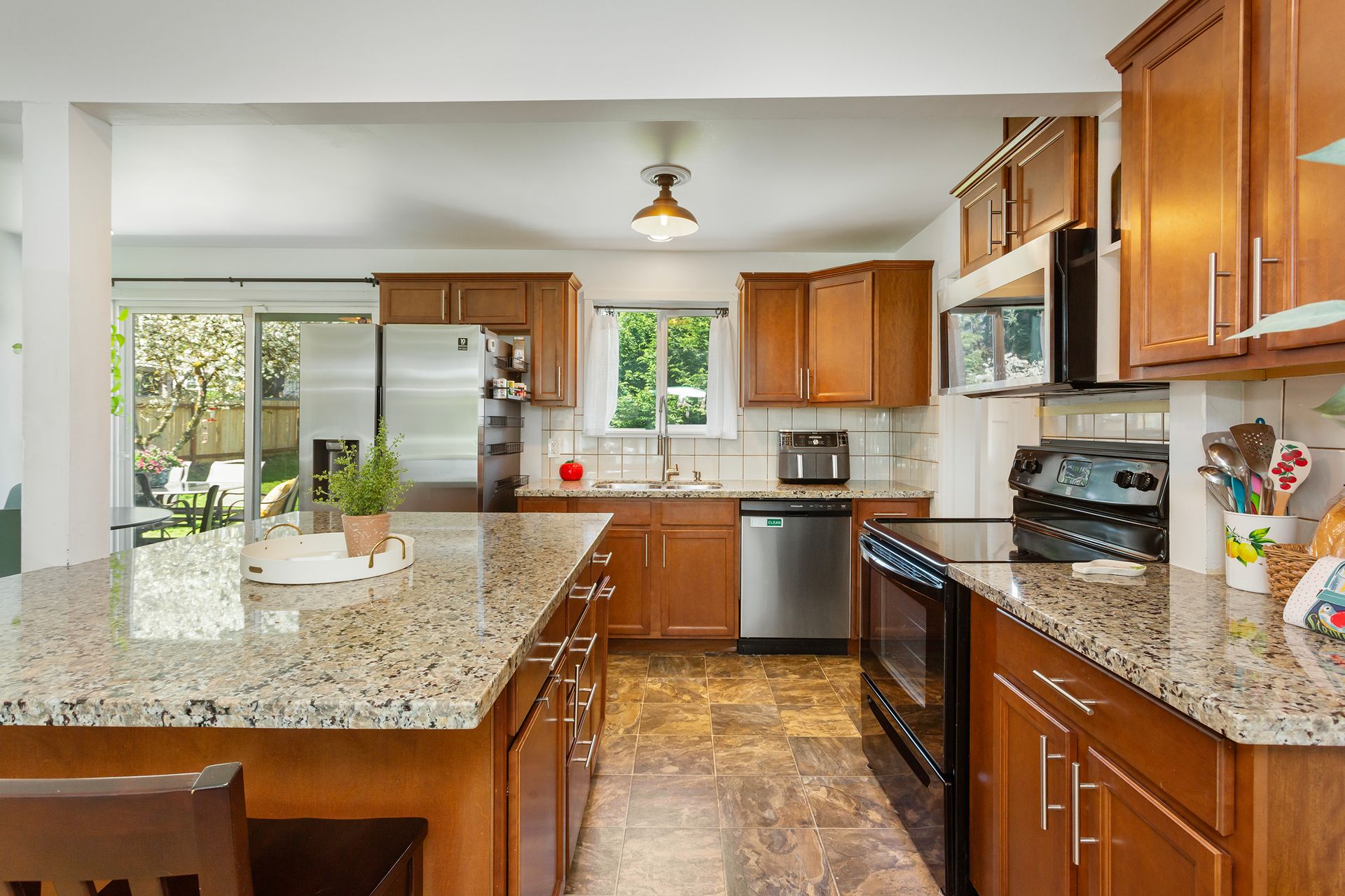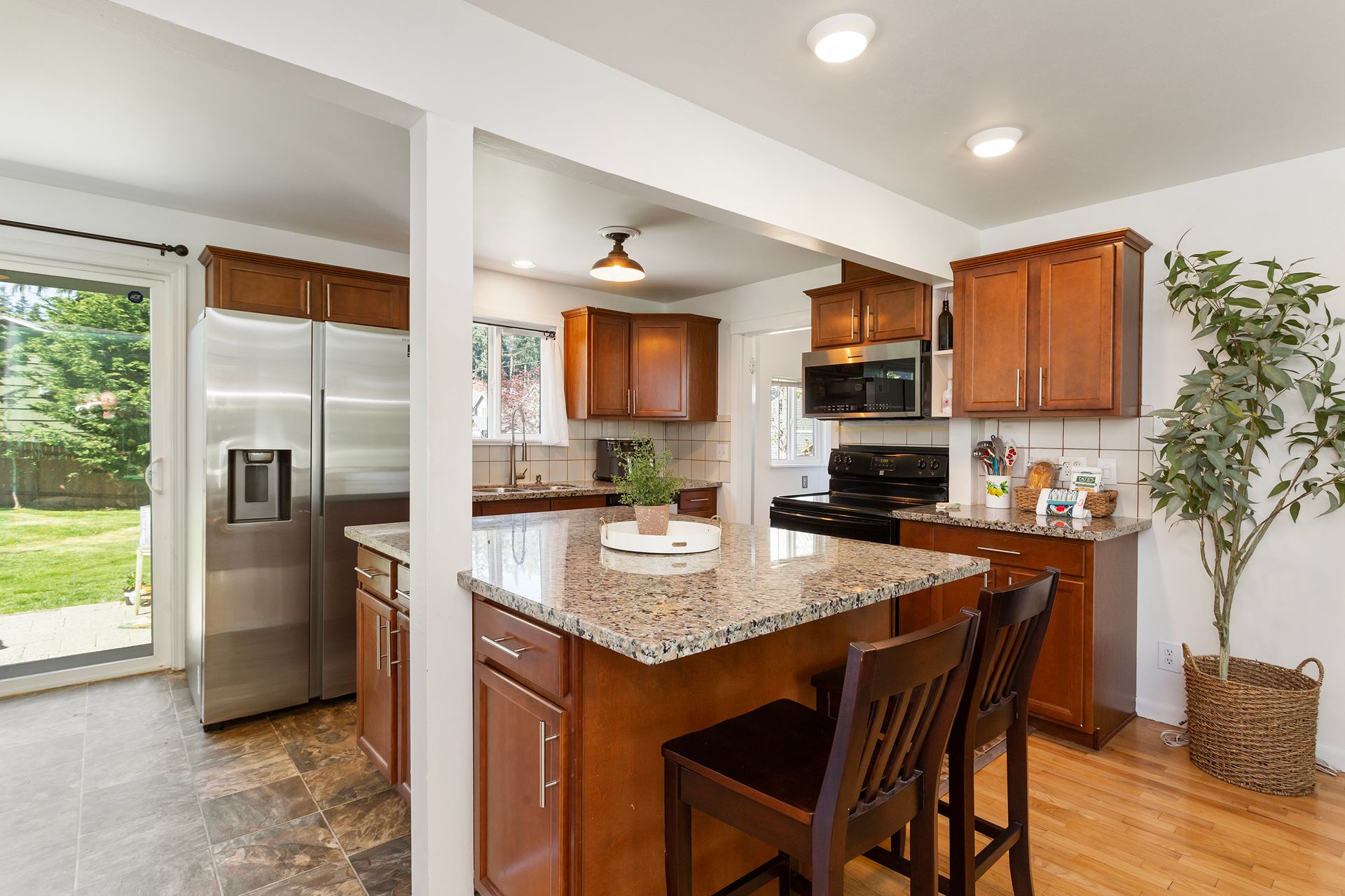 Great room with large kitchen, slab granite island and SS/Blk appliances and includes Living room with cozy wood burning Fireplace. Home features updated plumbing, counters, vinyl windows, doors, interior and exterior paint.