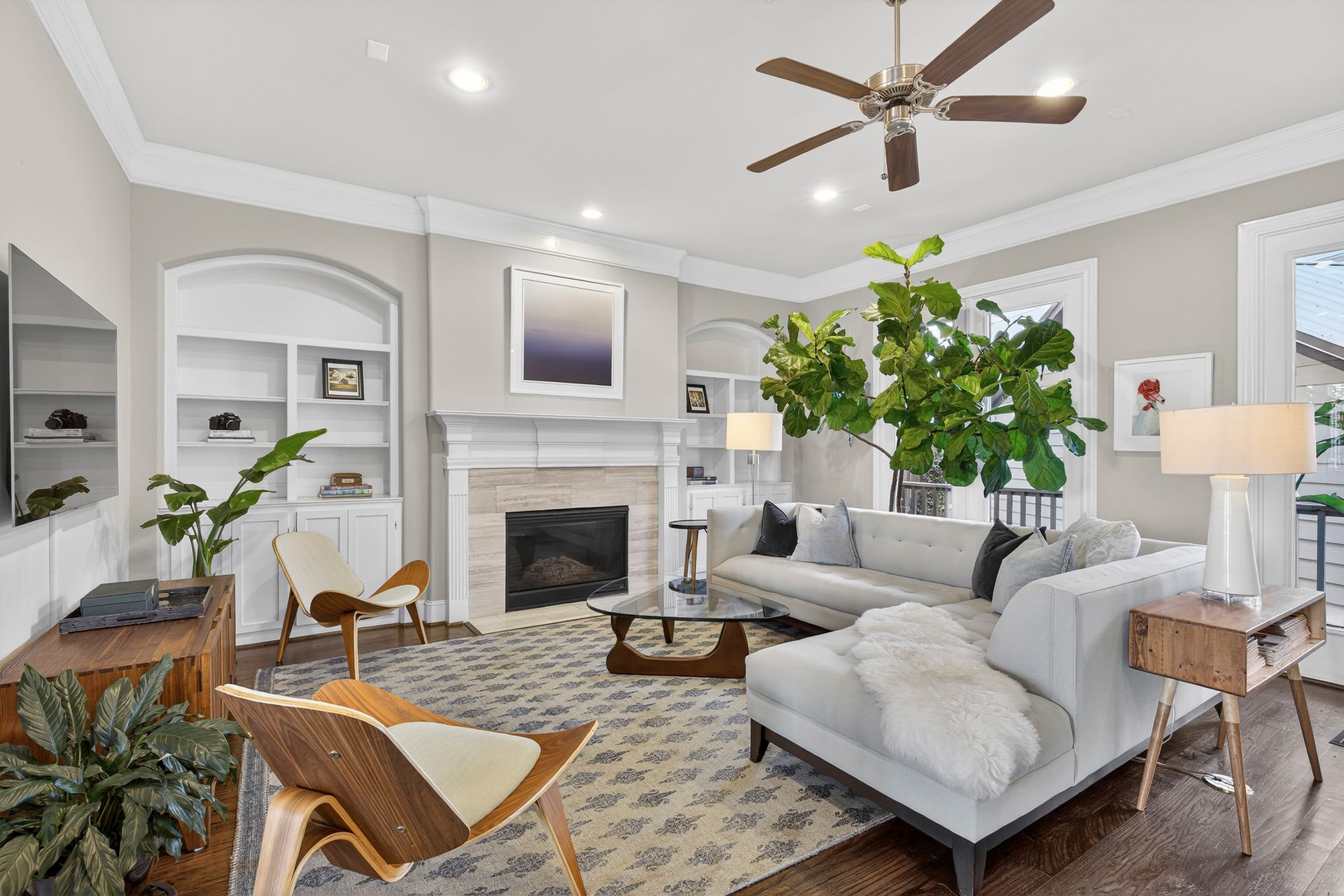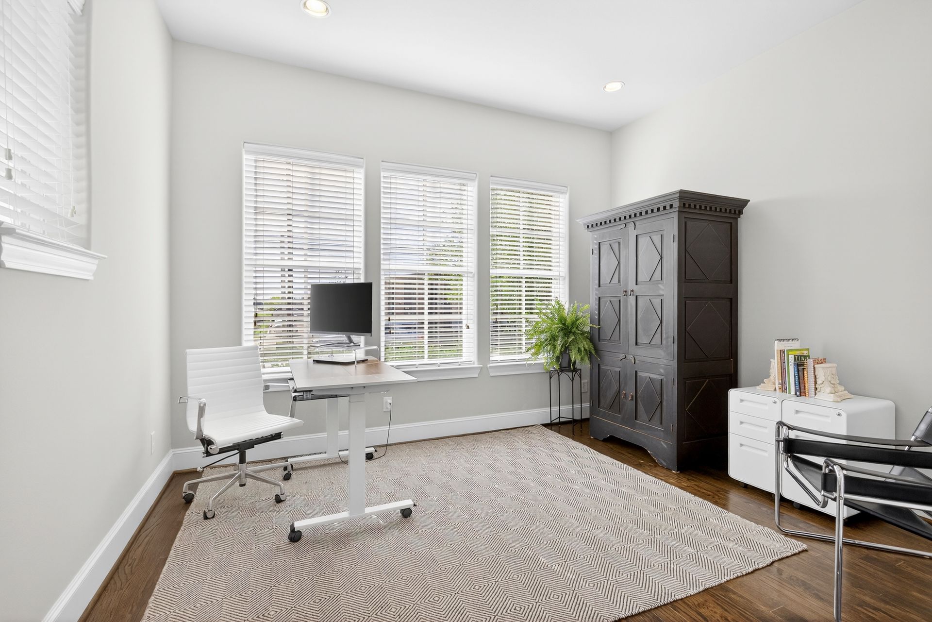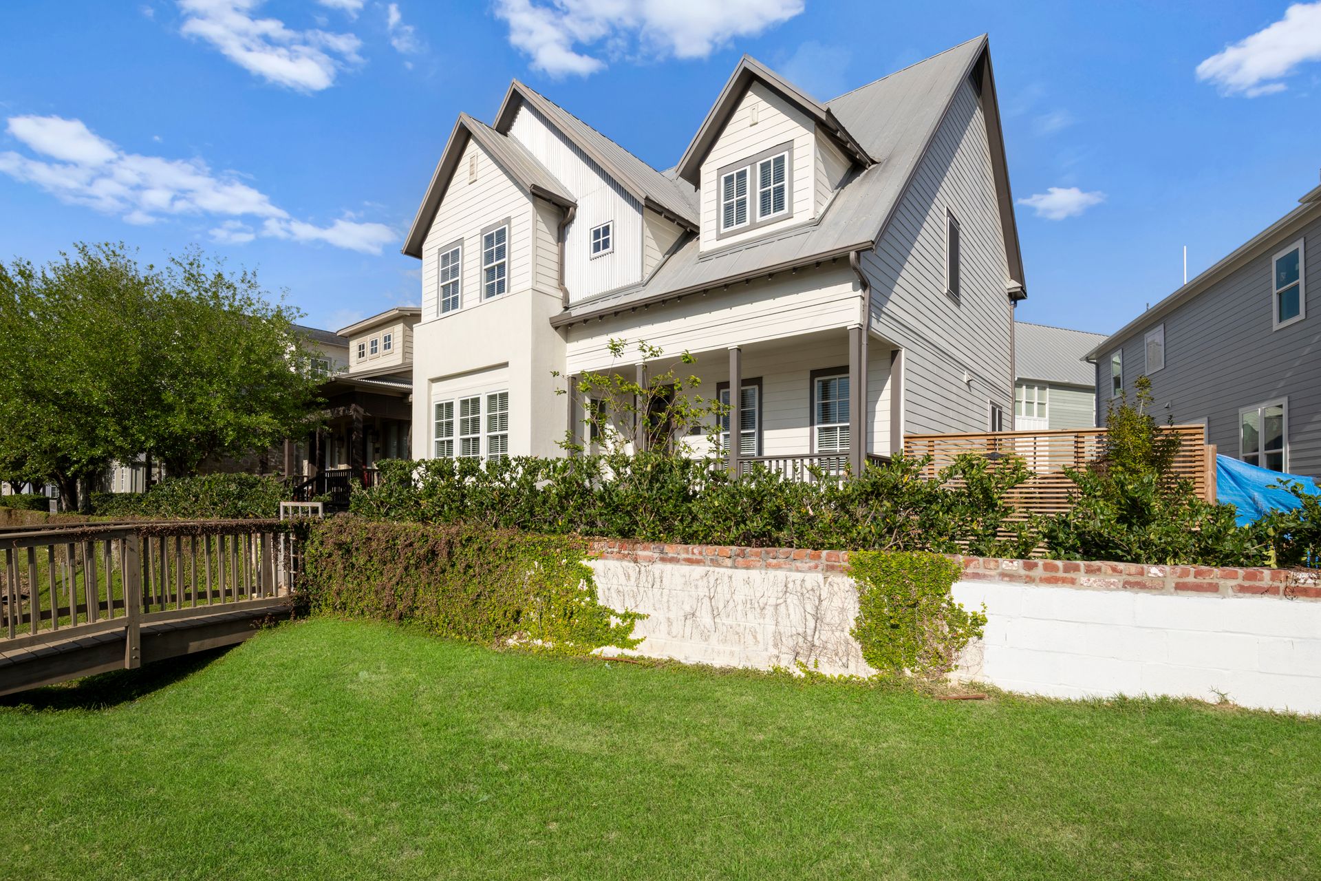 This home offers approximately 2,645 square feet of living space with three bedrooms, two and a half bathrooms, and a downstairs study. The charming exterior features lush landscaping, a front porch, and an inviting entryway that leads into the spacious, light-filled interior.