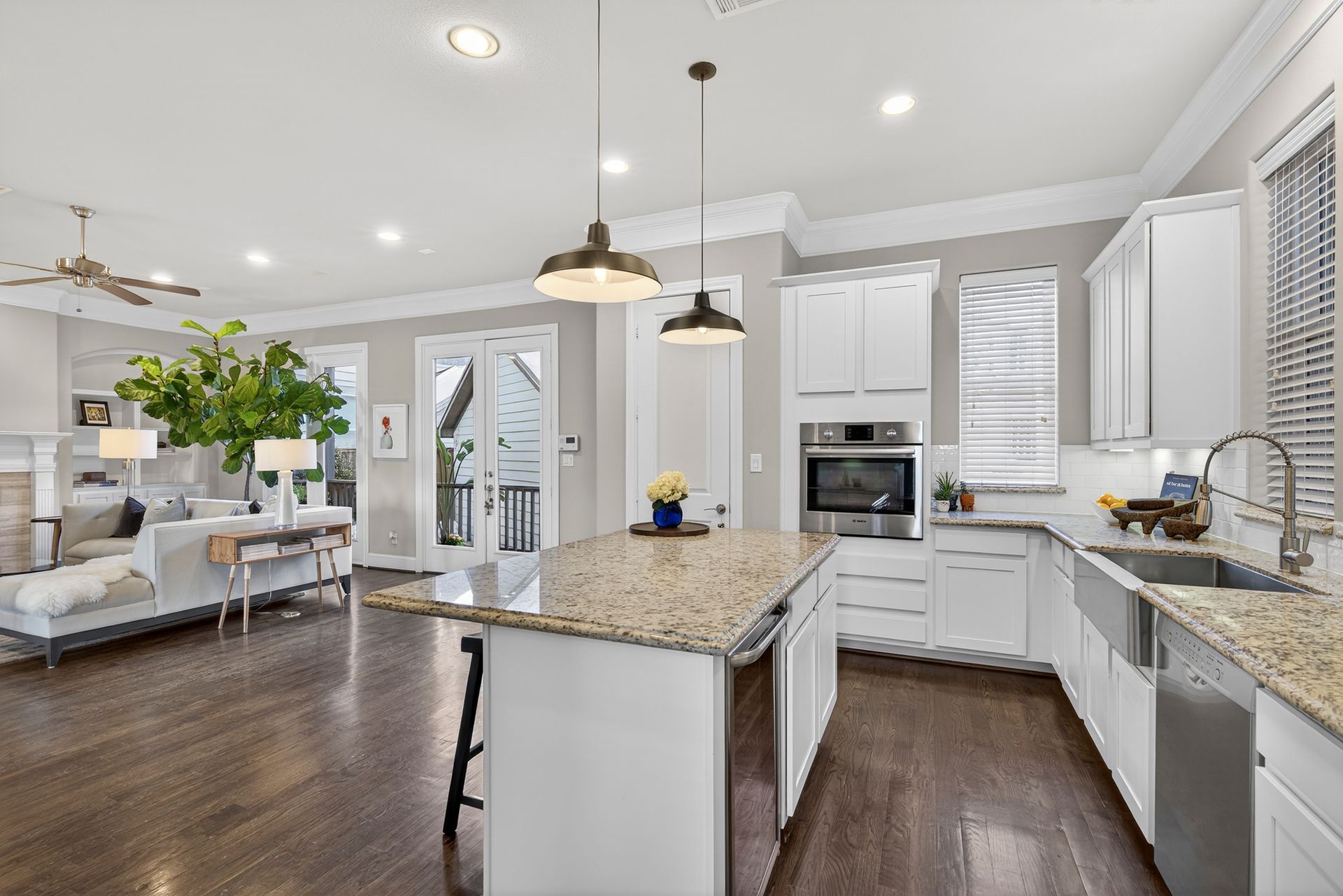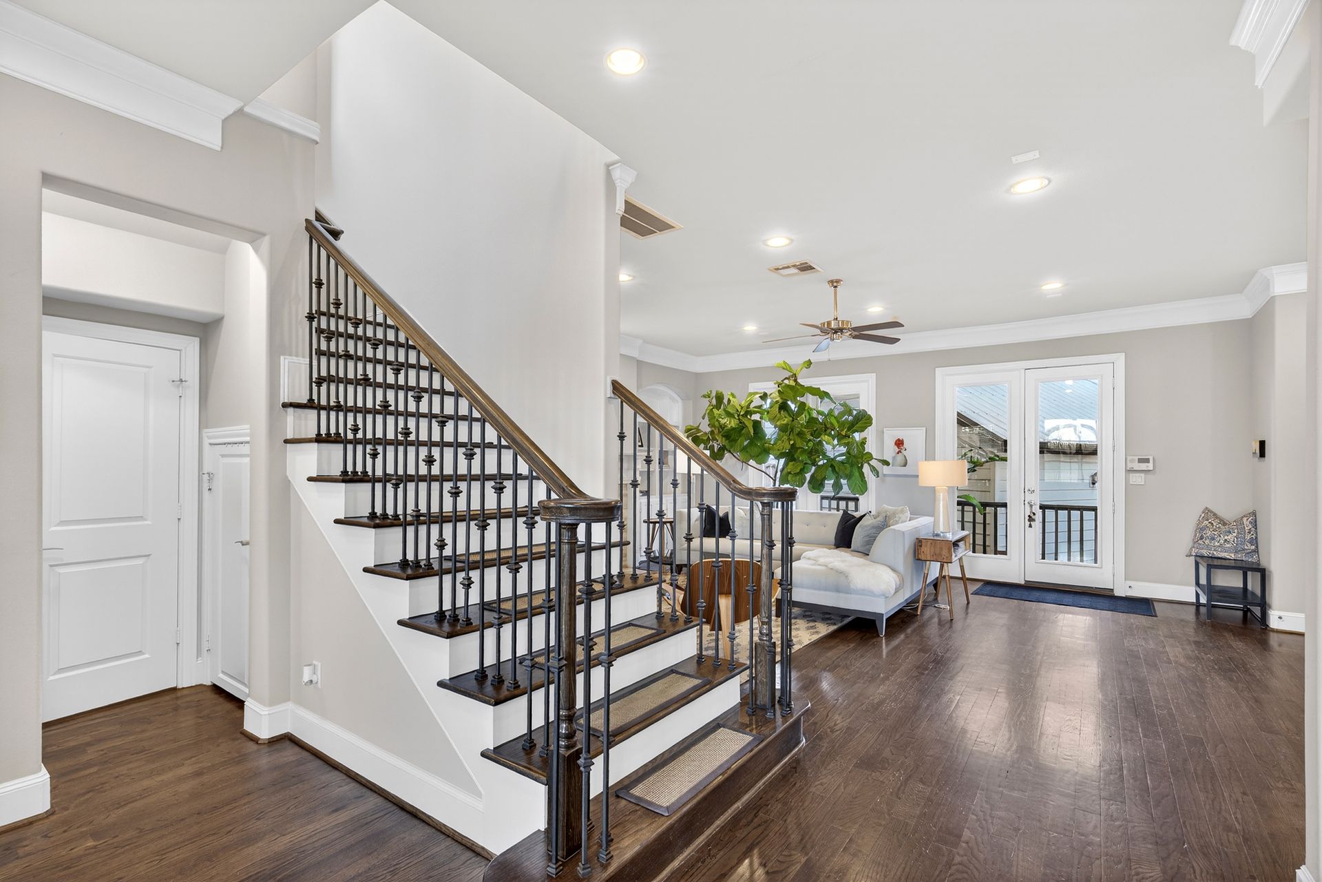 The main level showcases hardwood flooring throughout and an open layout with a spacious dining area. The kitchen is equipped with modern appliances and ample cabinetry, providing abundant storage and preparation space. A fireplace feature adds a cozy ambiance to the living area, which boasts abundant natural light.