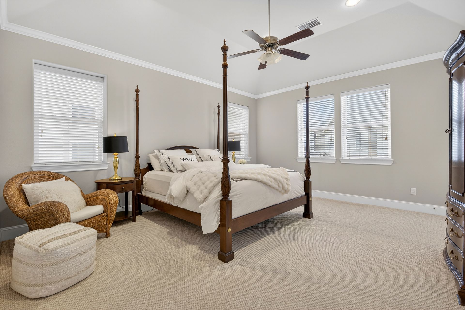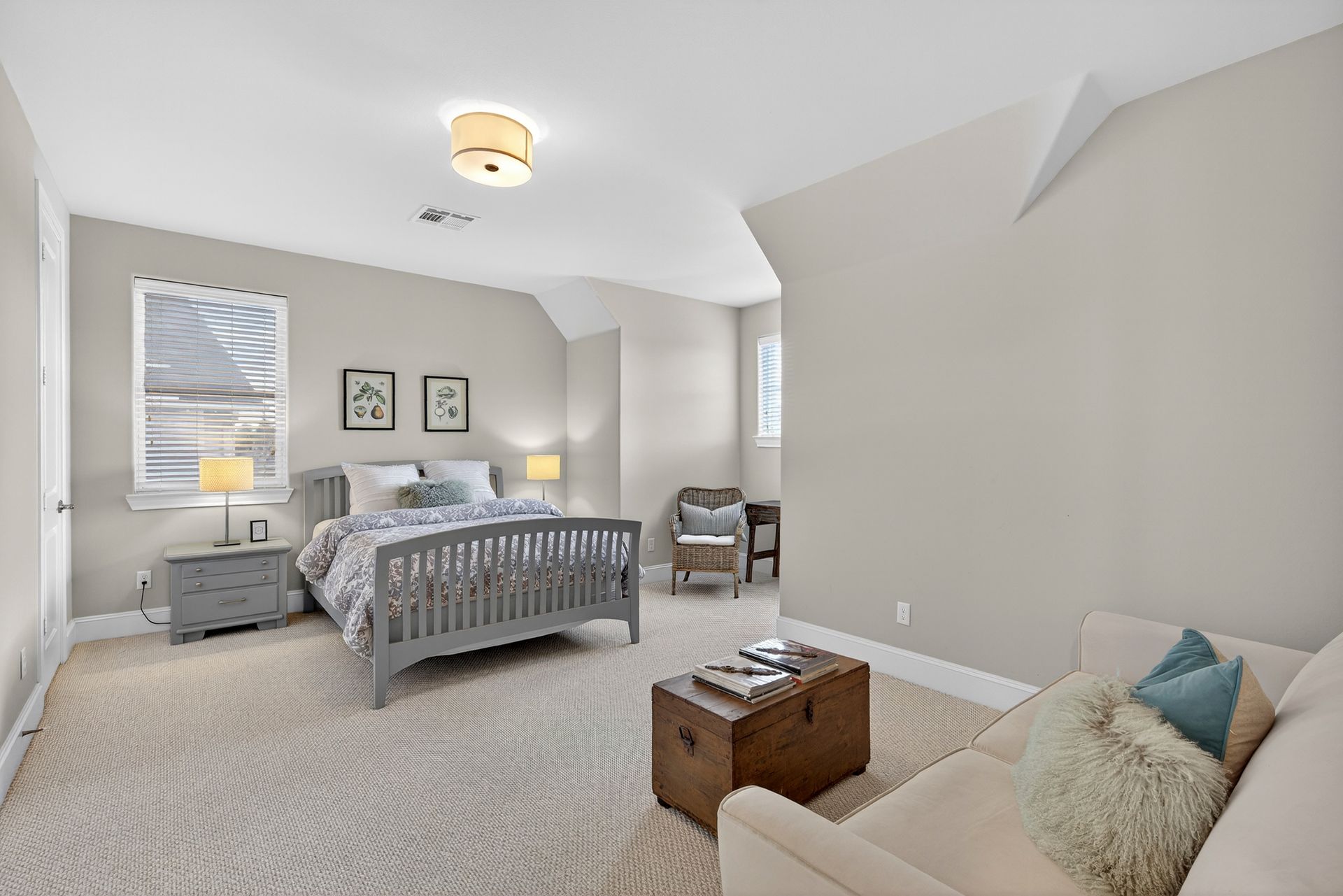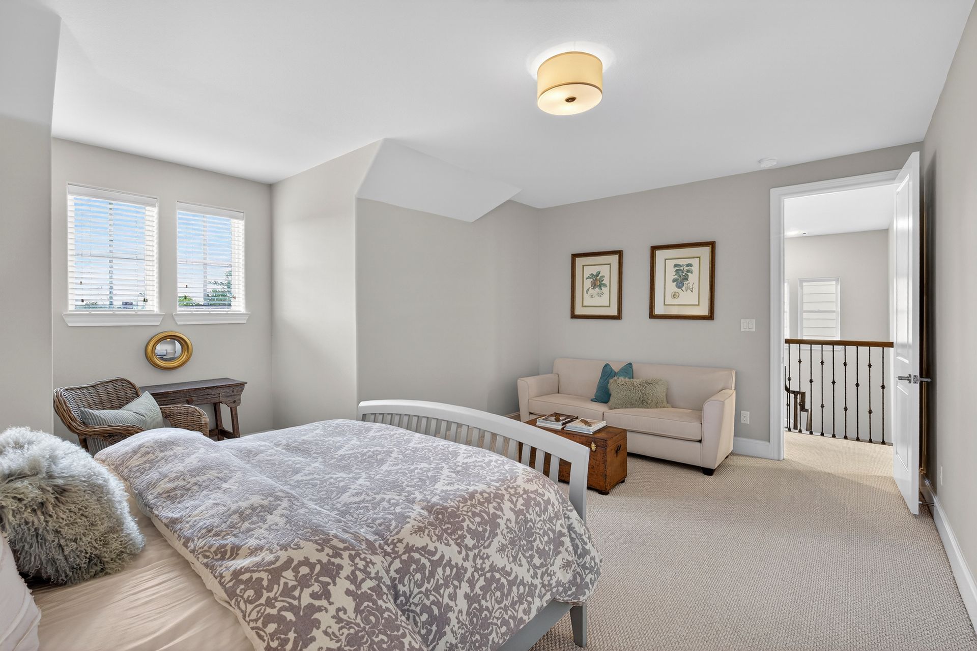 Upstairs, the primary bedroom suite features a balcony overlooking the lush garden. The neutral color palette and elegant architectural details create a serene and sophisticated atmosphere. The additional bedrooms offer ample space and privacy.