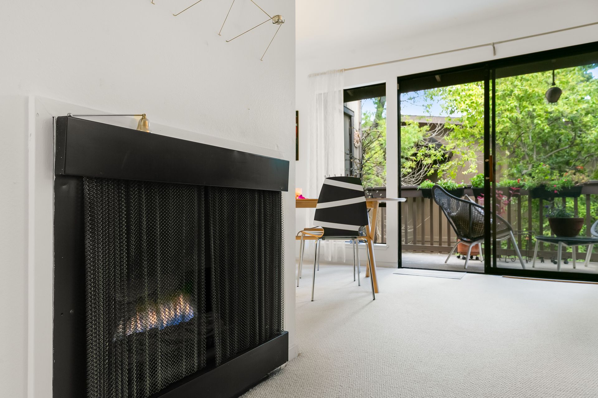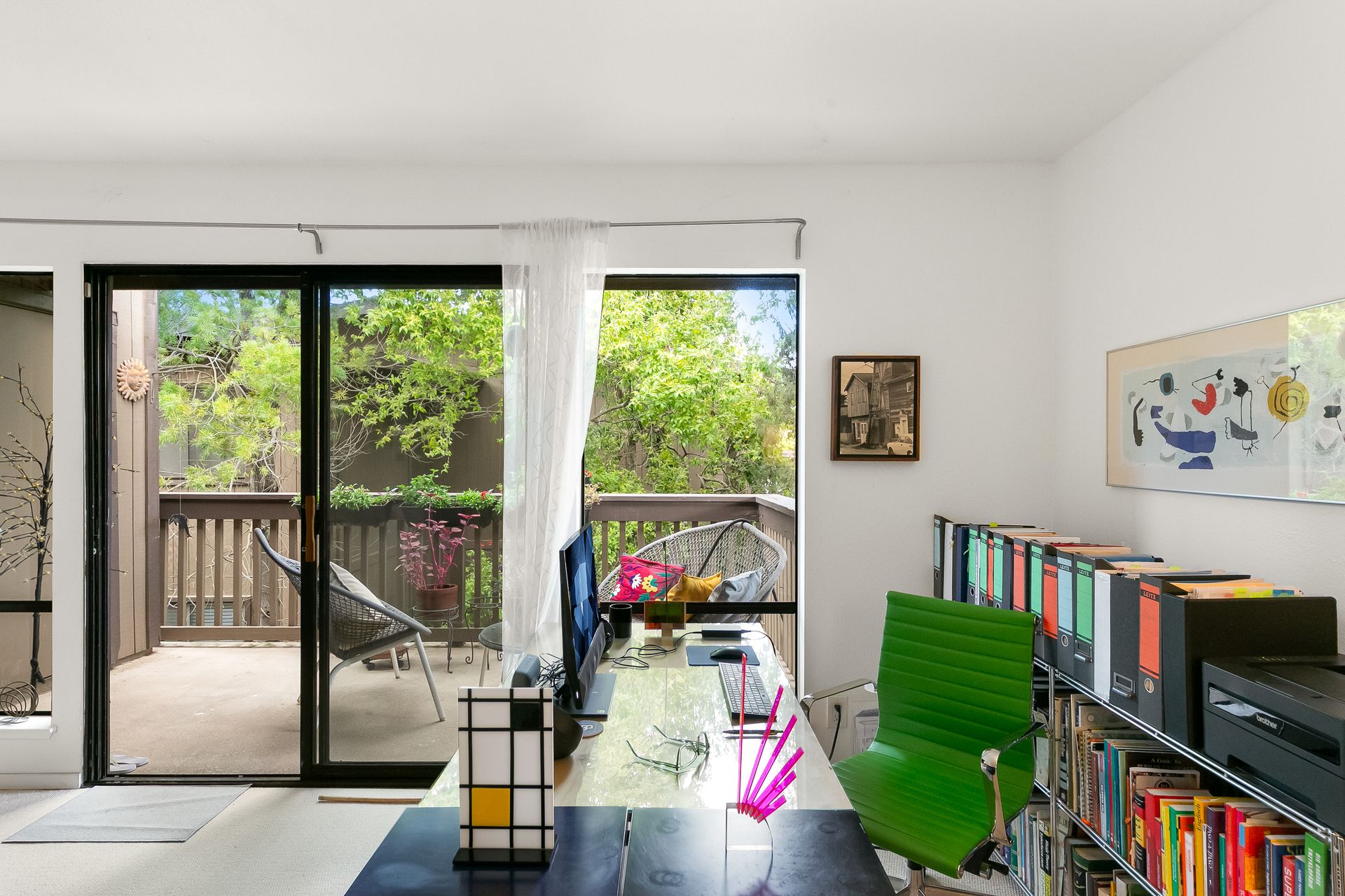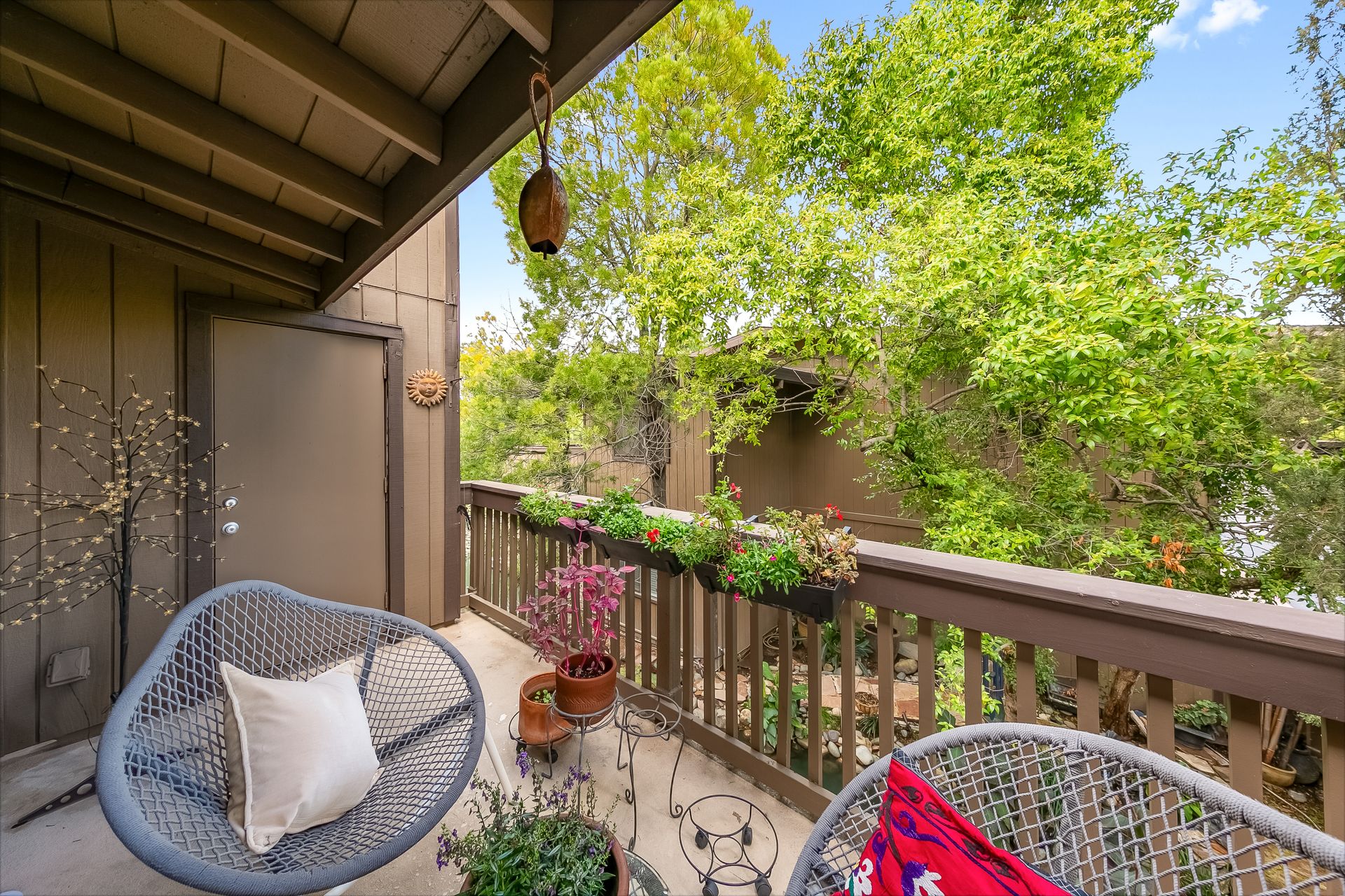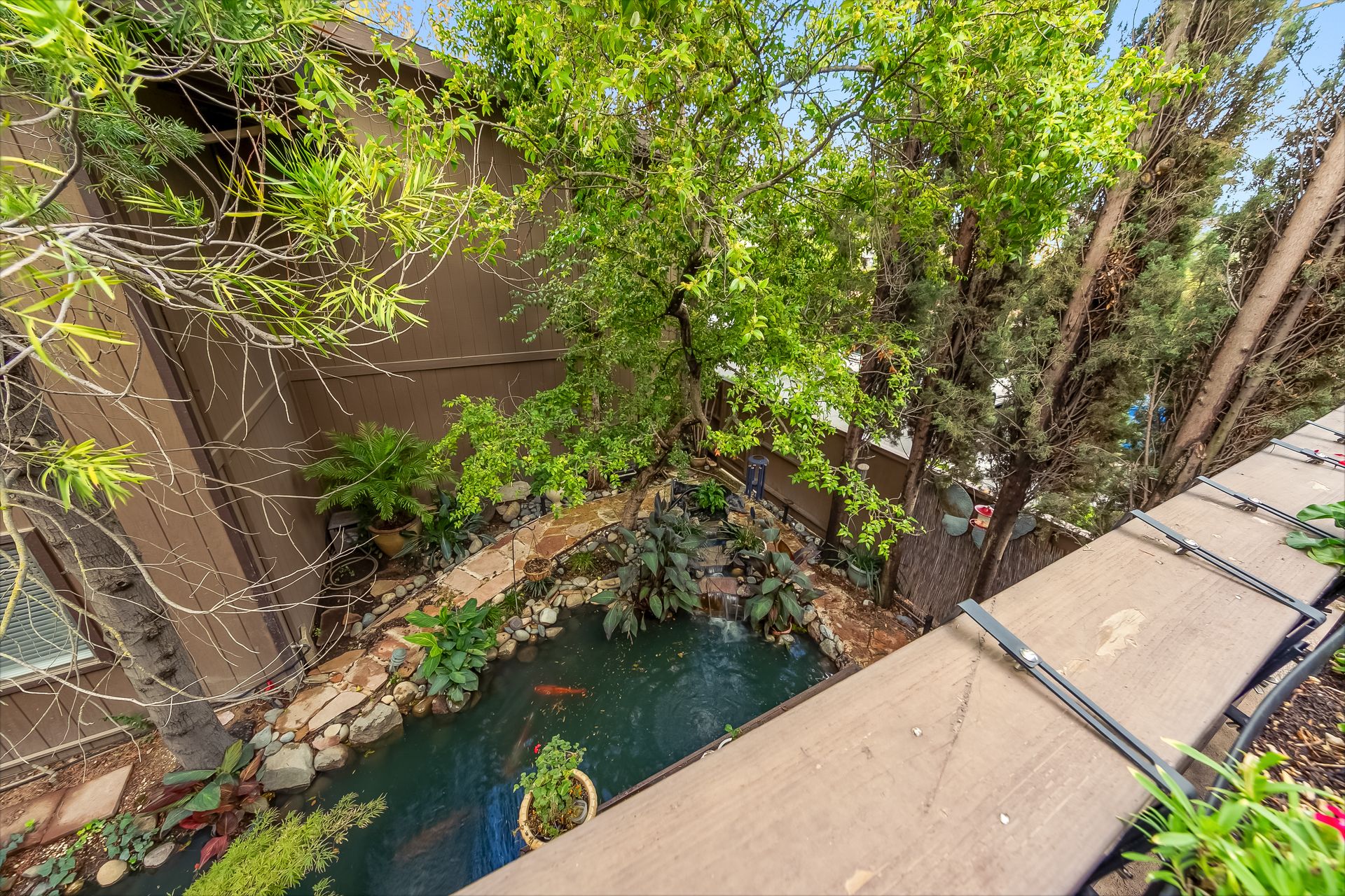 Experience a seamless blend of interior and exterior areas with a large window/sliding door, leading to a generous deck and a storage room. Enjoy listening to the waterfall, beautiful landscaping, and wildlife (koi, turtles, ducks).