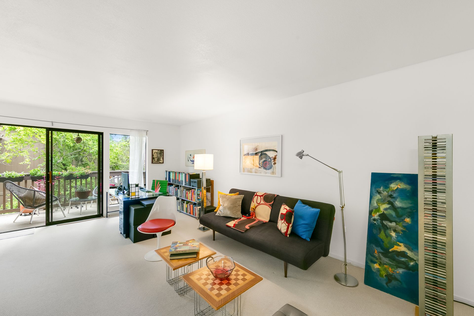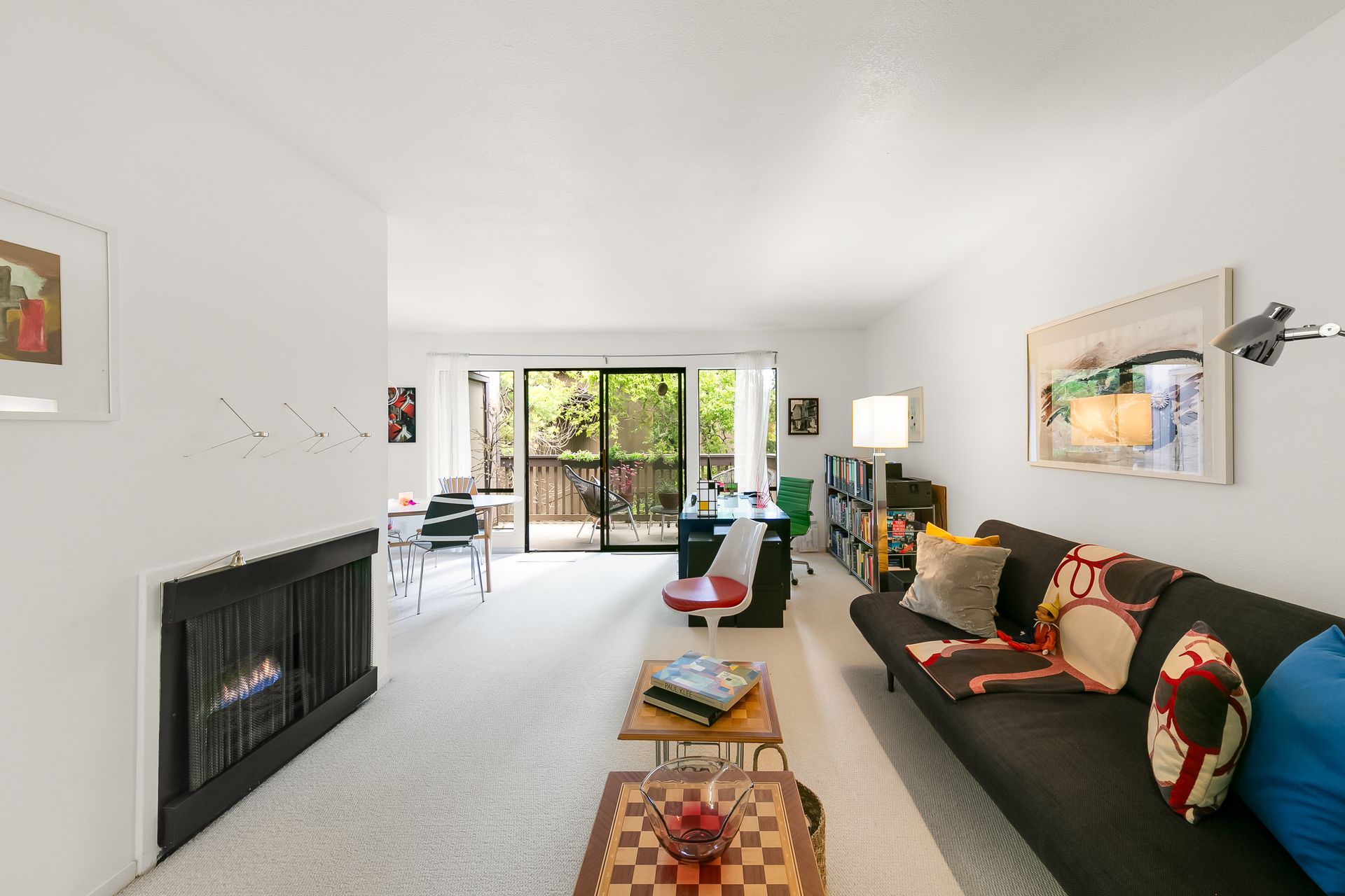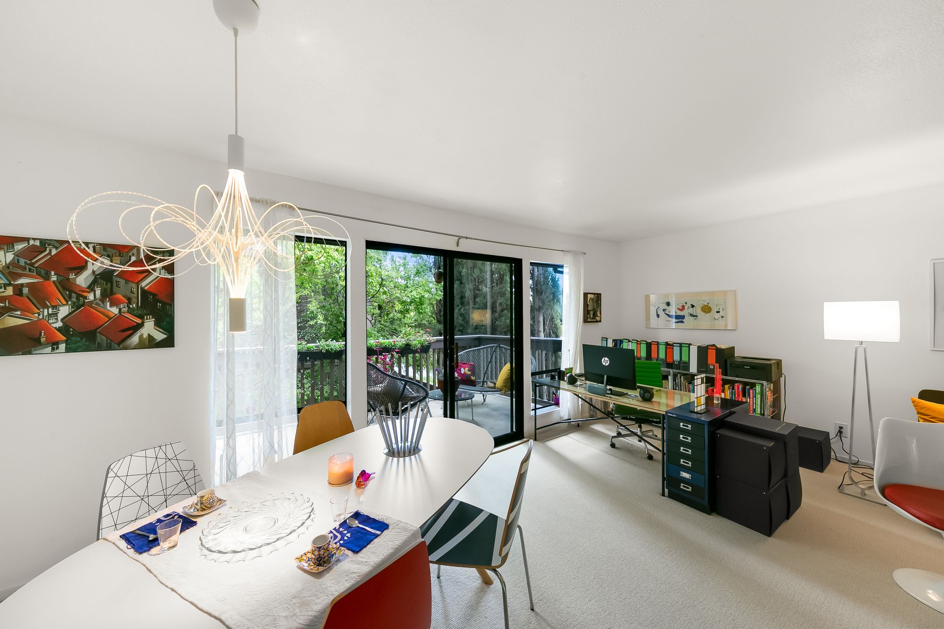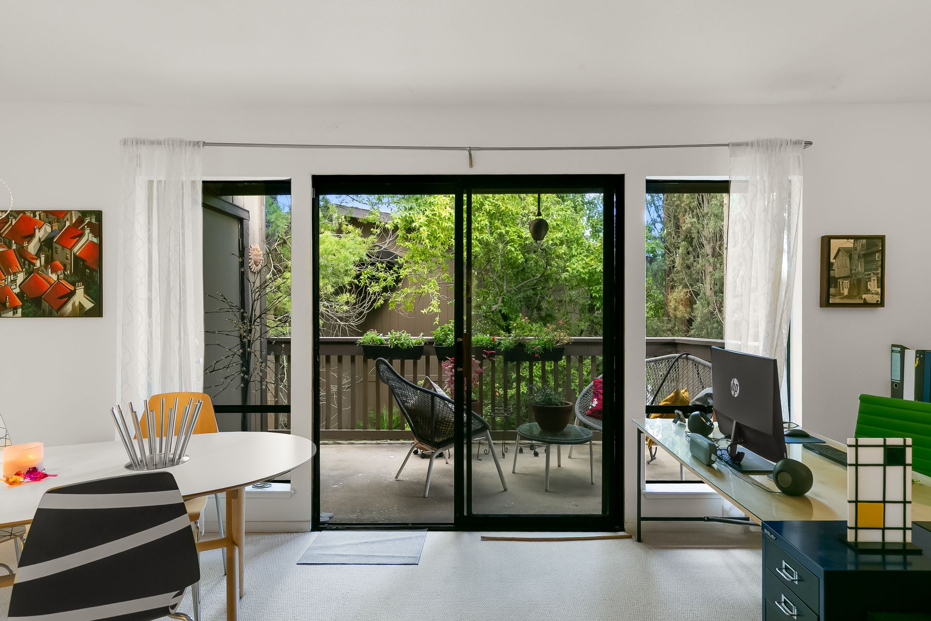 Experience a seamless blend of interior and exterior areas with a large window/sliding door, leading to a generous deck and a storage room. Enjoy listening to the waterfall, beautiful landscaping, and wildlife (koi, turtles, ducks).