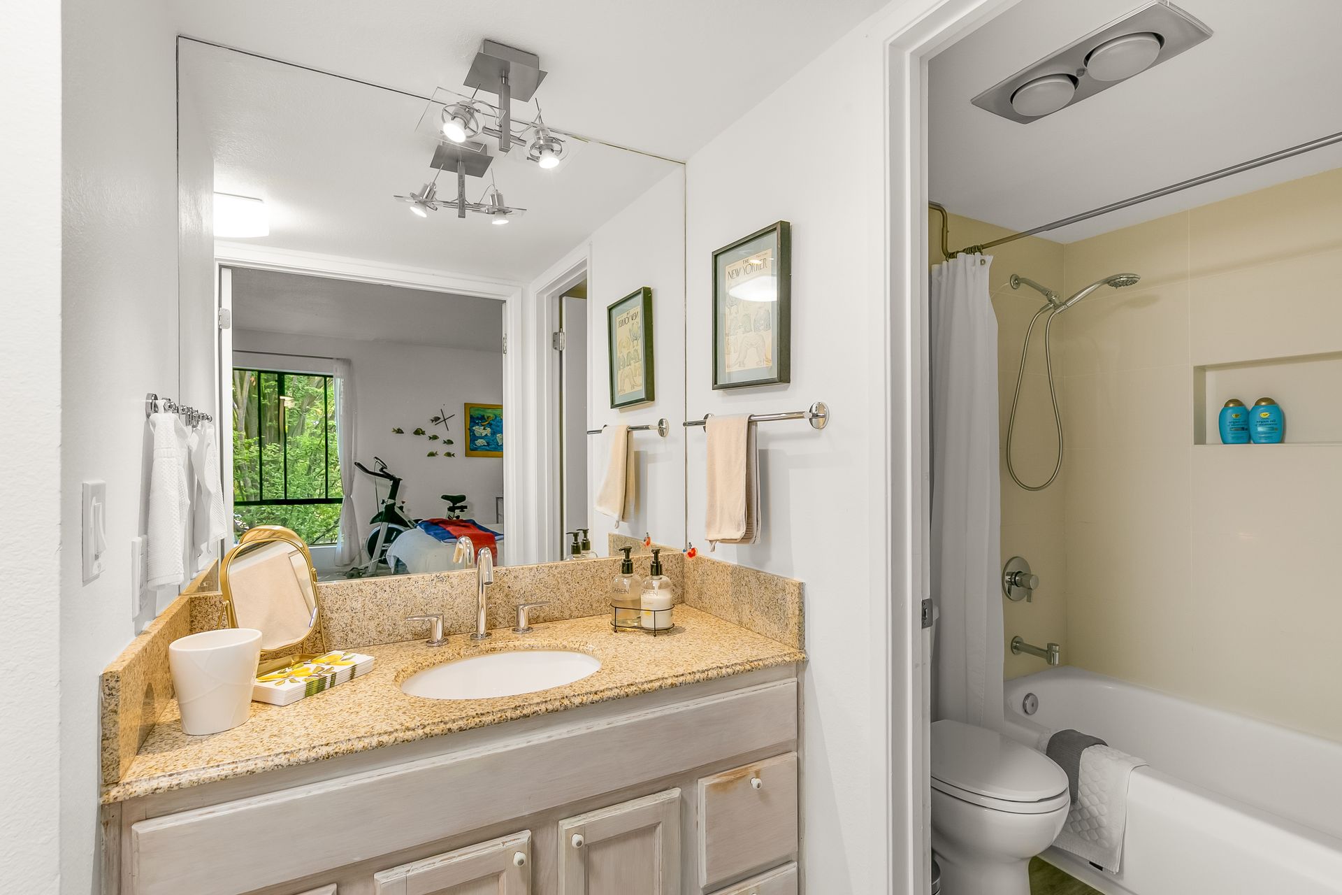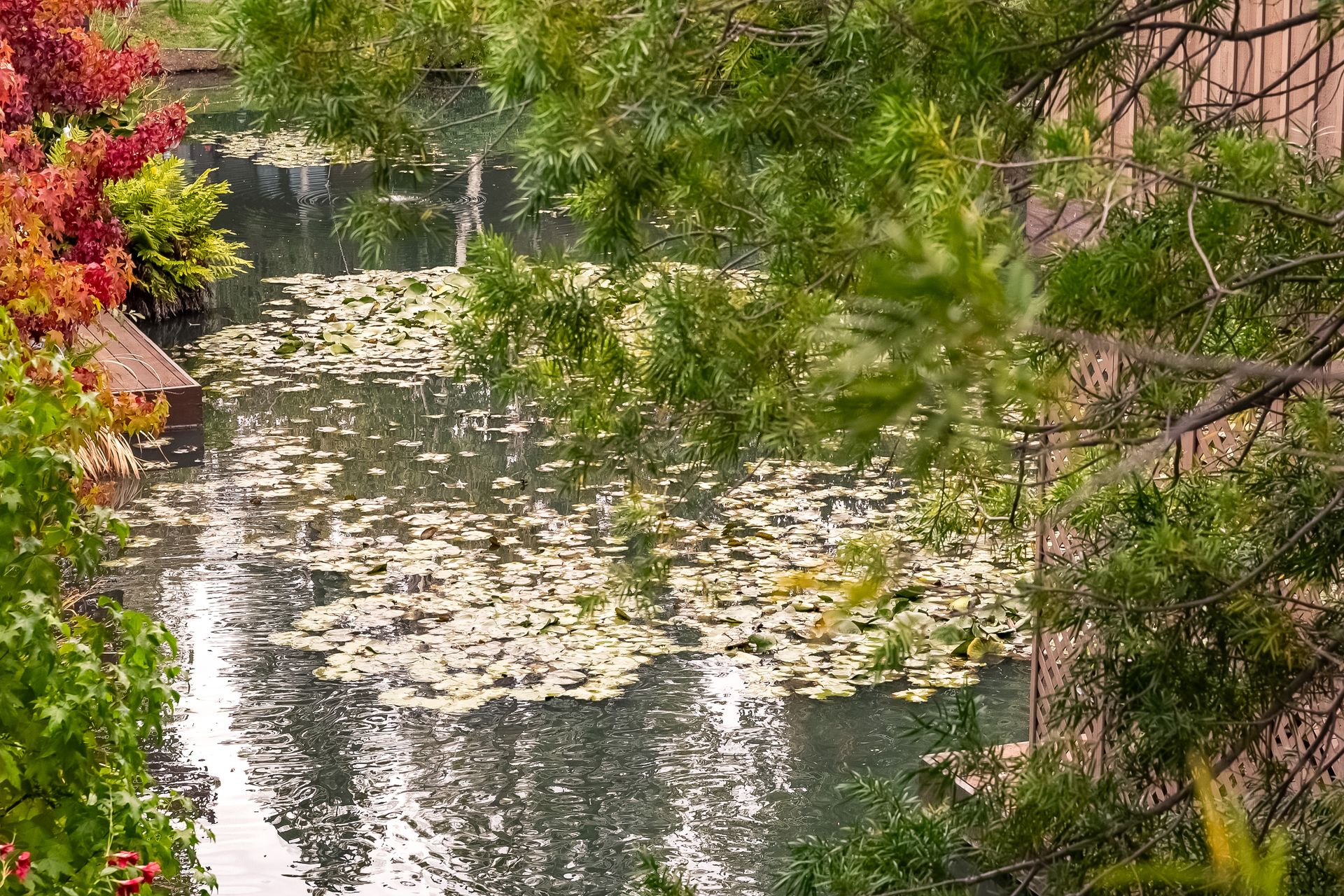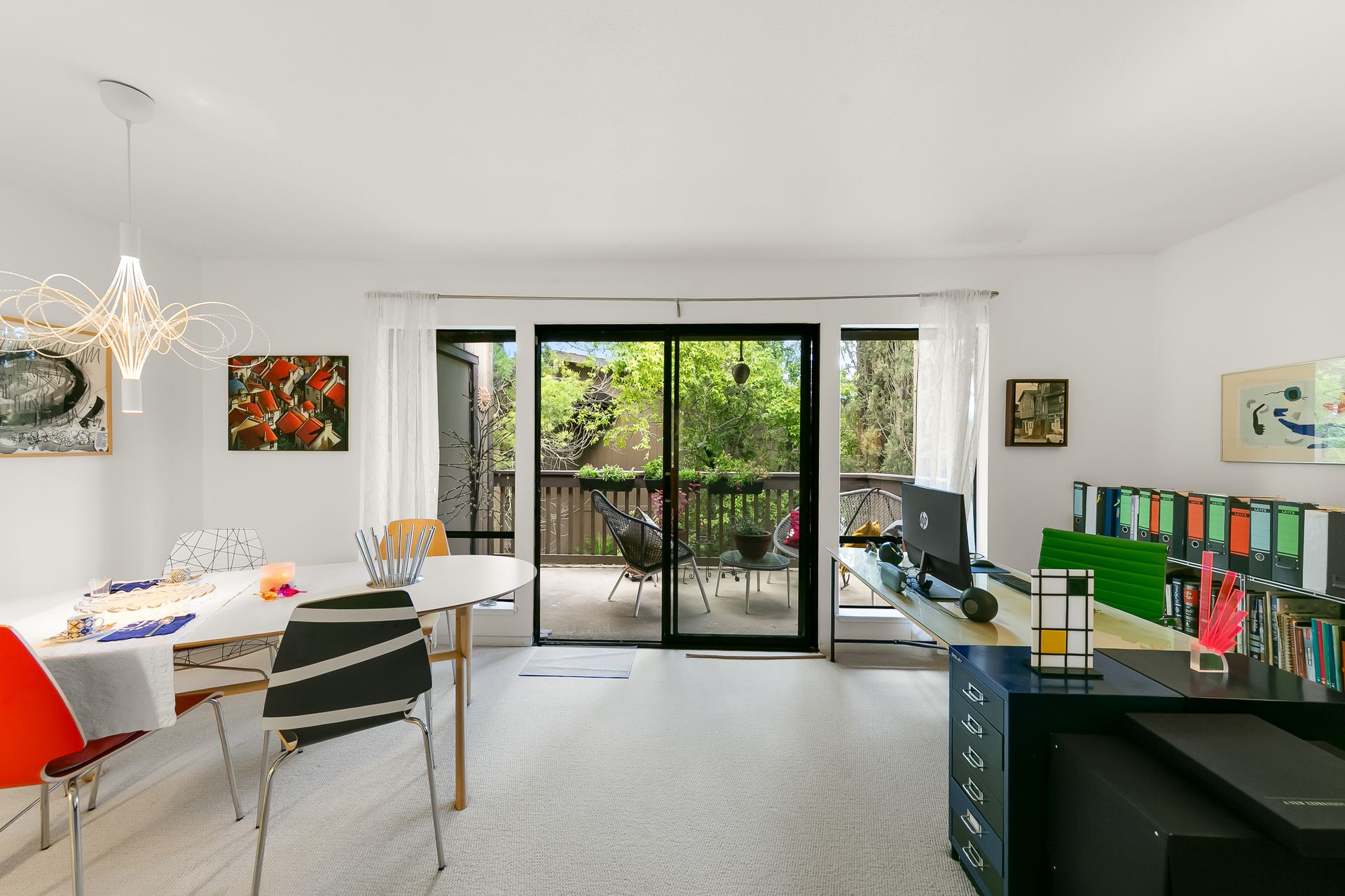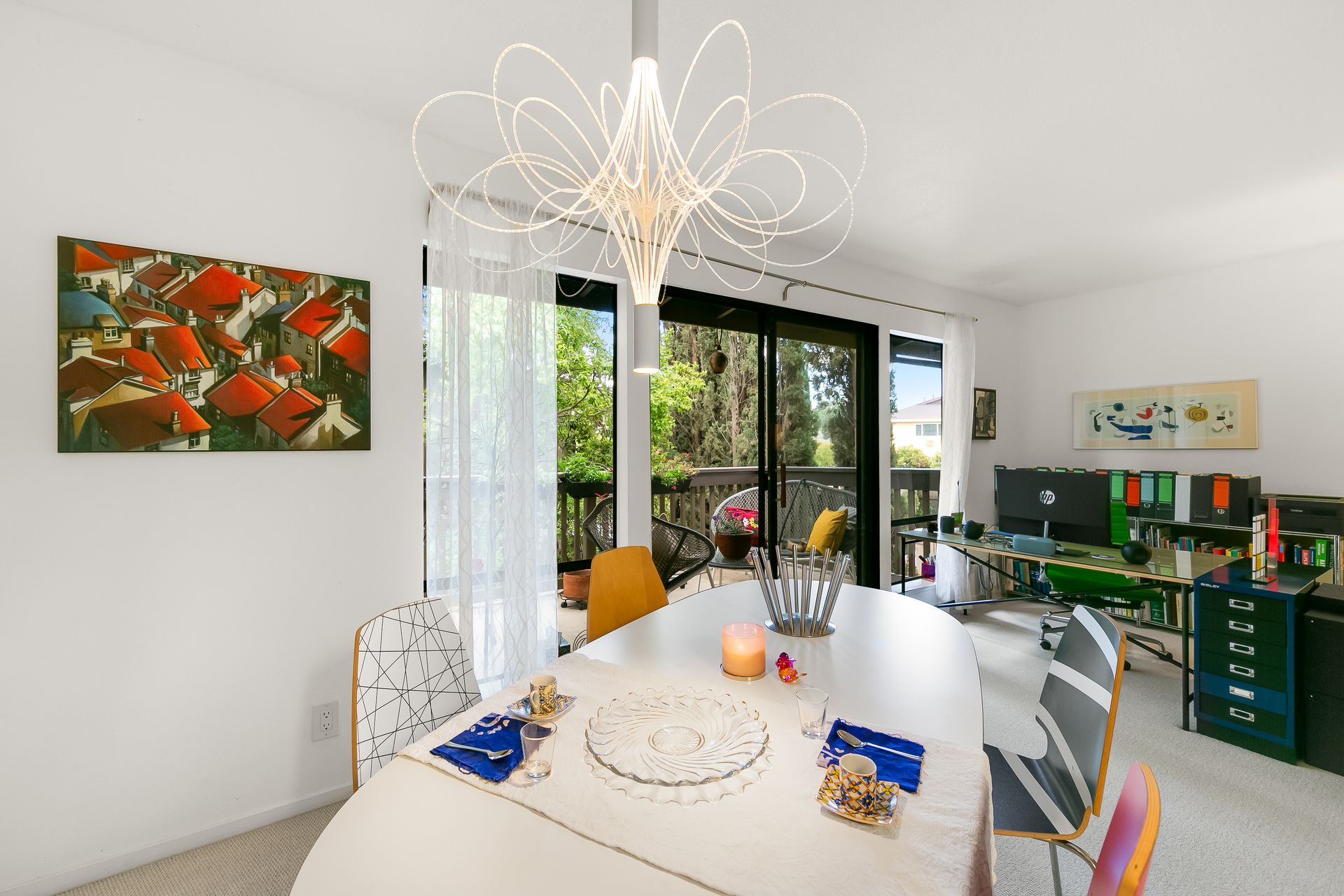 Experience a seamless blend of interior and exterior areas with a large window/sliding door, leading to a generous deck and a storage room. Enjoy listening to the waterfall, beautiful landscaping, and wildlife (koi, turtles, ducks).