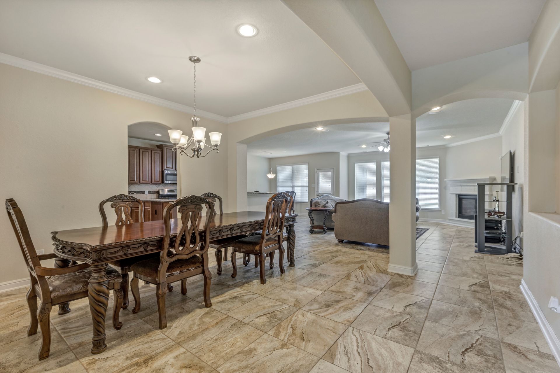 The elegant dining area is perfect for hosting gatherings, complementing the home's luxurious flooring and crown molding details.