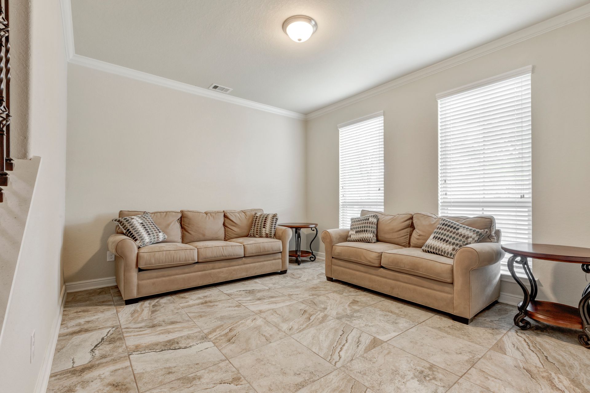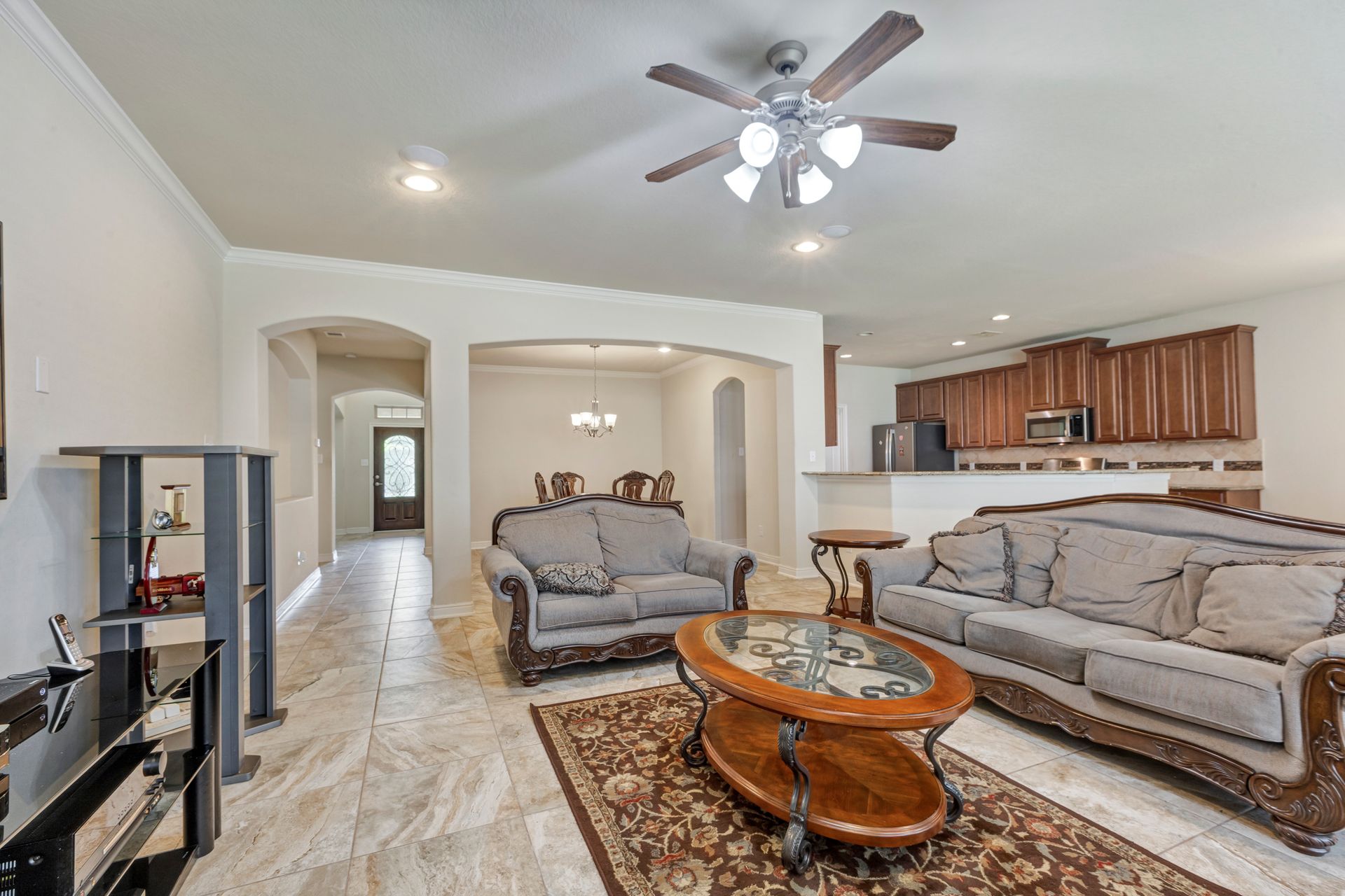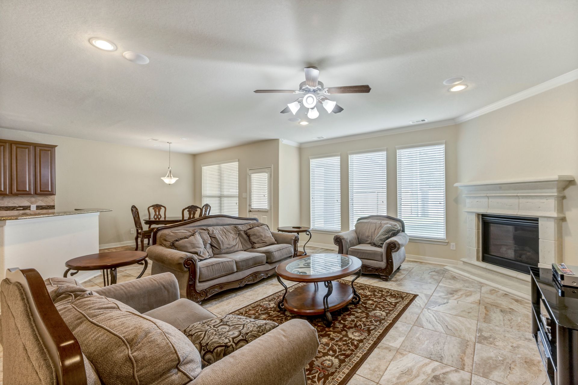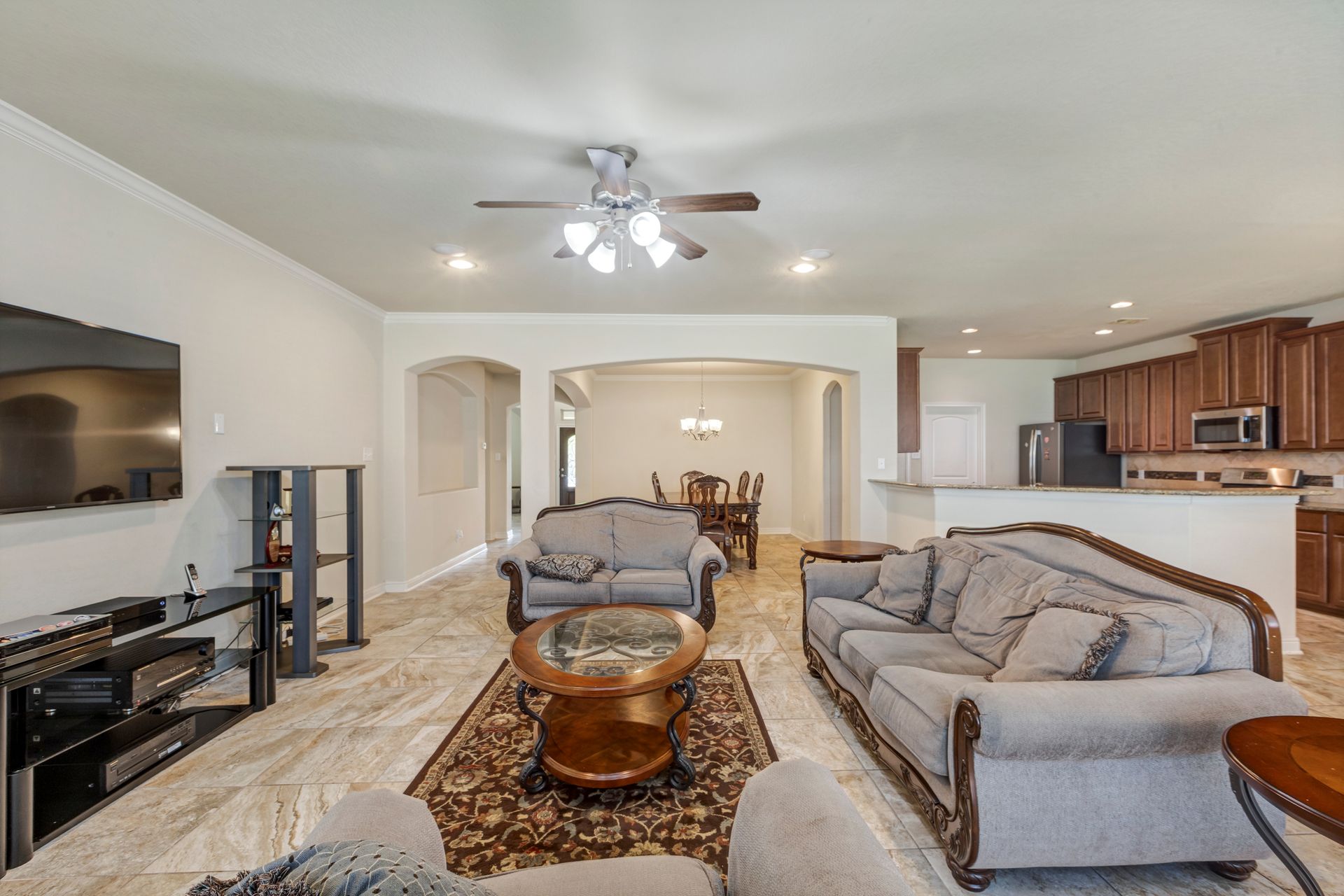 The primary living space centers around a magnificent fireplace, offering a cozy and inviting atmosphere. The large tile flooring and arched entryways add a touch of sophistication to the open concept. Ceiling fans provide efficient air circulation, while the neutral tones and ample lighting create a warm and comfortable ambiance.