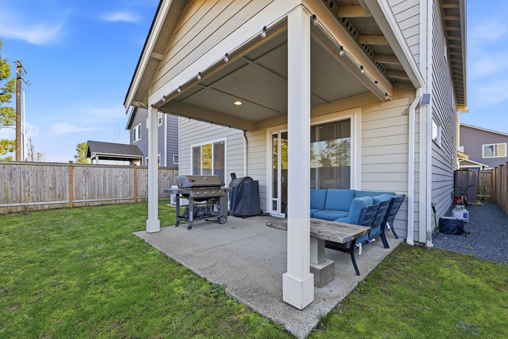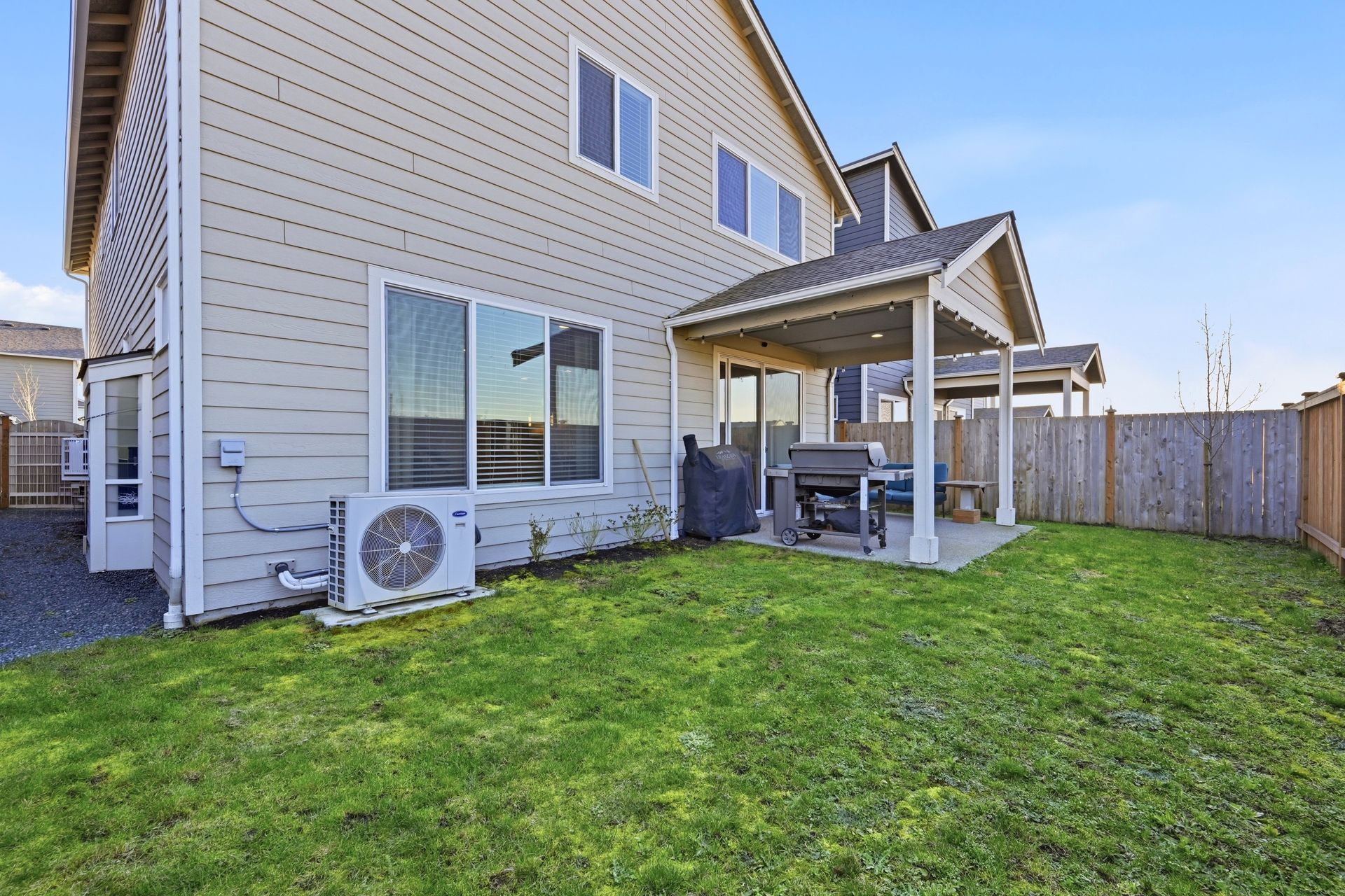 This home is better than new construction, offering high‑quality window coverings and elevated finishes including white cabinetry, stainless steel appliances, quartz countertops, HE hot water tank, Deako smart switches, and a heat pump providing A/C. Exterior features include full landscaping and a fully fenced backyard.