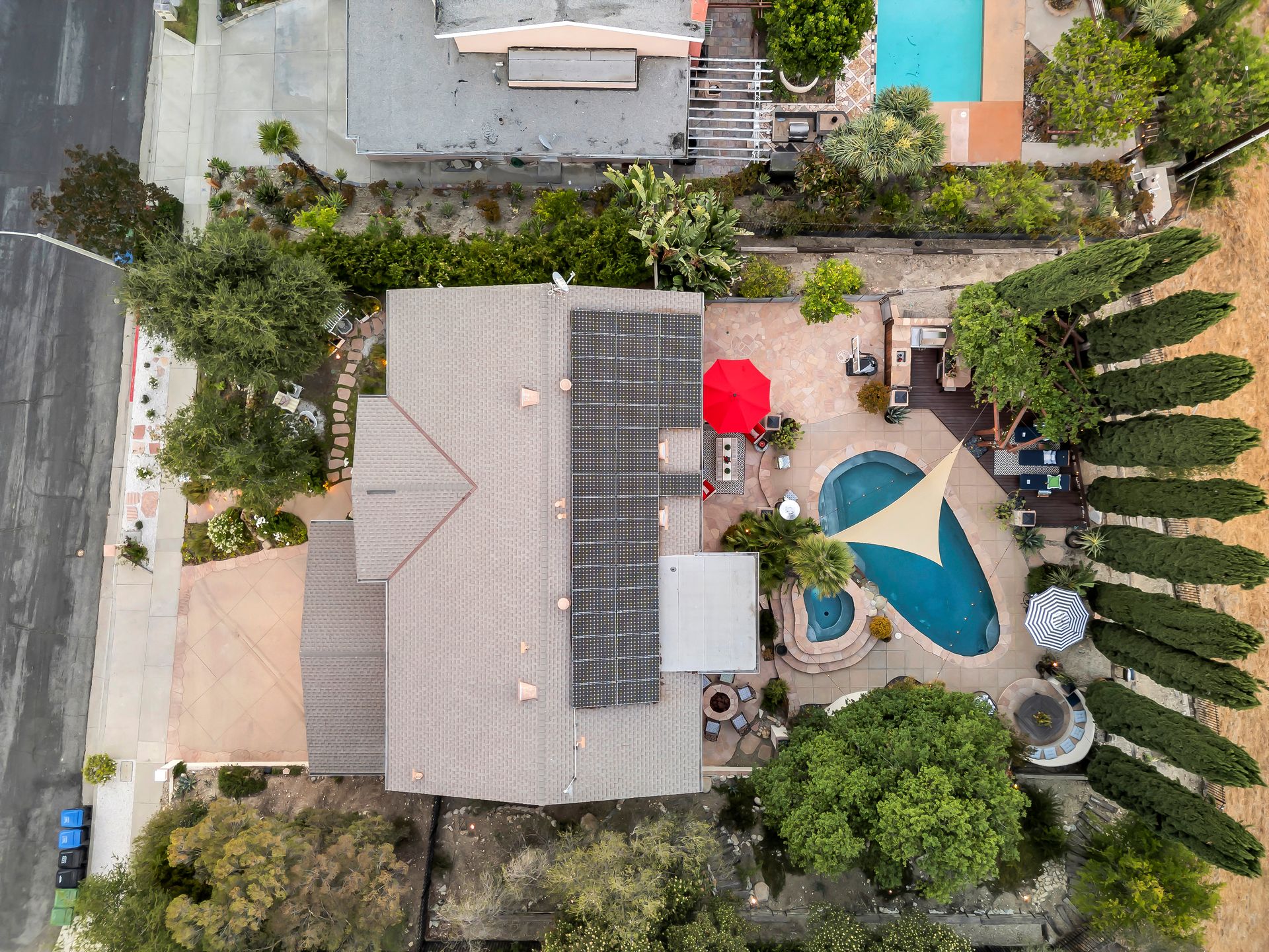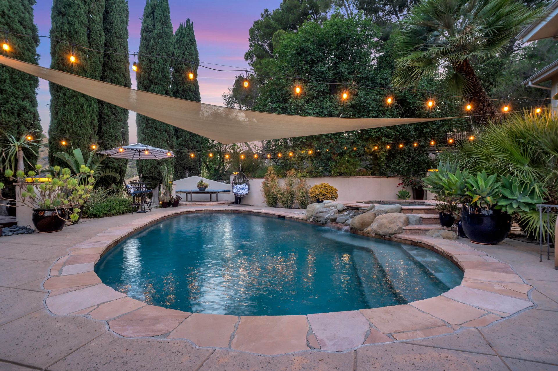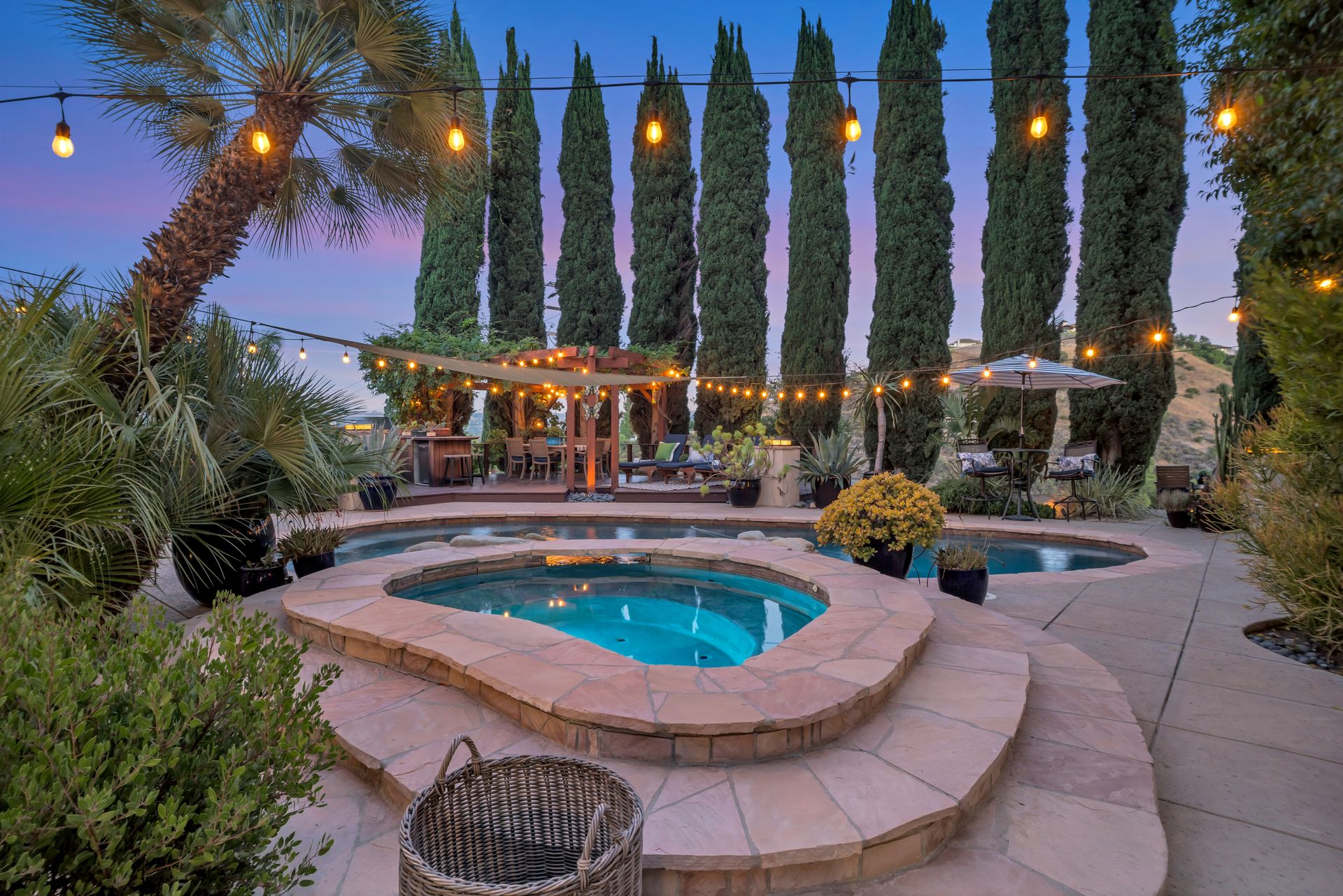 Tucked away at the top of a peaceful cul-de-sac and within the coveted Las Virgenes School district is West Hills’ highly sought-after Knapp Ranch community. This beautifully updated five-bedroom, three-bathroom home, offers the ideal balance of style, space and serenity. With approximately 3,116 square feet of living space on a generous approximately one-quarter-acre lot, this residence is thoughtfully designed for both relaxed everyday living and effortless entertaining. At the heart of the home is a magazine-worthy chef’s kitchen, showcasing a custom island, elegant Quartzite countertops, stainless steel appliances and a built-in bar—great for gathering with guests. The open floor plan flows seamlessly into light-filled dining and living areas, creating a spacious and inviting atmosphere throughout. Upstairs, you'll find four spacious bedrooms, including a luxurious primary suite complete with a private sunroom and sweeping views of the Valley. A convenient en-suite bedroom is located downstairs—ideal for guests or a home office. Smart, dual-zoned Nest thermostats provide energy saving comfort to any level of living space. Head outside and escape to your own resort-style backyard featuring a sparkling pool and spa, built-in outdoor kitchen and expansive decking with gorgeous views of the Valley. With only one neighboring home on the west side, newer ultra-quiet Chamberlain garage doors and a whole-house Ring system in place, the exterior space offers exceptional privacy, peace and safety. Additional highlights include: a three car garage wired for electric vehicle charging, paid-off solar, Las Virgenes daily pickup/drop-off, plus close proximity to trails, shopping and Knapp Ranch Park. Come view this property and experience a true community in the heart of West Hills!