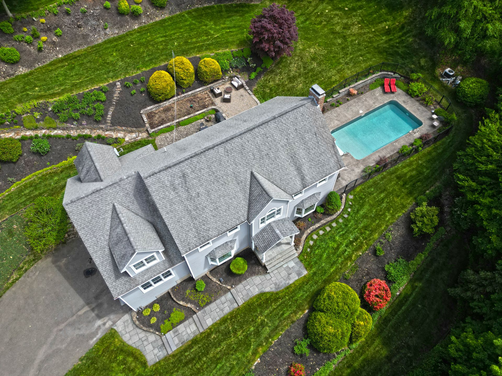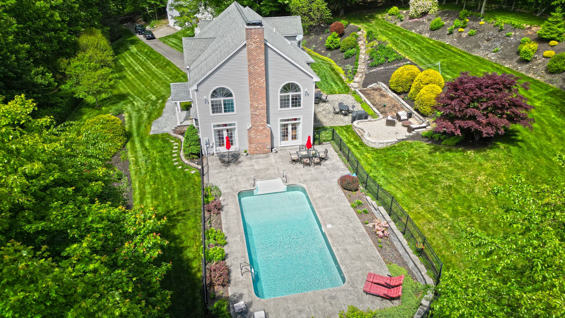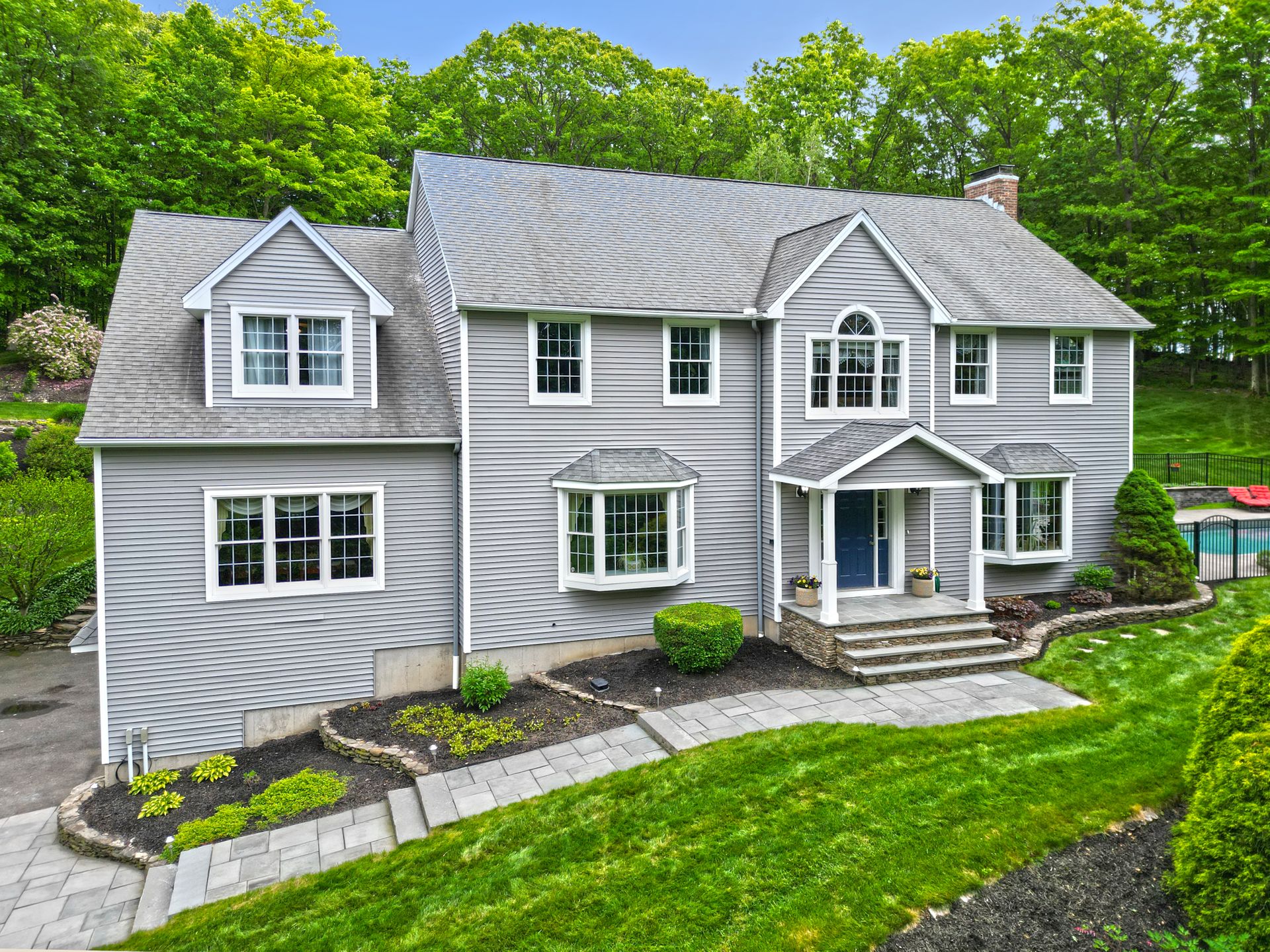 Private Northeast Bethany oasis! Quality craftsmanship throughout gracious property with approximately 4 acres, professionally landscaped lawn, woodland trail up on ridge. Lovely terrace and heated saltwater pool bring the expansive outdoors inside. Great flex and flow on main level. Enjoy cozy evenings by stunning floor-to-ceiling stone fireplace in Great Room, gatherings in Formal Dining Room with distinctive tile floor. Sunlight floods house through large windows, cook’s kitchen with Medallion cabinets, pop-up vented electric cook top, double wall ovens, and efficient layout includes eat-in area, den, walk-in pantry. Quietly carpeted upstairs offers primary suite with walk-in closet, full bath with whirlpool, and full walk-up attic access; three more large bedrooms, each with ceiling fans and large closets. Laundry room and second full bathroom complete the hall. Basement offers generous media room with built-ins, game room and workshop, accessed through kitchen and three car garage. Closets galore throughout, hardwood floors in Great Room and note beautiful inlay in front hall. Detached two car garage has attic that could be art studio, guest retreat, or more storage! Convenient to all area commerce, culture, farms, nature trails and Amity school district. Full-house generator, double Roth oil tanks, added efficiency with wood burning furnace as well as the hydro-air system, central air, central vacuum. Come see all that this property offers!