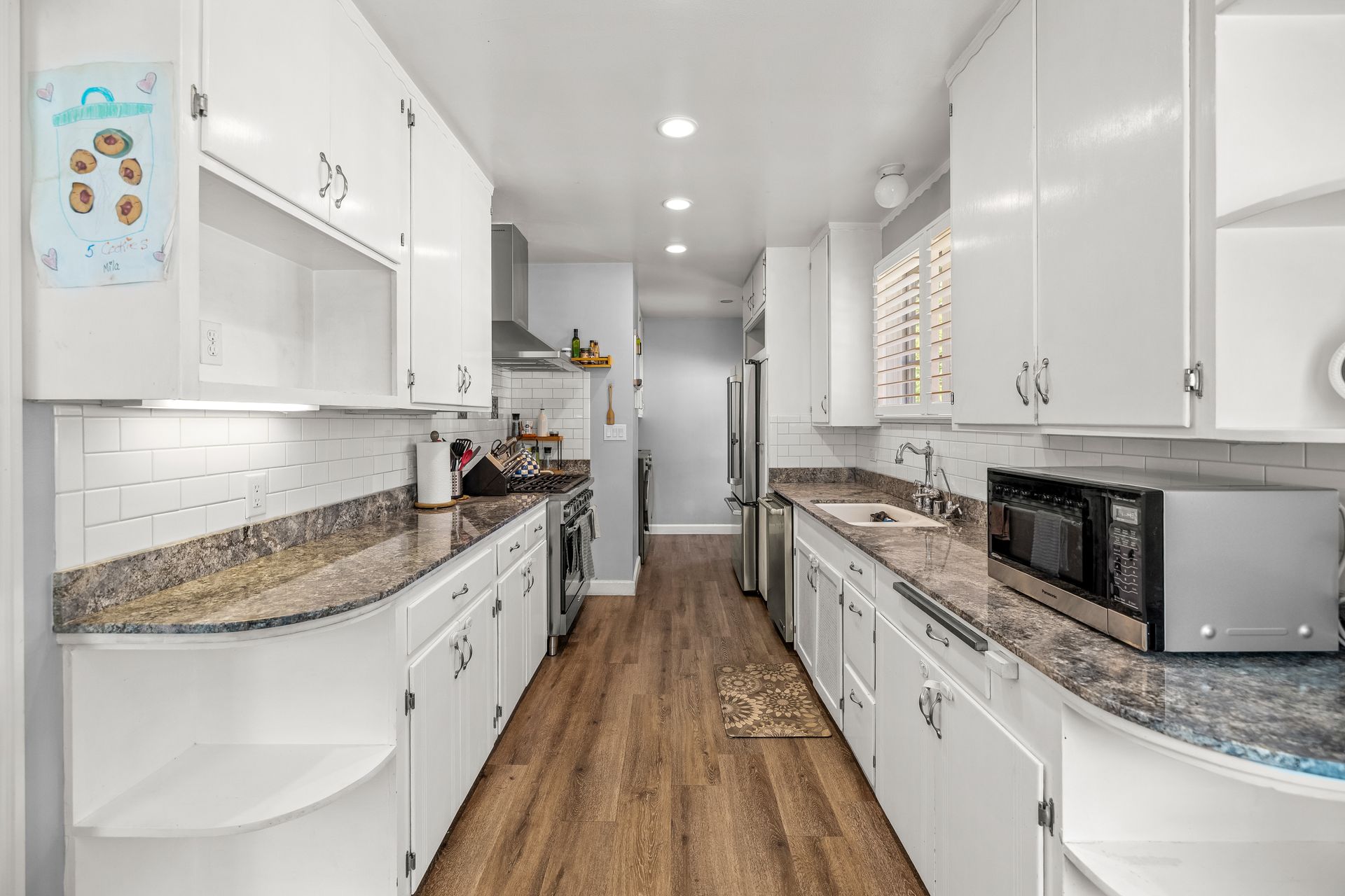 The private backyard is ideal for both relaxing and entertaining, with a patio for gatherings, a generous lawn, and mature fruit trees including pomegranate and orange. Additional features include dual-pane windows, plantation shutters, a newer HVAC system, and a detached two-car garage.