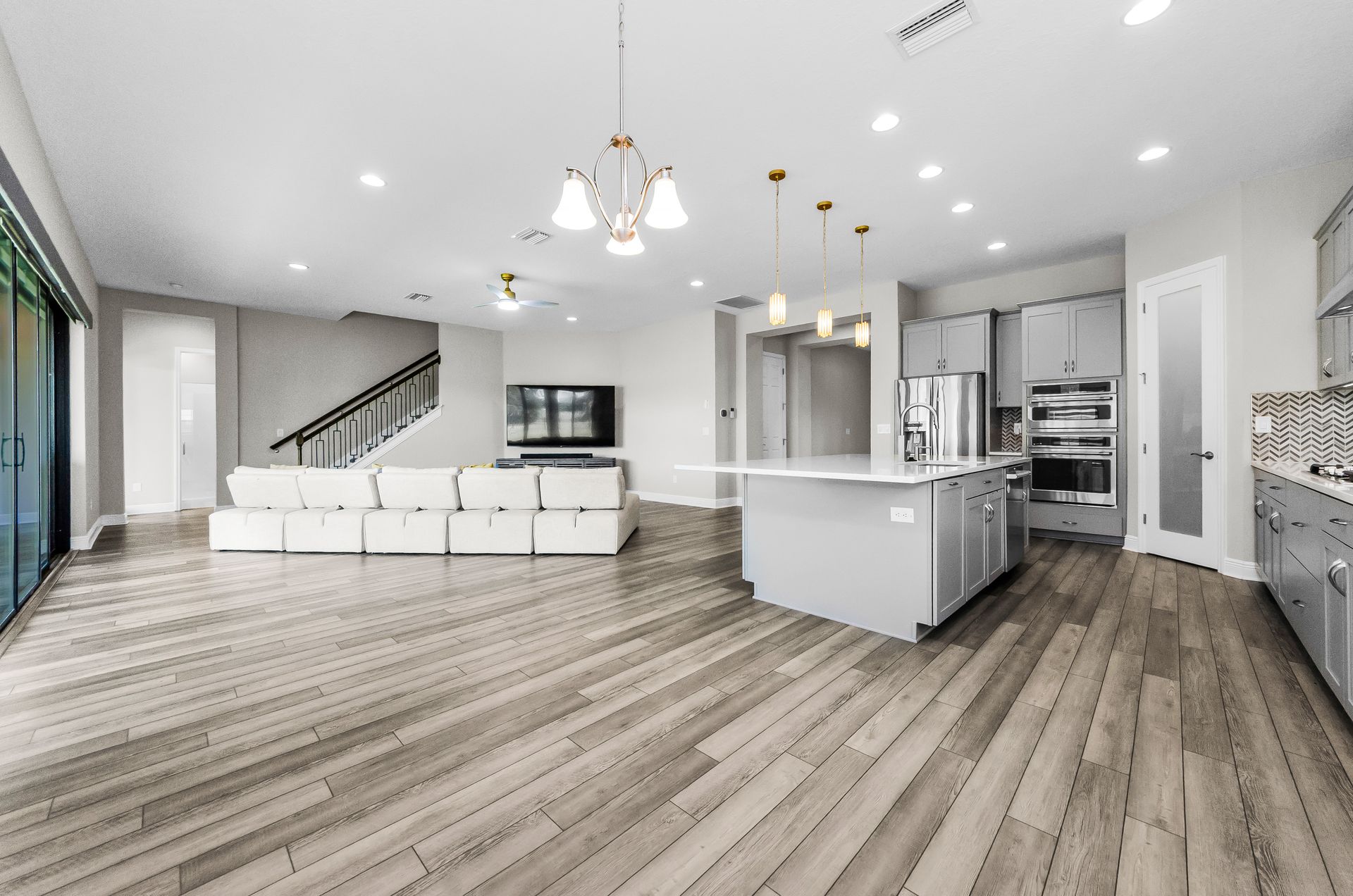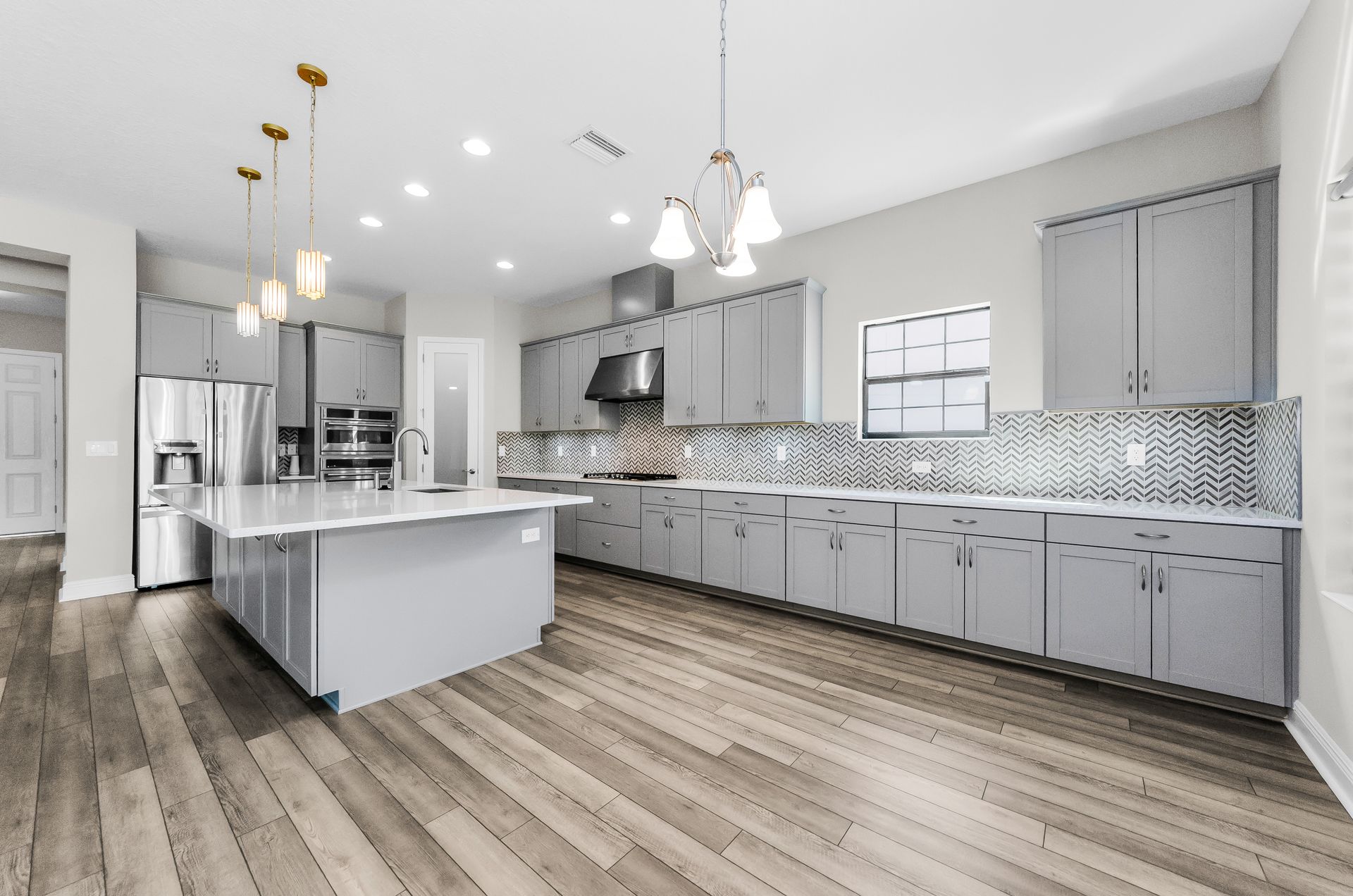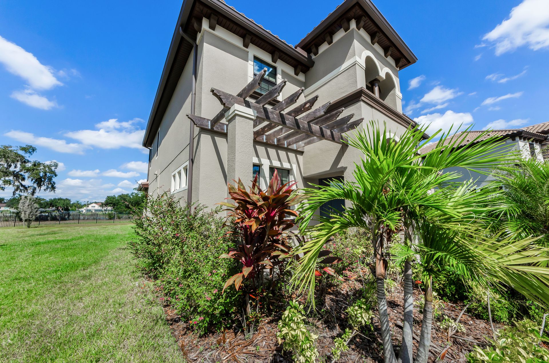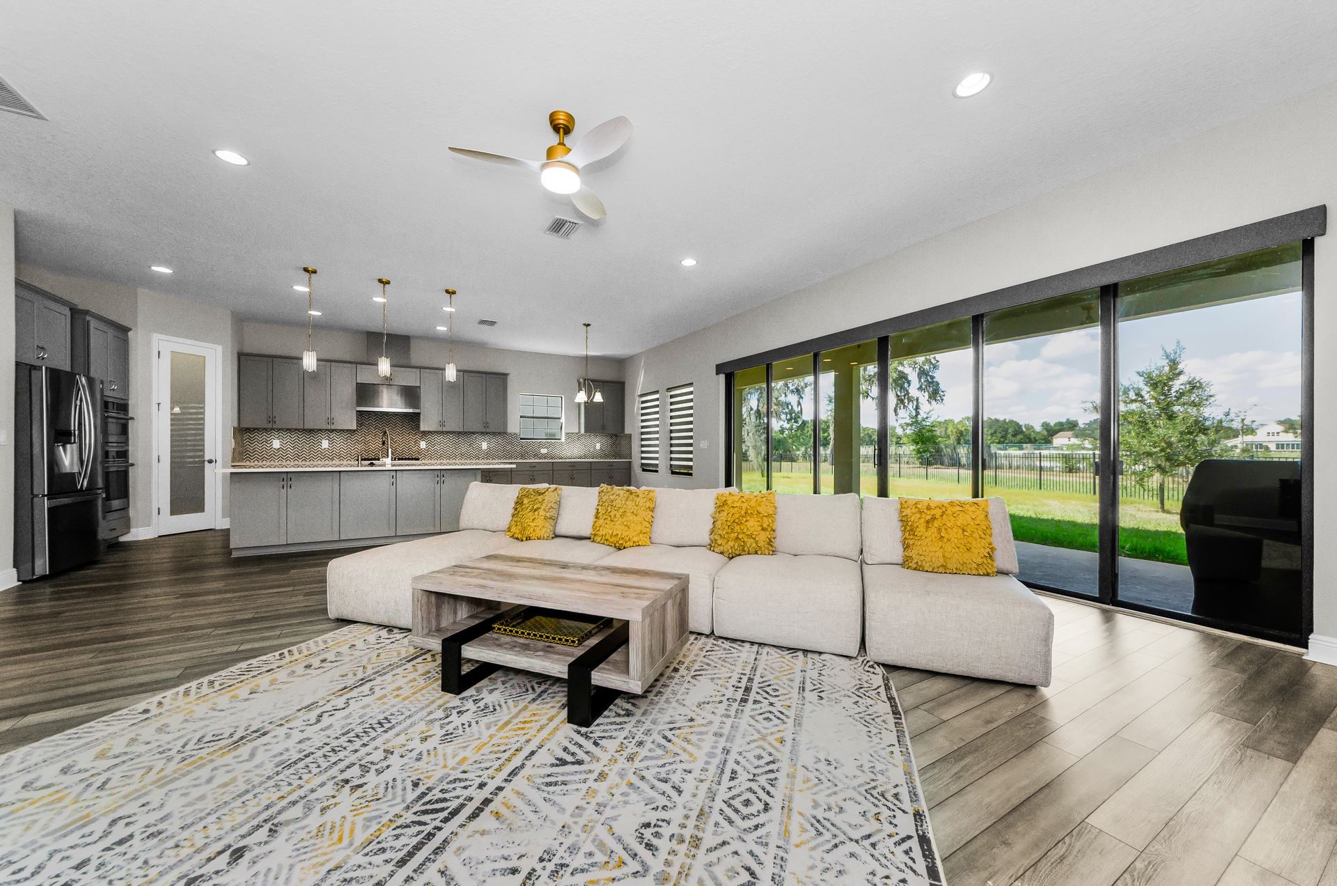 Experience modern Florida living in this stunning 5-bedroom, 4 full bathroom WestBay Verona home located in the gated community of The Sanctuary at John Moore Road. Built in 2022, this beautifully designed residence offers over 3,500 sq. ft. of bright, open living space with luxury finishes, energy-efficient design, and a contemporary coastal feel throughout. From the moment you arrive, the covered front porch welcomes you into a spacious, open-concept floor plan that blends comfort and connection. The heart of the home is the gourmet kitchen, featuring quartz countertops, GE Café stainless steel appliances, a gas cooktop, custom pantry, and an oversized island—perfect for family gatherings or entertaining. The adjoining great room and dining area flow seamlessly together, filled with natural light from full-length sliding glass doors that open completely to the covered back patio for true indoor-outdoor living. A flexible front room offers endless possibilities—use it as a formal dining area, office, playroom, or gym. The first floor also includes a full bath and a large guest bedroom, ideal for visitors or working from home. Upstairs, the loft provides an additional living area, while the primary suite offers a spa-like bath with dual vanities, a soaking tub, a separate shower, and a custom walk-in closet. Two bedrooms share a Jack & Jill bath, and a fourth upstairs bedroom has a nearby full bath. Step outside to the covered patio (lanai) and envision your future backyard oasis—there’s ample space to add a pool, with pre-plumbing for an outdoor kitchen already in place. Additional features include smart home lighting, a laundry room with cabinetry and sink, and a 3-car garage. Located just 20 minutes from Downtown Tampa and Tampa In