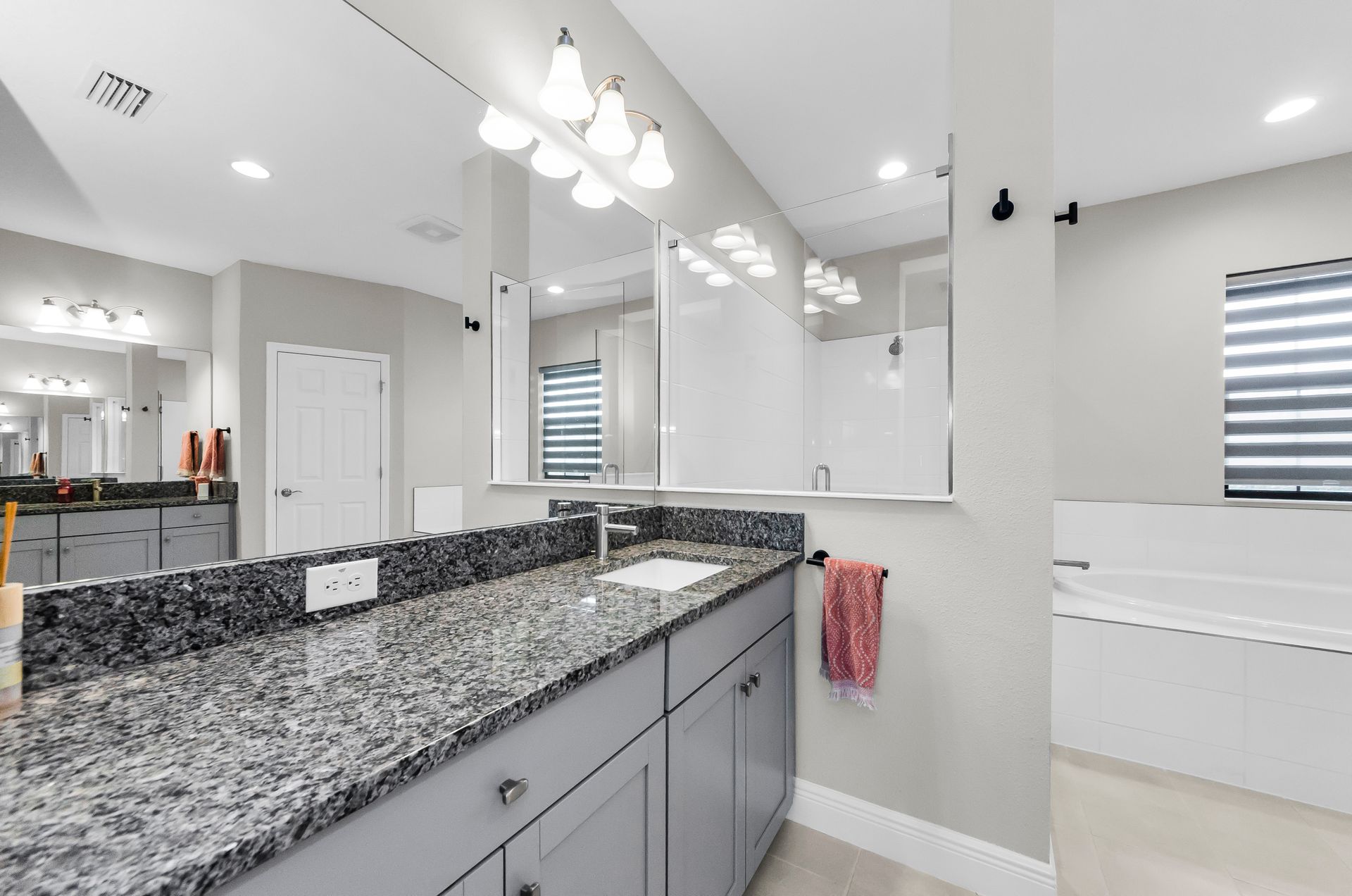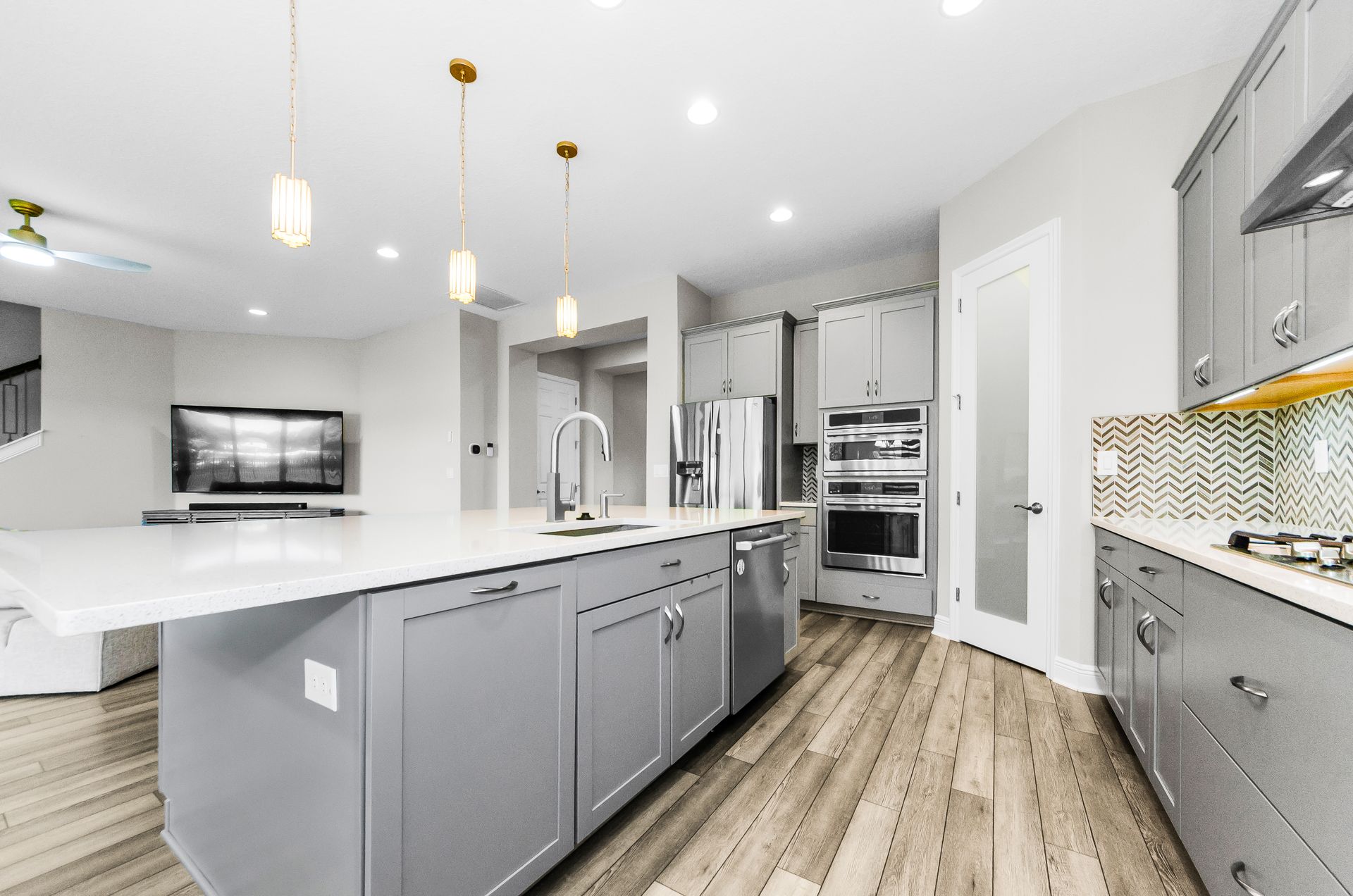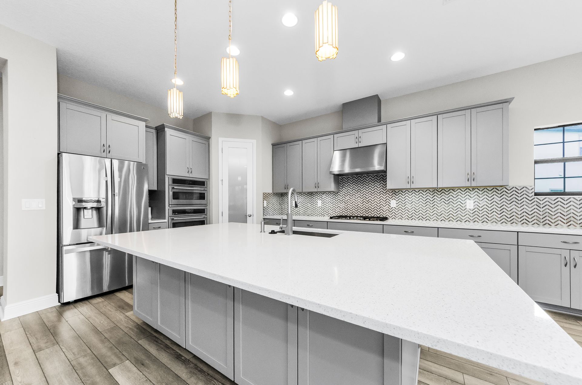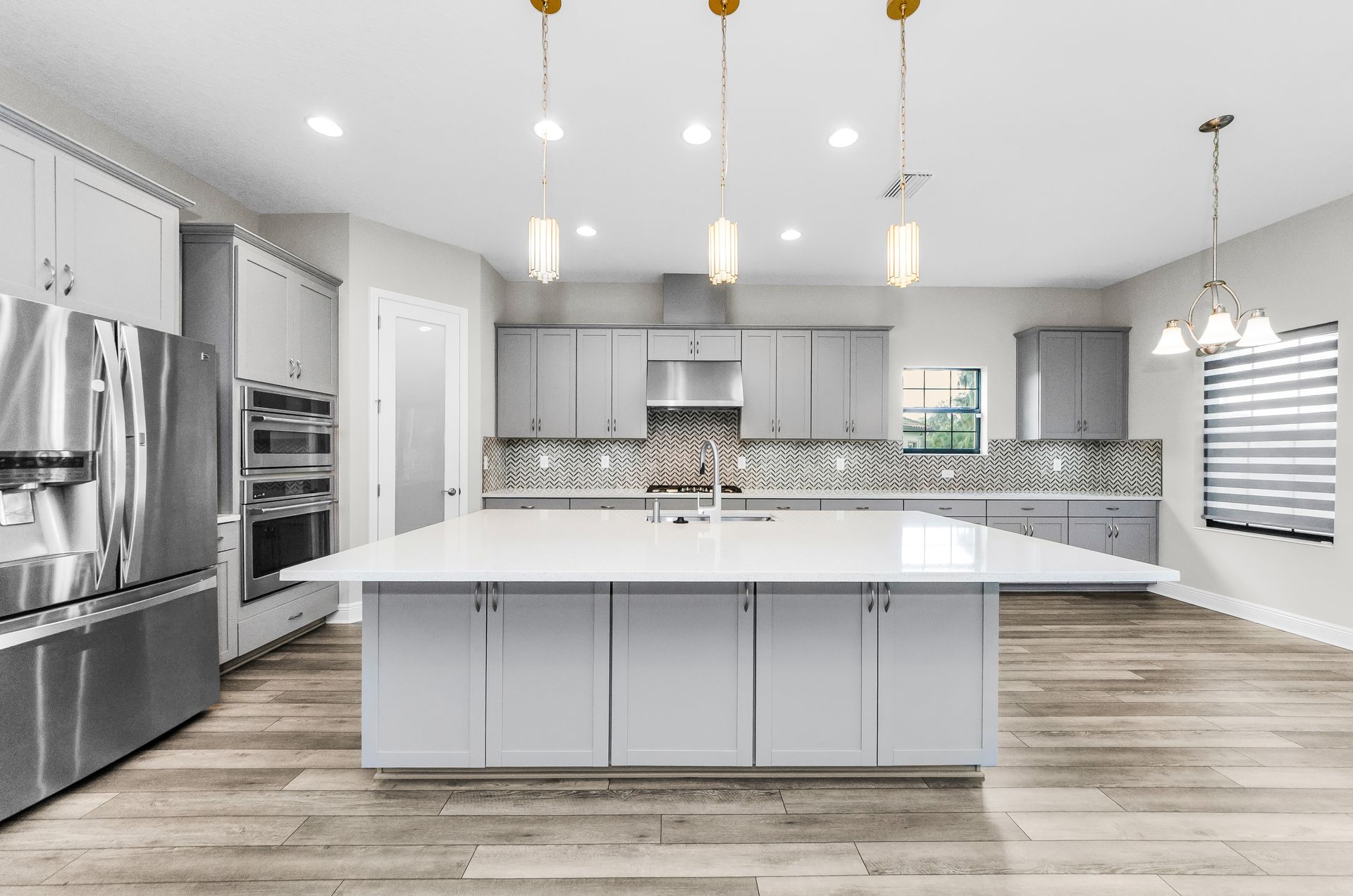 Experience modern Florida living in this stunning 5-bedroom, 4 full bathroom WestBay Verona home located in the gated community of The Sanctuary at John Moore Road. Built in 2022, this beautifully designed residence offers over 3,500 sq. ft. of bright, open living space with luxury finishes, energy-efficient design, and a contemporary coastal feel throughout. From the moment you arrive, the covered front porch welcomes you into a spacious, open-concept floor plan that blends comfort and connection. The heart of the home is the gourmet kitchen, featuring quartz countertops, GE Café stainless steel appliances, a gas cooktop, custom pantry, and an oversized island—perfect for family gatherings or entertaining. The adjoining great room and dining area flow seamlessly together, filled with natural light from full-length sliding glass doors that open completely to the covered back patio for true indoor-outdoor living. A flexible front room offers endless possibilities—use it as a formal dining area, office, playroom, or gym. The first floor also includes a full bath and a large guest bedroom, ideal for visitors or working from home. Upstairs, the loft provides an additional living area, while the primary suite offers a spa-like bath with dual vanities, a soaking tub, a separate shower, and a custom walk-in closet. Two bedrooms share a Jack & Jill bath, and a fourth upstairs bedroom has a nearby full bath. Step outside to the covered patio (lanai) and envision your future backyard oasis—there’s ample space to add a pool, with pre-plumbing for an outdoor kitchen already in place. Additional features include smart home lighting, a laundry room with cabinetry and sink, and a 3-car garage. Located just 20 minutes from Downtown Tampa and Tampa In