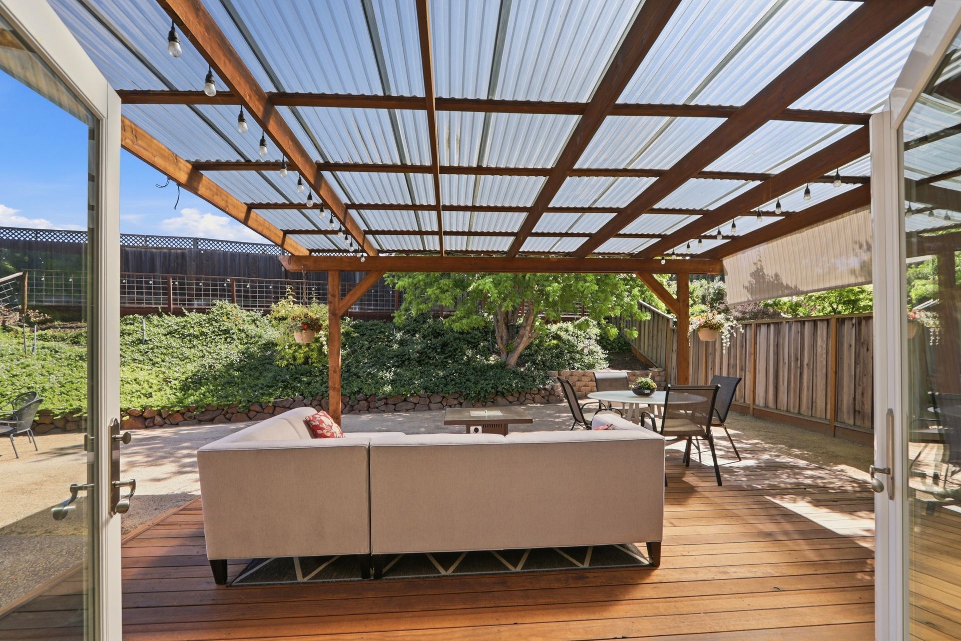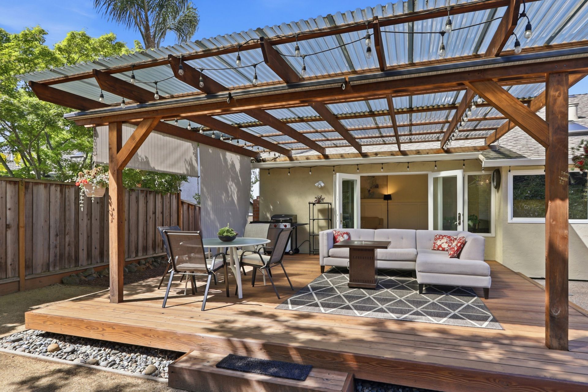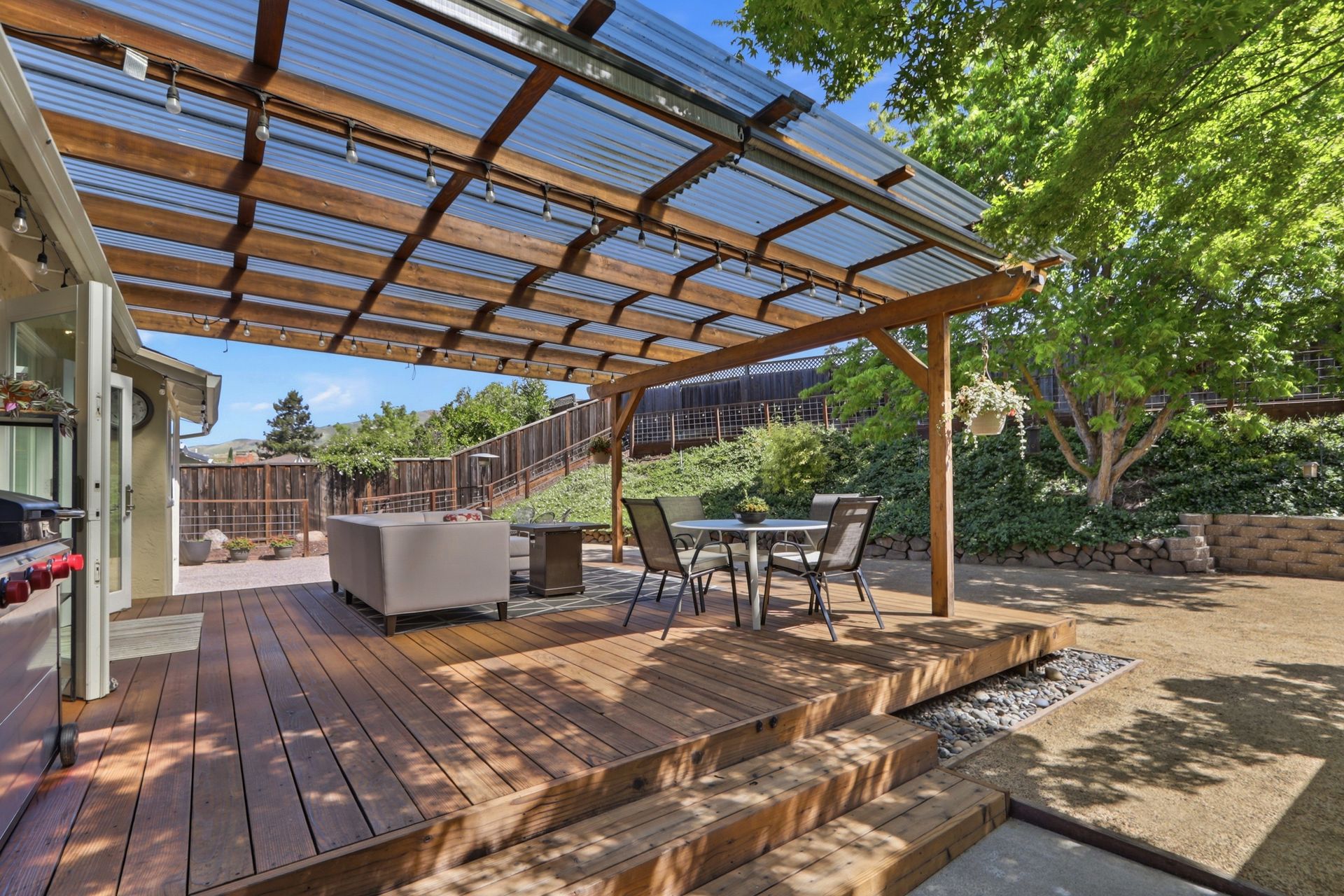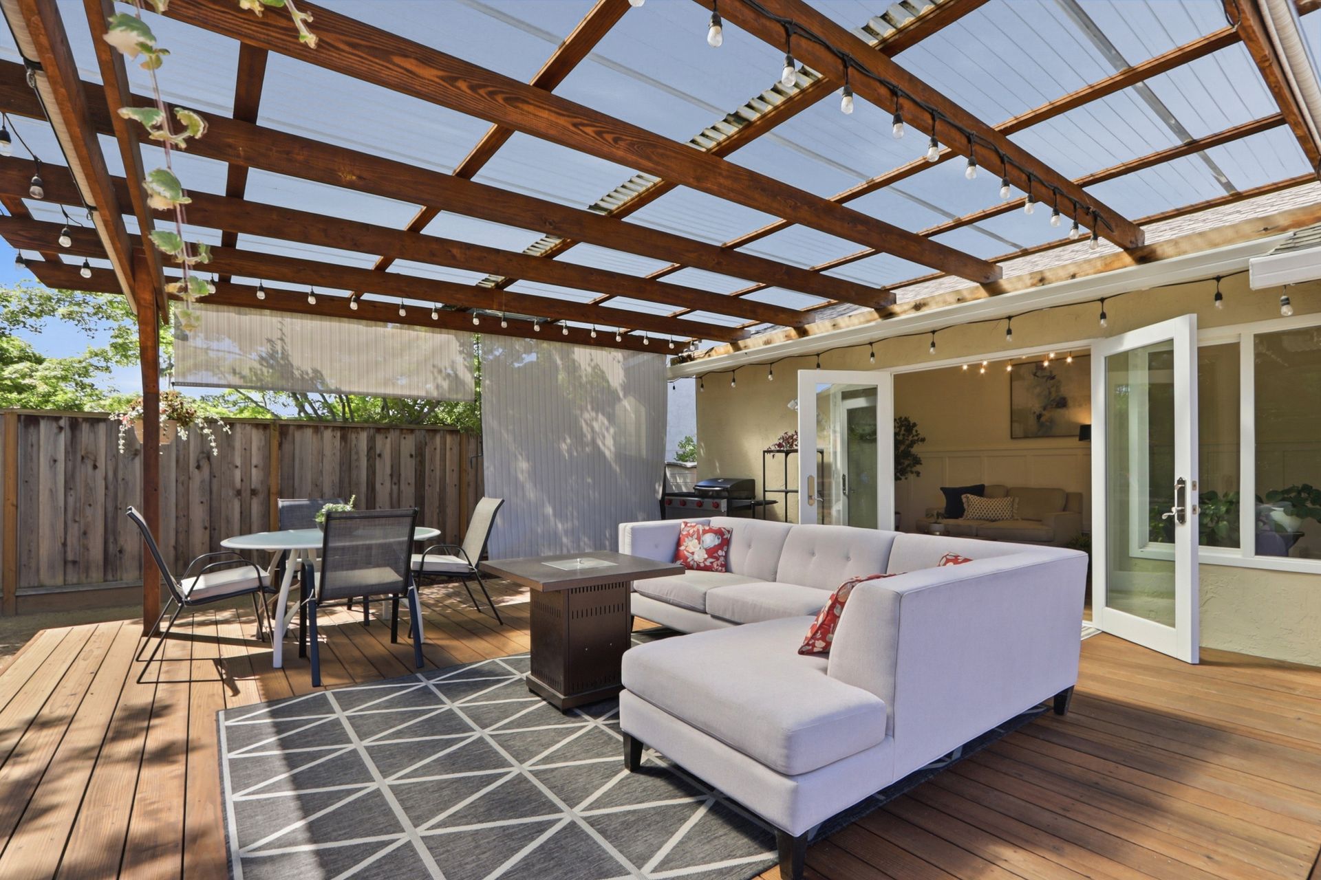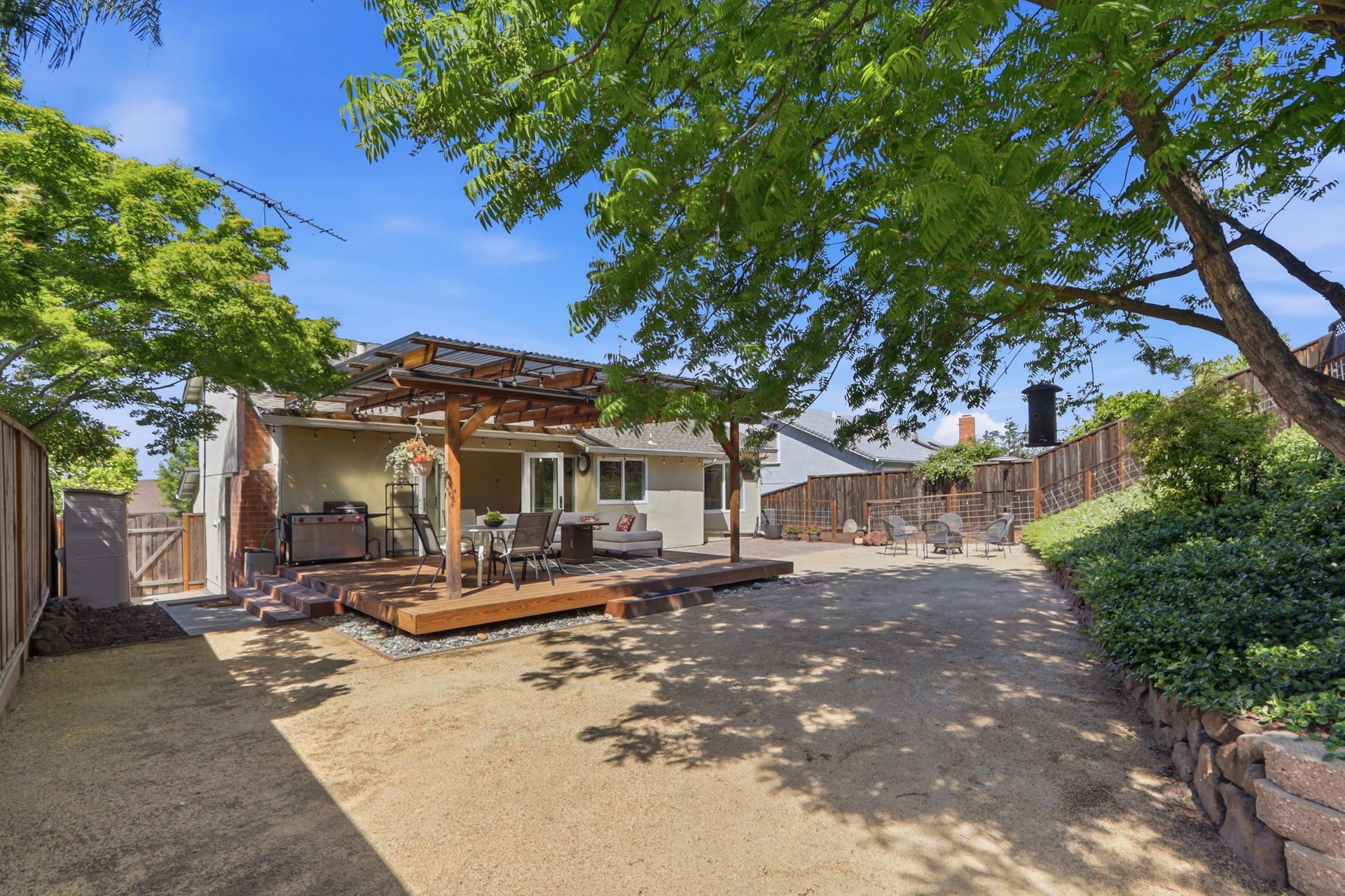 The property's versatile outdoor living spaces are a highlight. The covered patio connects to the kitchen and family room, creating a seamless indoor-outdoor entertaining experience when the doors are open. If it gets chilly outside, full length patio shades can be rolled down to enclose the area. The large, fenced backyard features a fire pit, heater, and a designated dog run area. The drought-tolerant landscaping and automatic sprinklers make outdoor upkeep effortless, and a built-in gas line for the BBQ makes it easy to cook outside year-round.