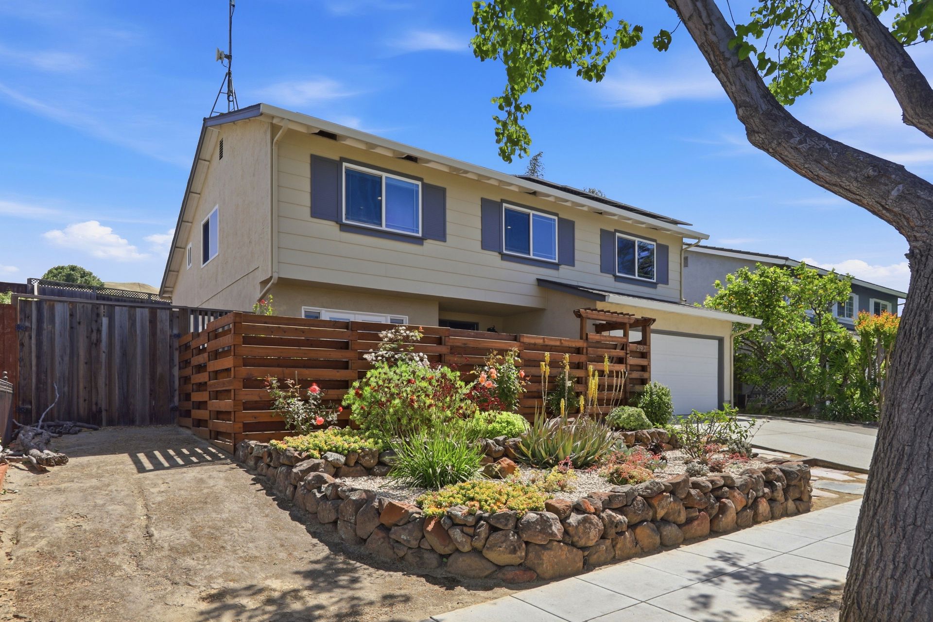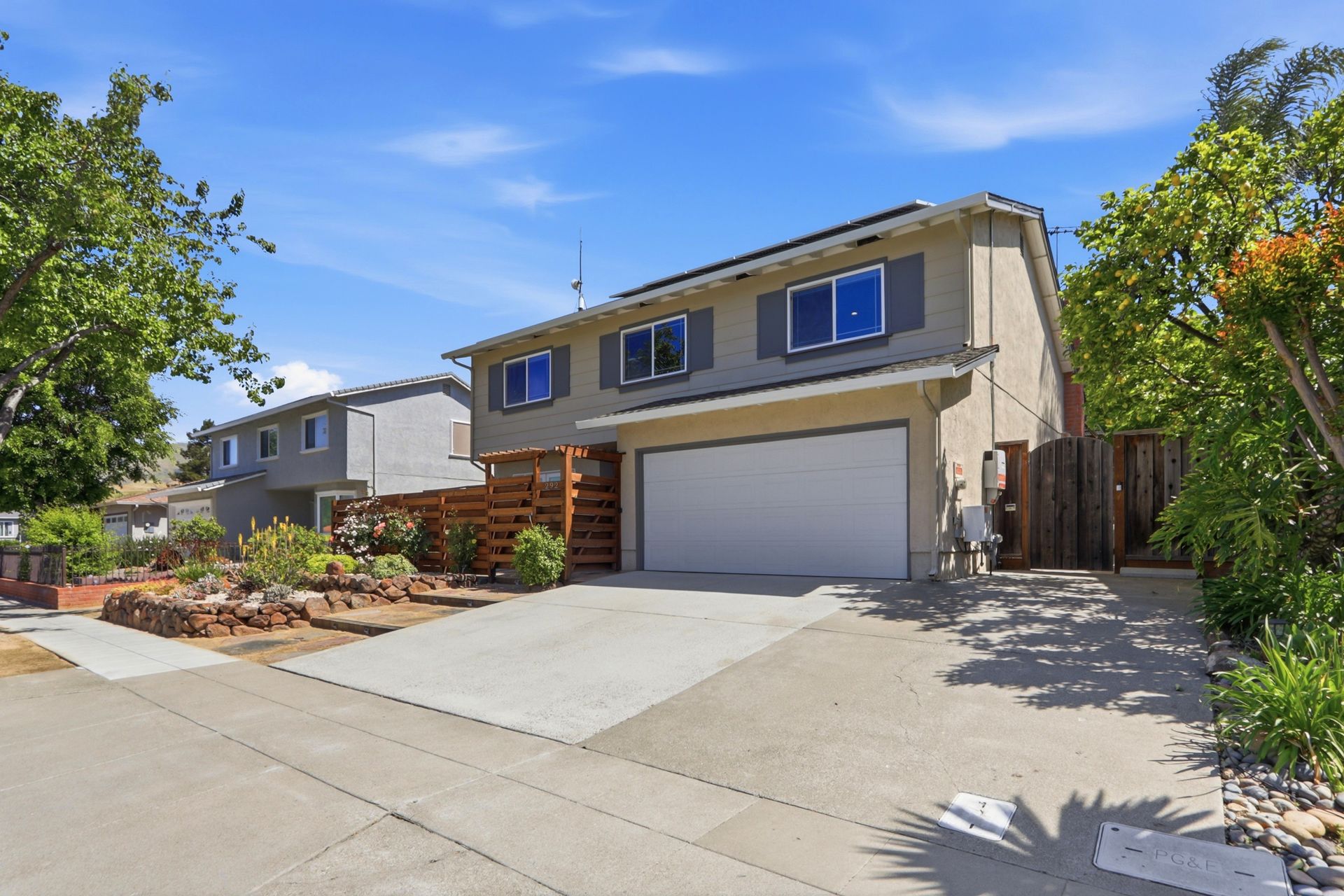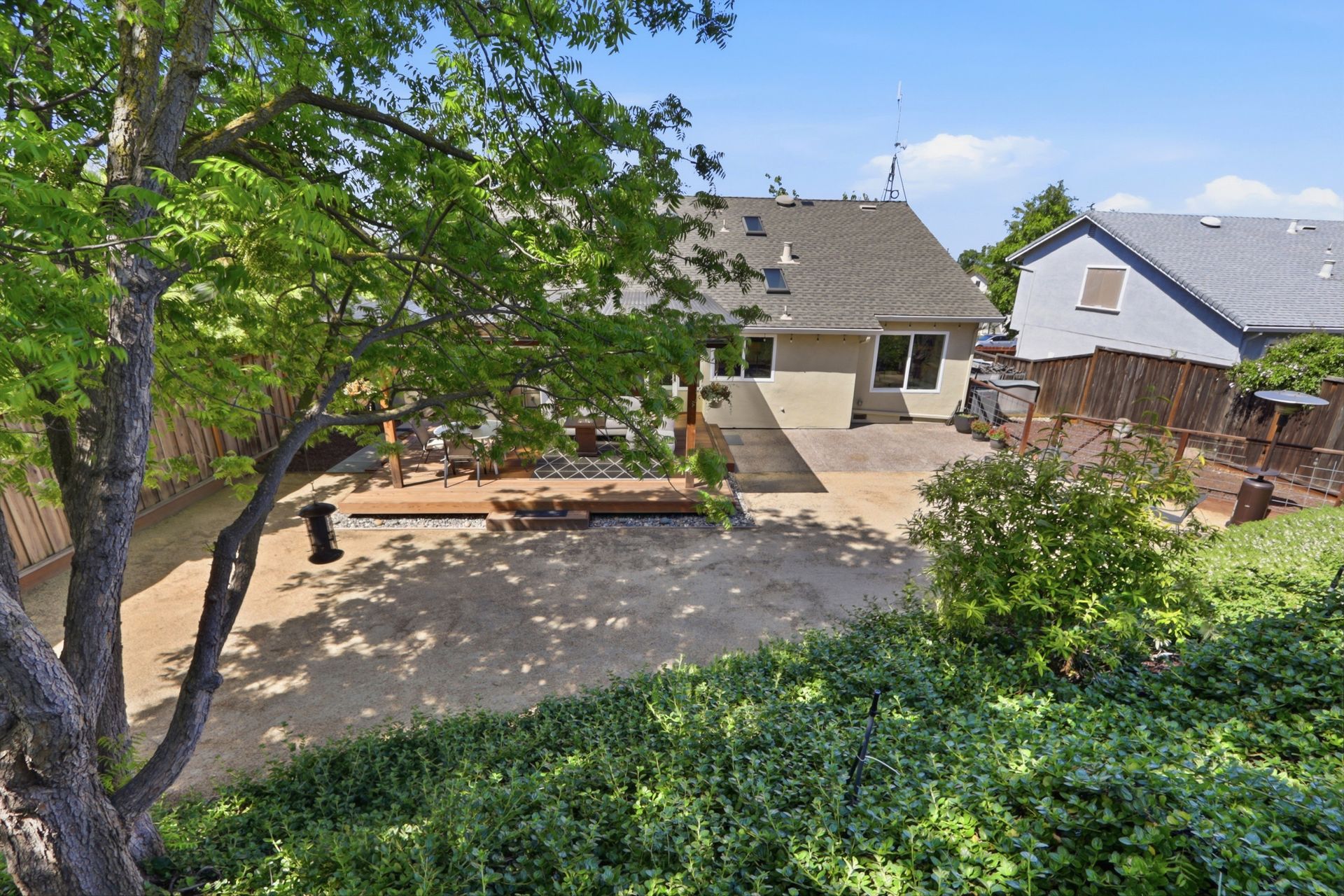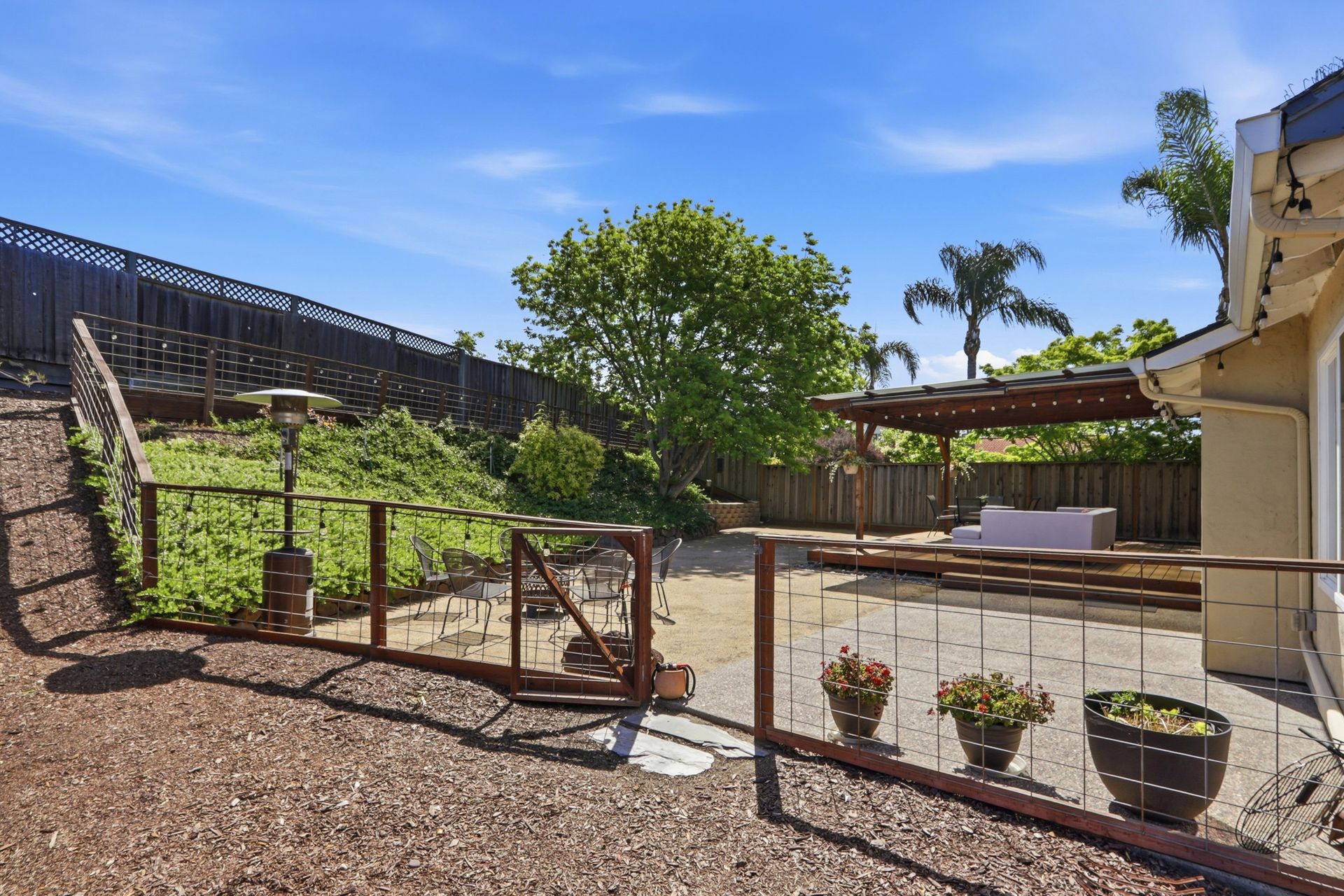 The property's versatile outdoor living spaces are a highlight. The covered patio connects to the kitchen and family room, creating a seamless indoor-outdoor entertaining experience when the doors are open. If it gets chilly outside, full length patio shades can be rolled down to enclose the area. The large, fenced backyard features a fire pit, heater, and a designated dog run area. The drought-tolerant landscaping and automatic sprinklers make outdoor upkeep effortless, and a built-in gas line for the BBQ makes it easy to cook outside year-round.