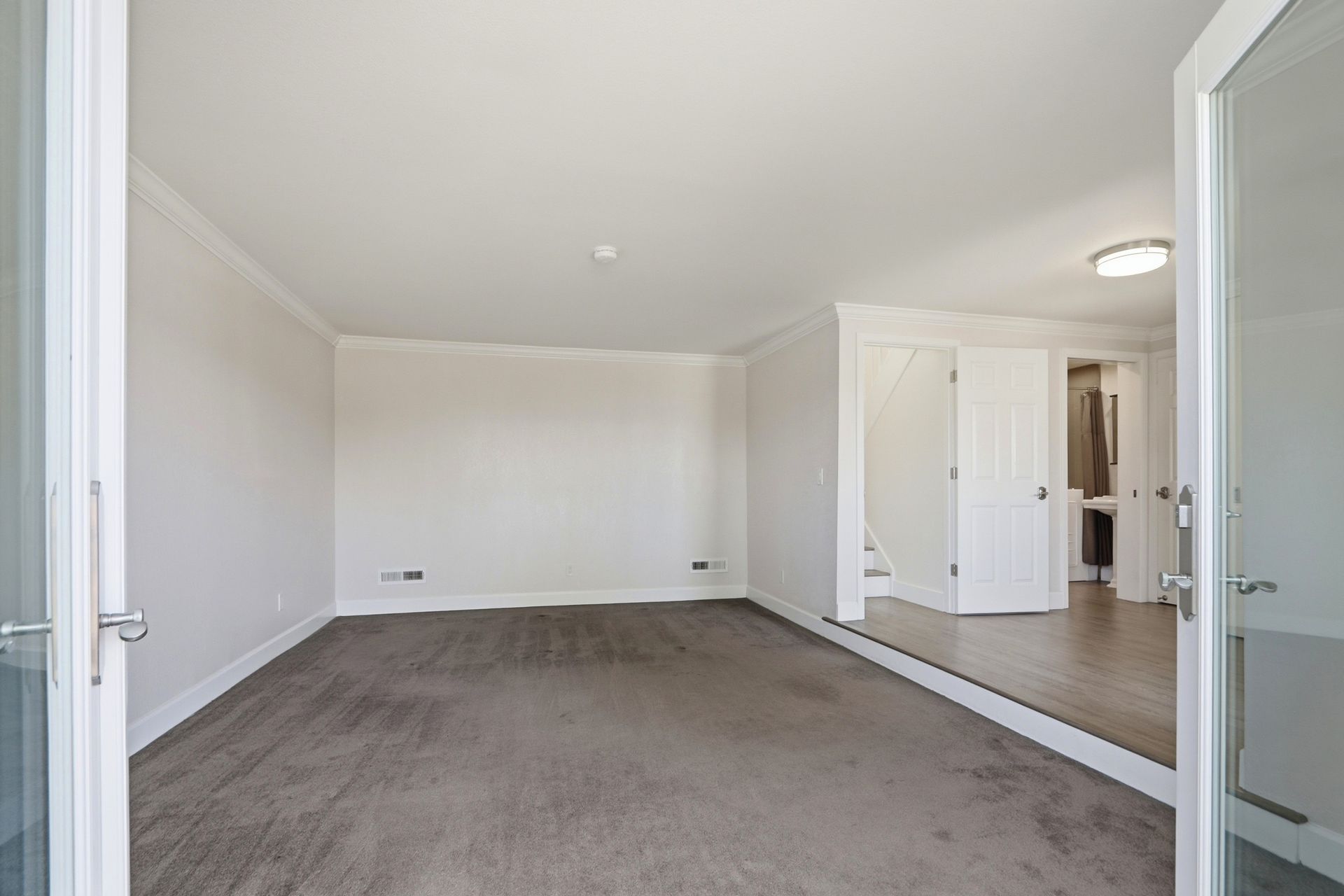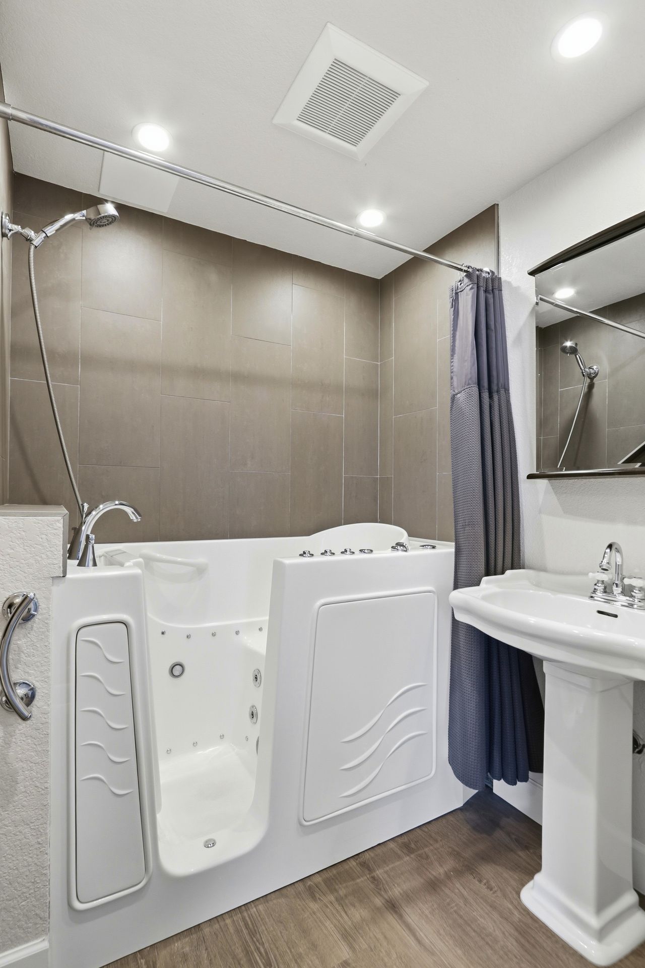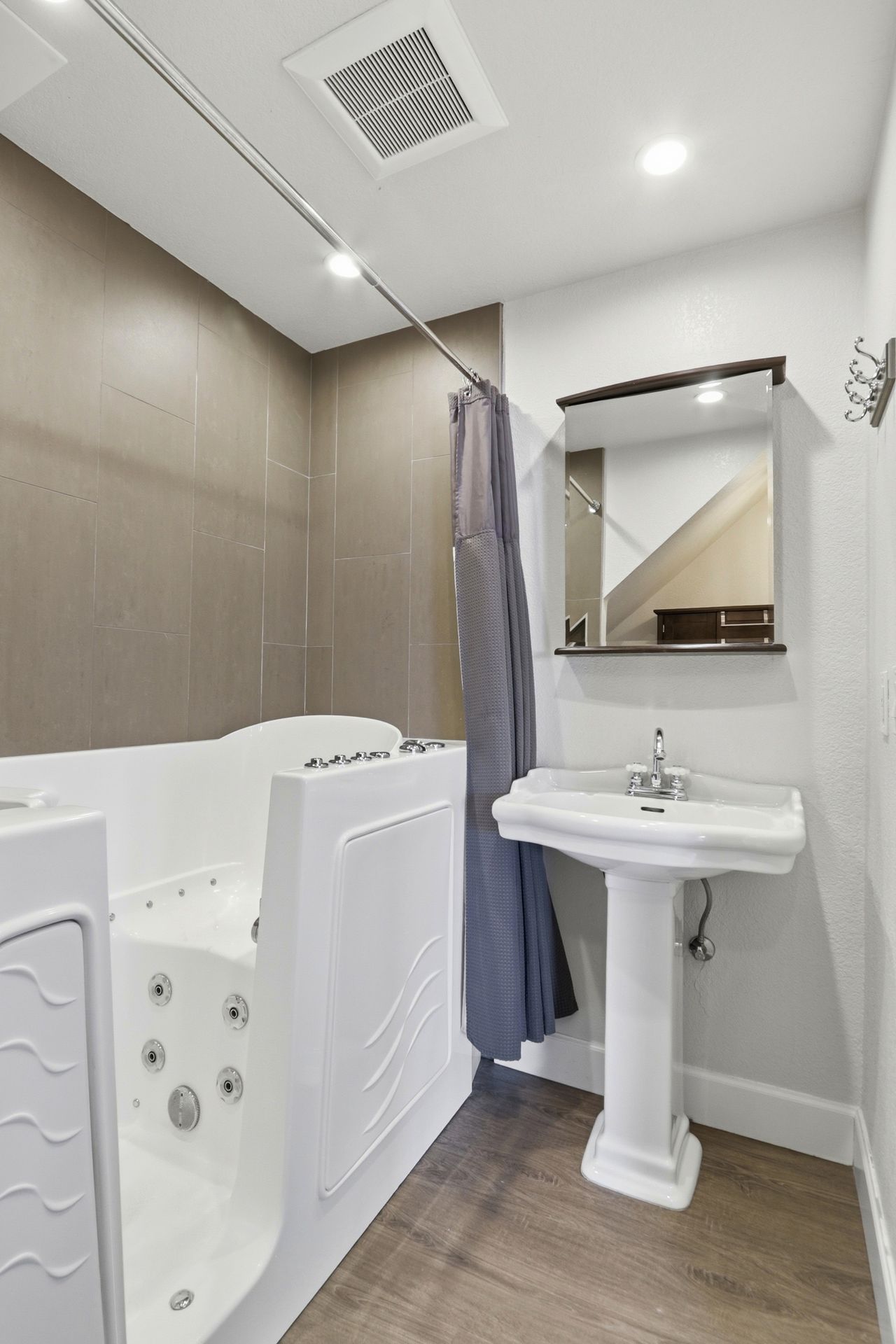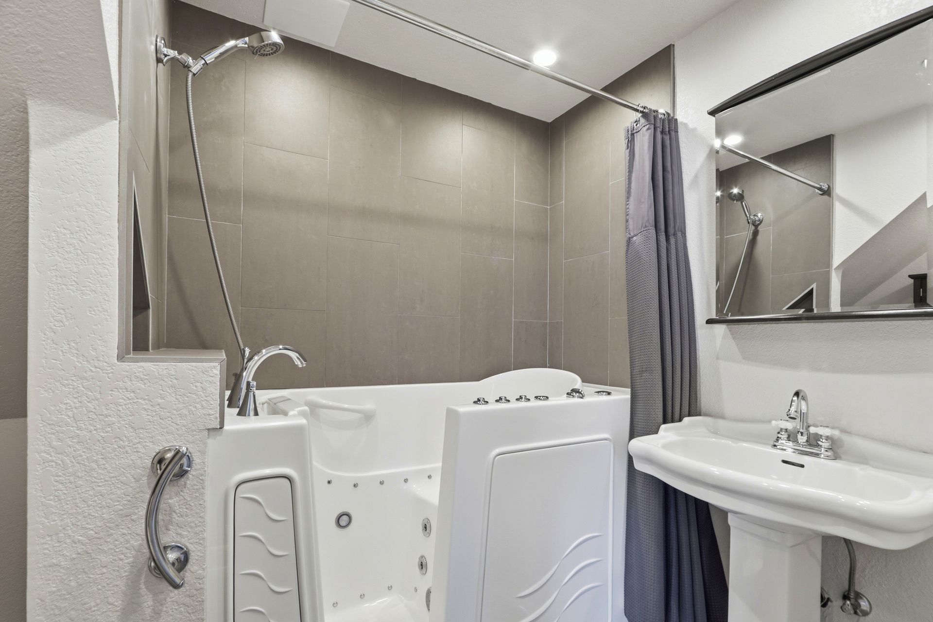 The first floor features an open room with french doors opening to a private fenced-in courtyard. Specifically modified to previously accommodate elderly parents, a full bathroom on this level showcases a luxurious walk-in jetted tub with shower. This space works well as either a living room, guest room or fifth bedroom.