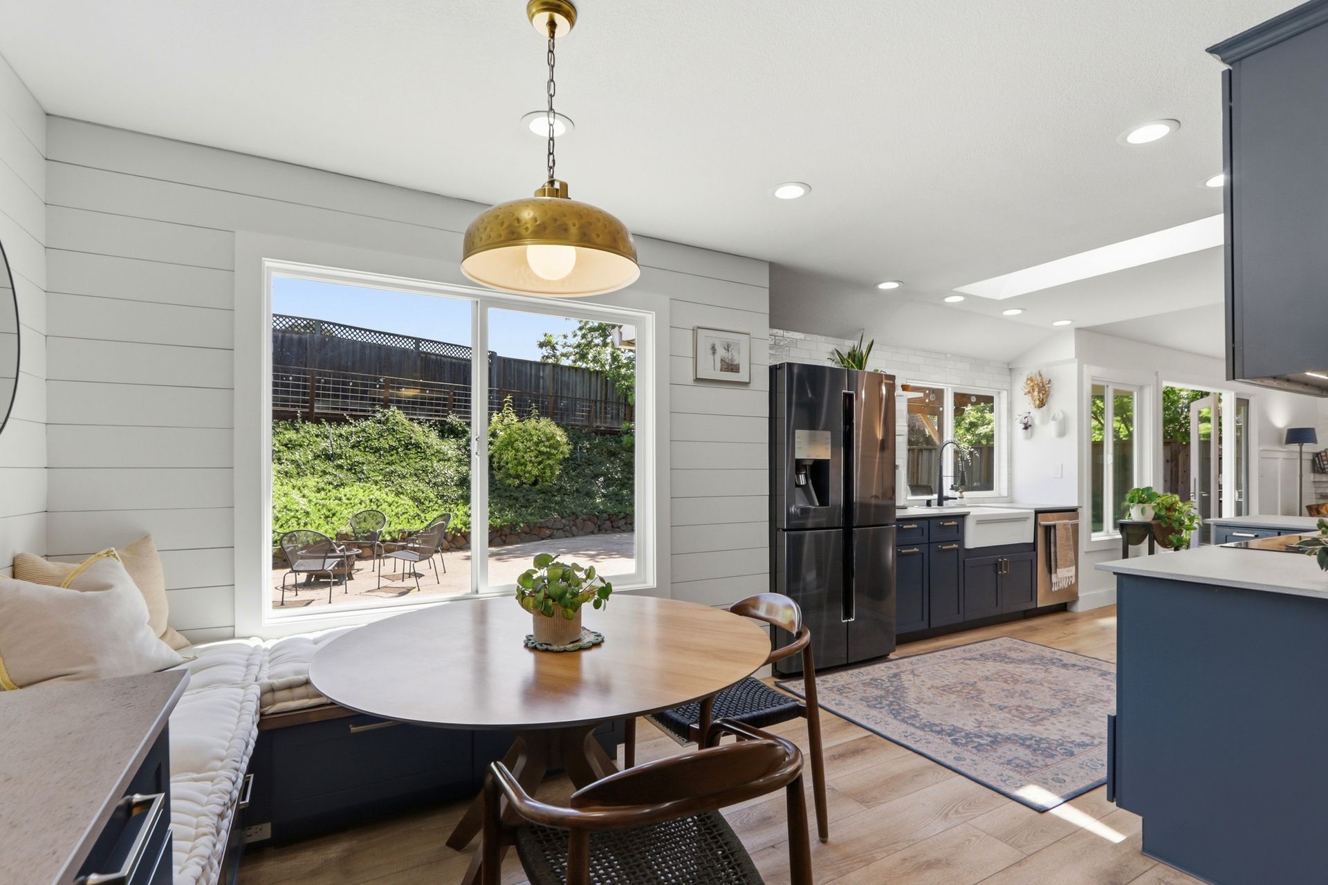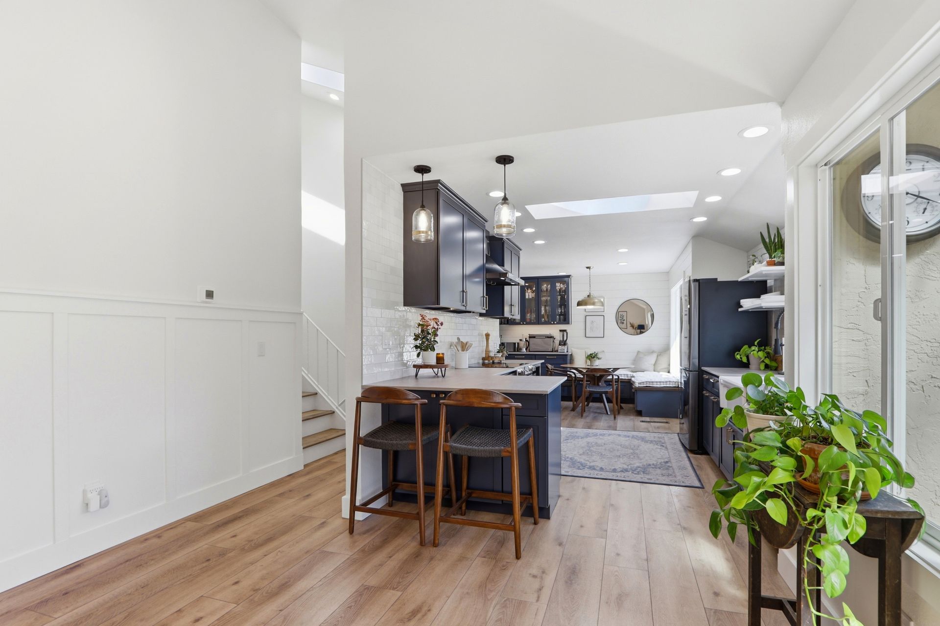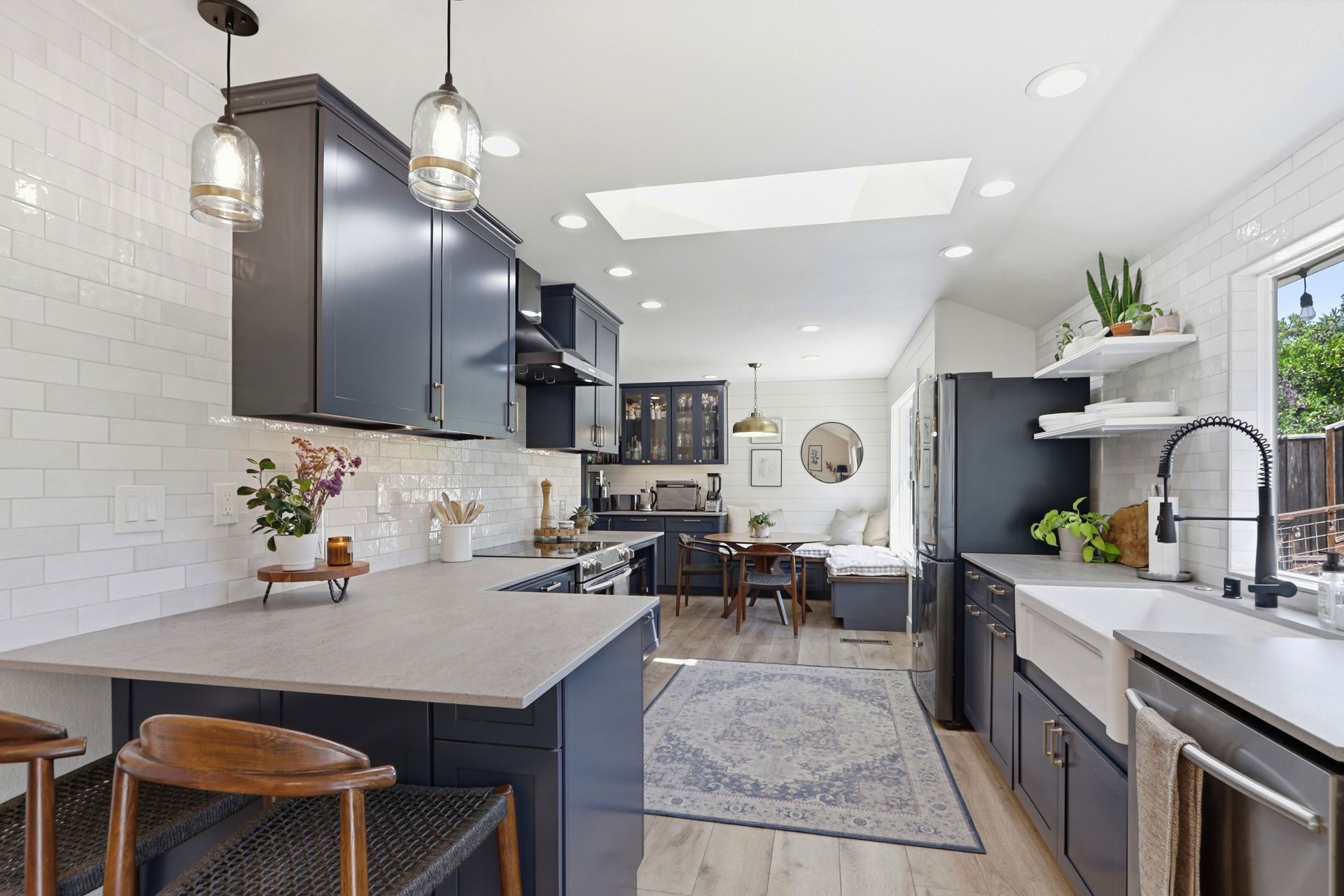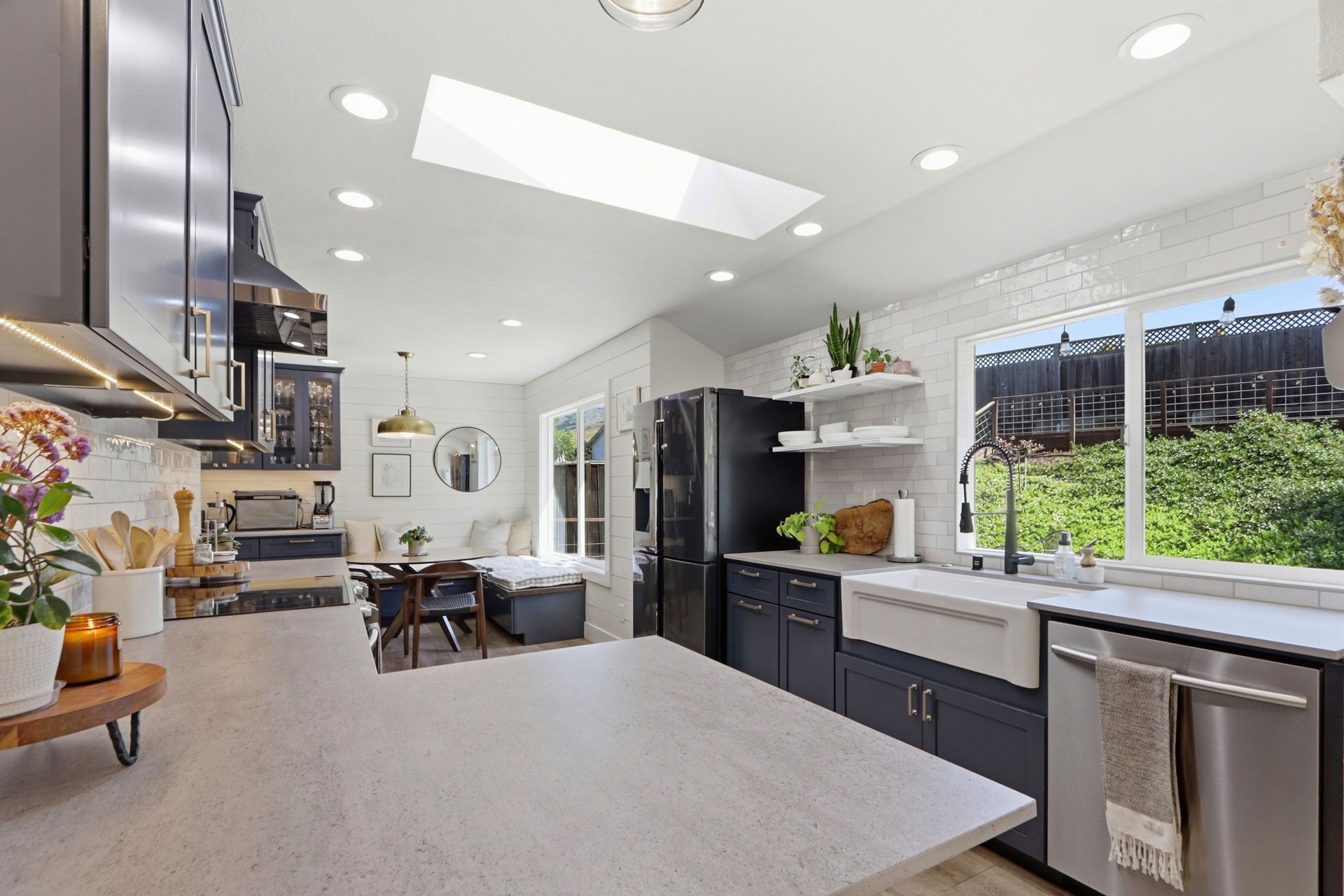 Just five steps up from this level is the impeccably remodeled open concept kitchen and family room. The kitchen includes an operable skylight for plenty of natural light as well as durable Deklon countertops and modern appliances. Ample cabinetry for storage, and a light and bright aesthetic make this a great place to entertain in. The kitchen also includes a built-in banquette seating area, providing a cozy space for dining and gathering.