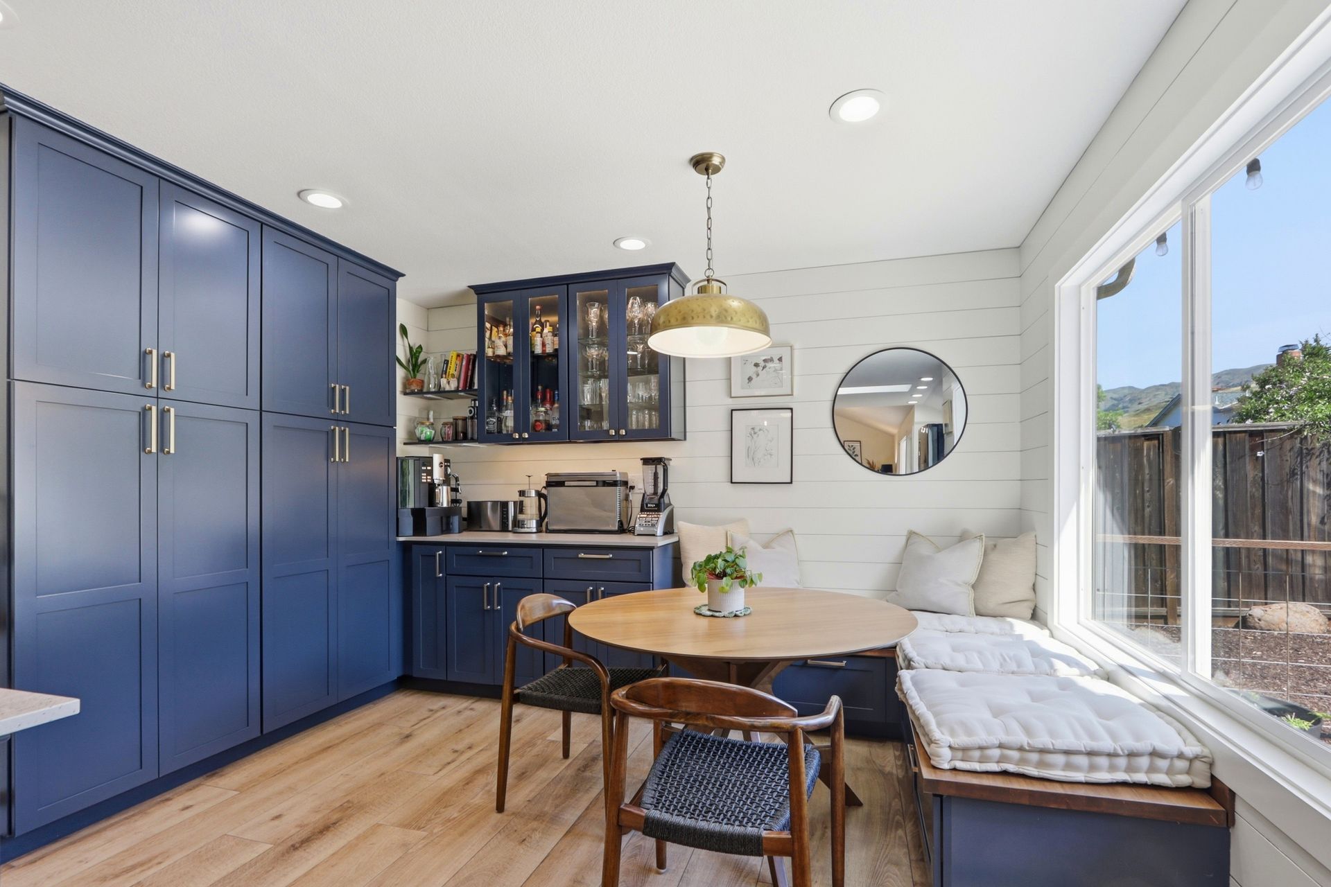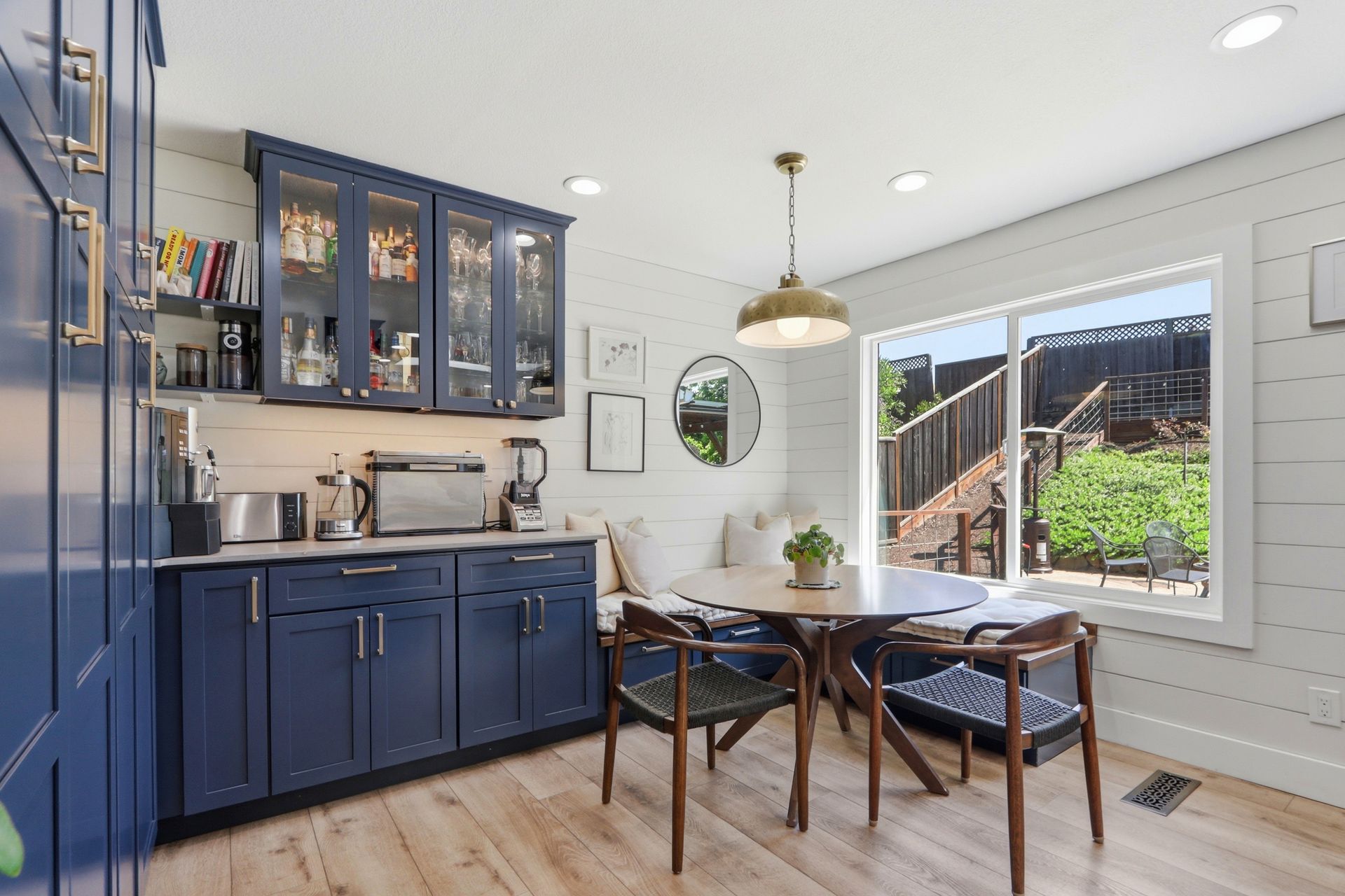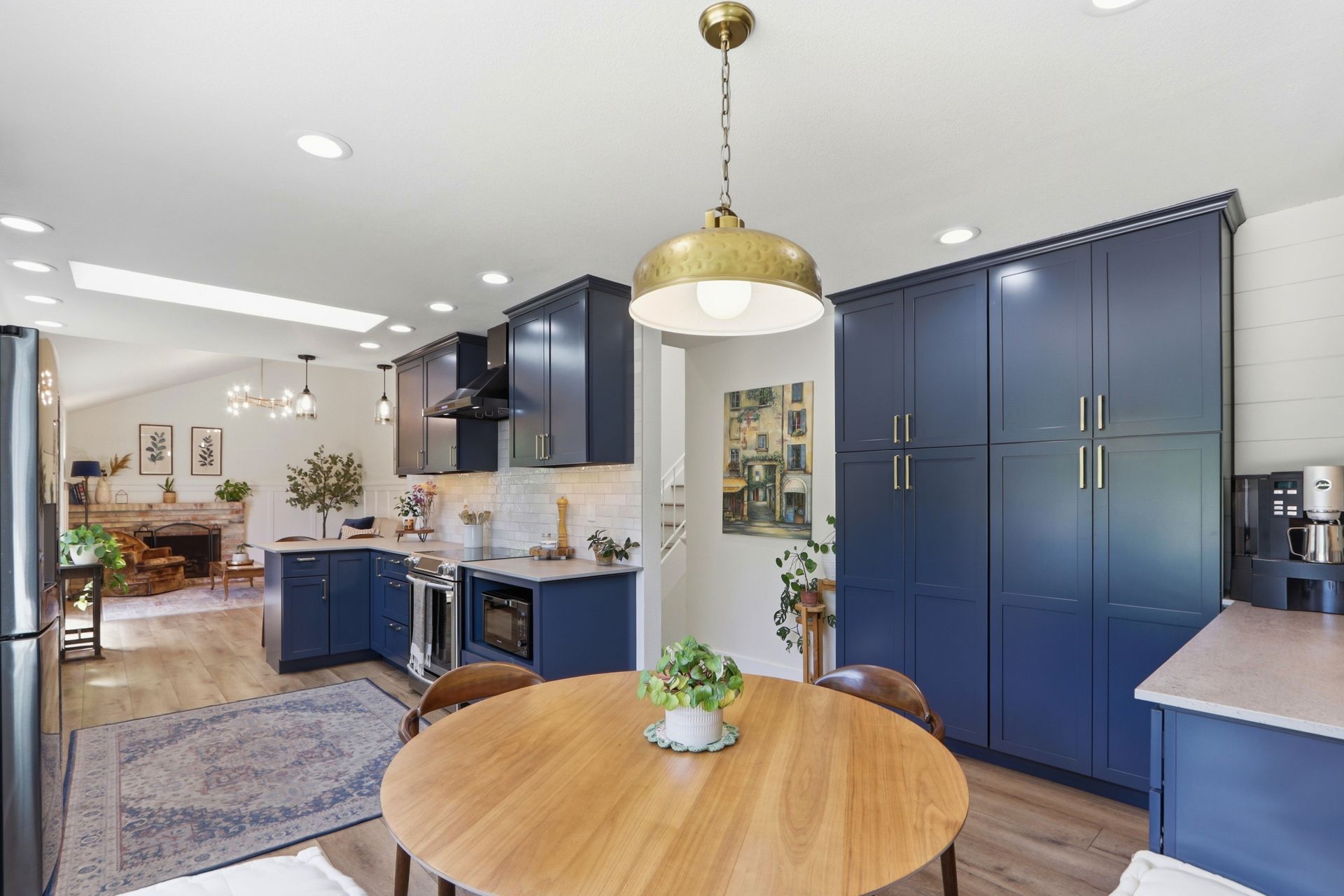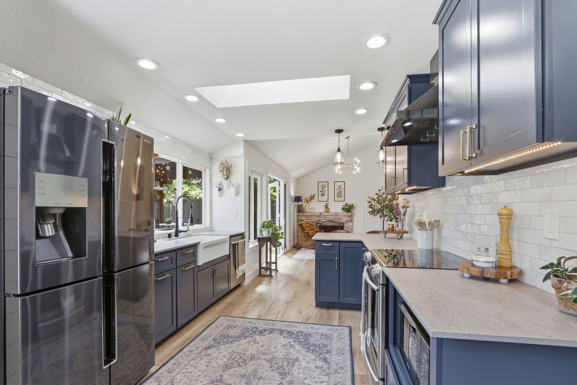 Just five steps up from this level is the impeccably remodeled open concept kitchen and family room. The kitchen includes an operable skylight for plenty of natural light as well as durable Deklon countertops and modern appliances. Ample cabinetry for storage, and a light and bright aesthetic make this a great place to entertain in. The kitchen also includes a built-in banquette seating area, providing a cozy space for dining and gathering.