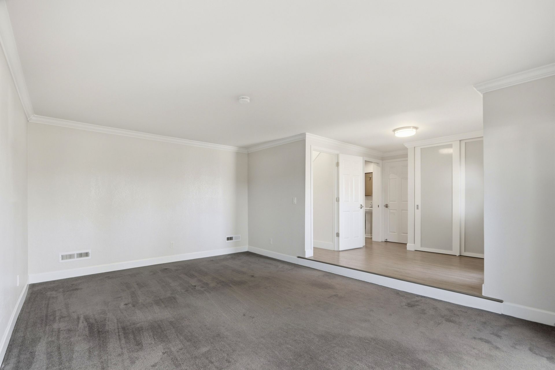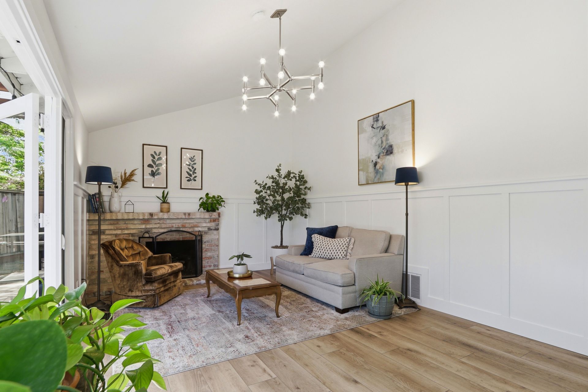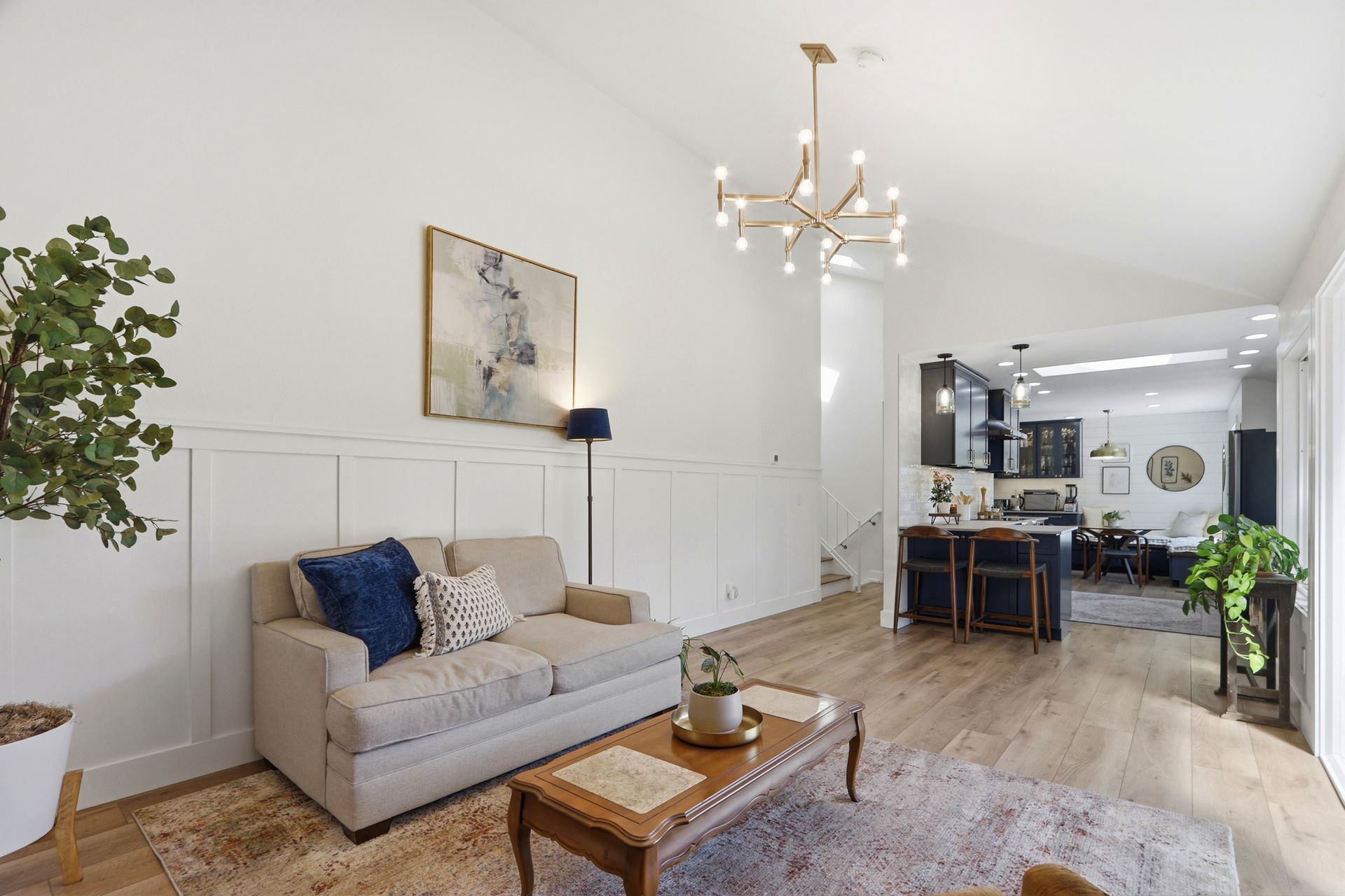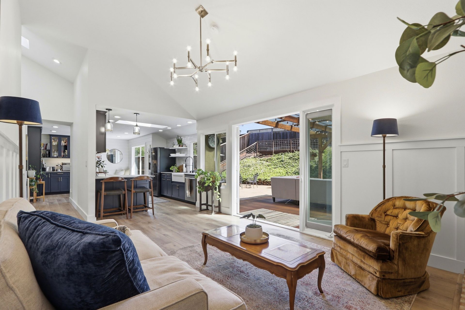 Just five steps up from this level is the impeccably remodeled open concept kitchen and family room. The kitchen includes an operable skylight for plenty of natural light as well as durable Deklon countertops and modern appliances. Ample cabinetry for storage, and a light and bright aesthetic make this a great place to entertain in. The kitchen also includes a built-in banquette seating area, providing a cozy space for dining and gathering.