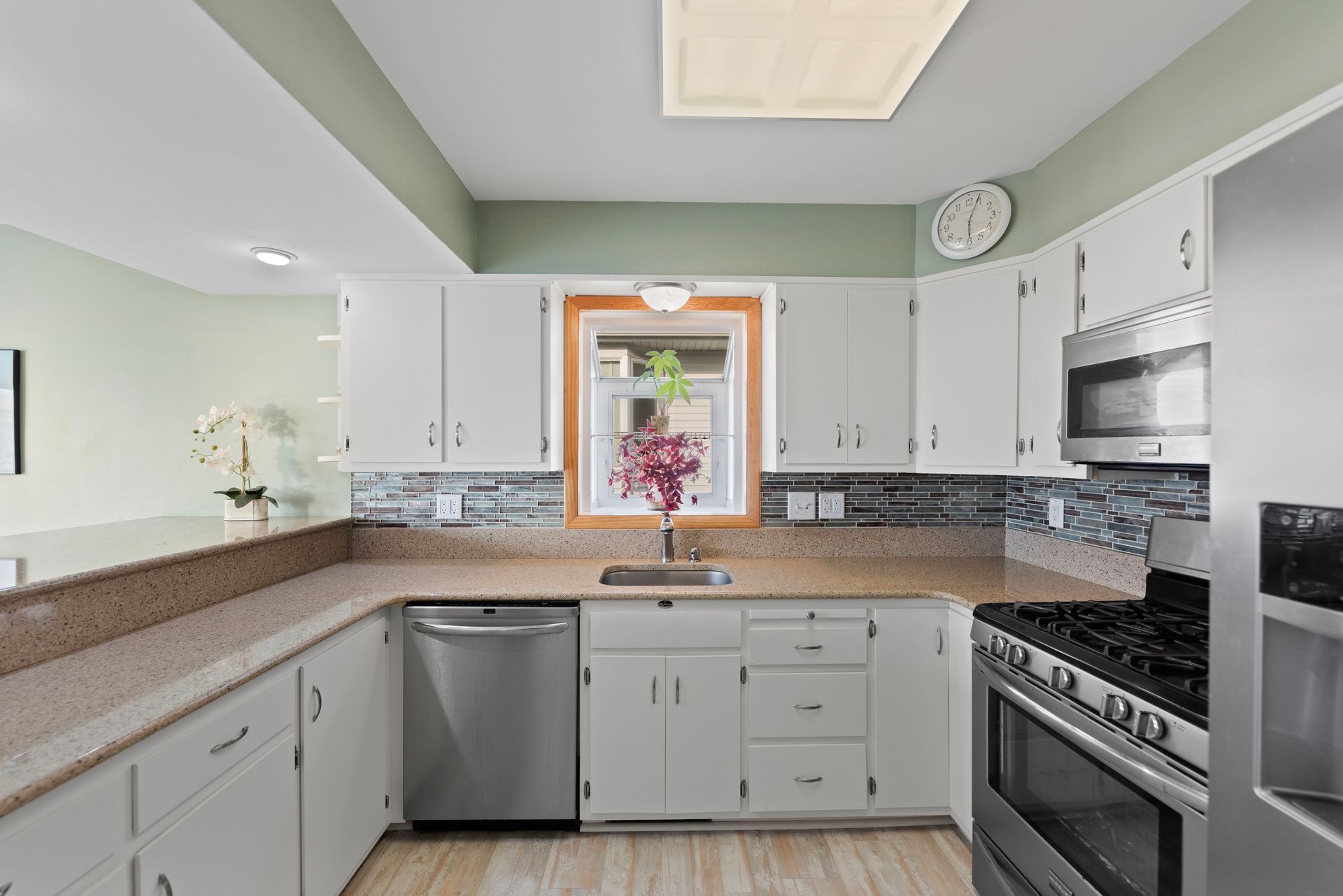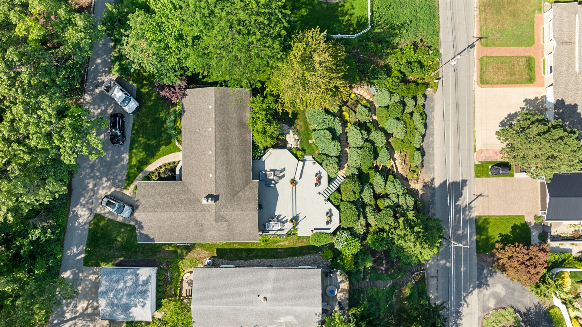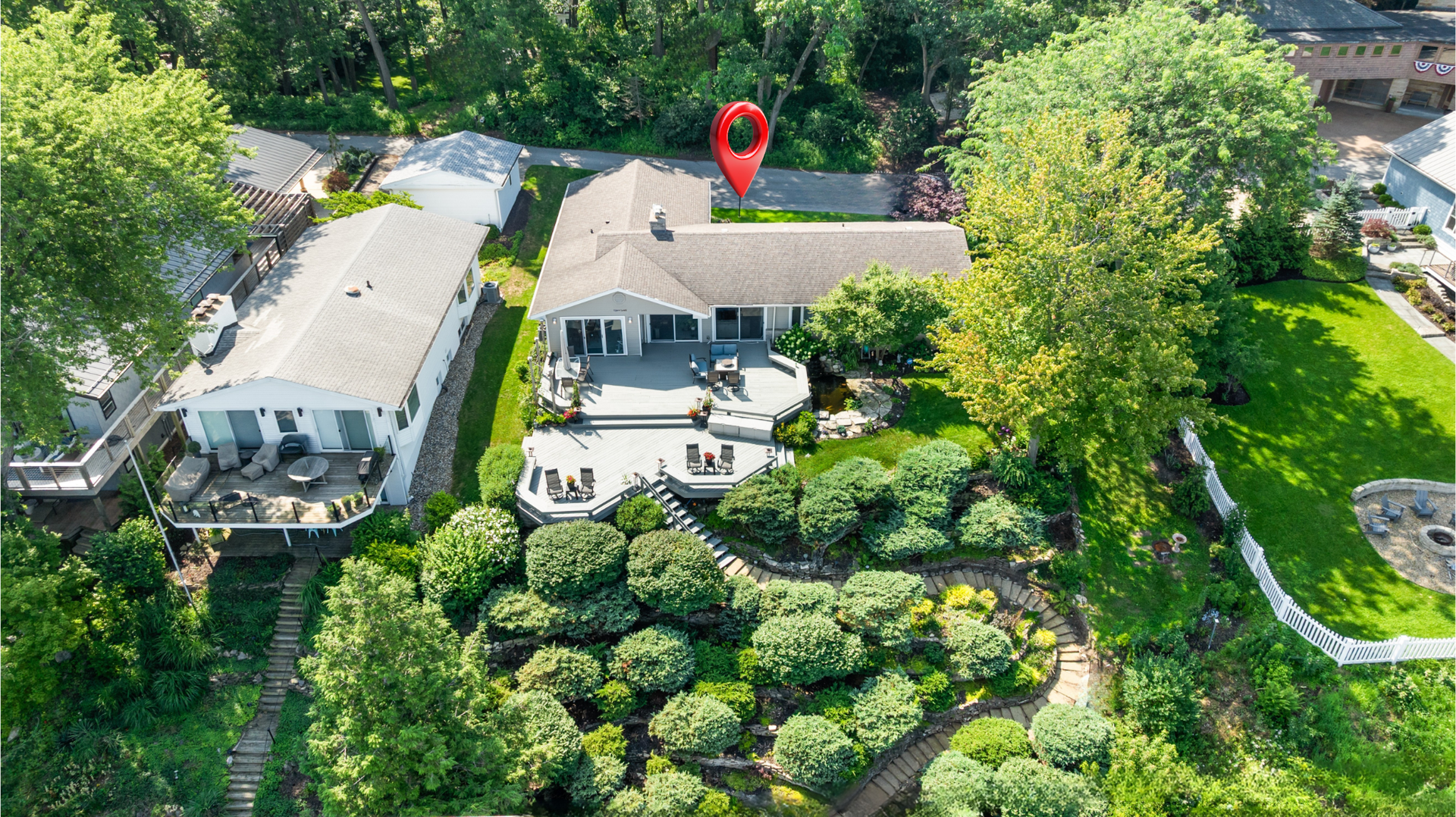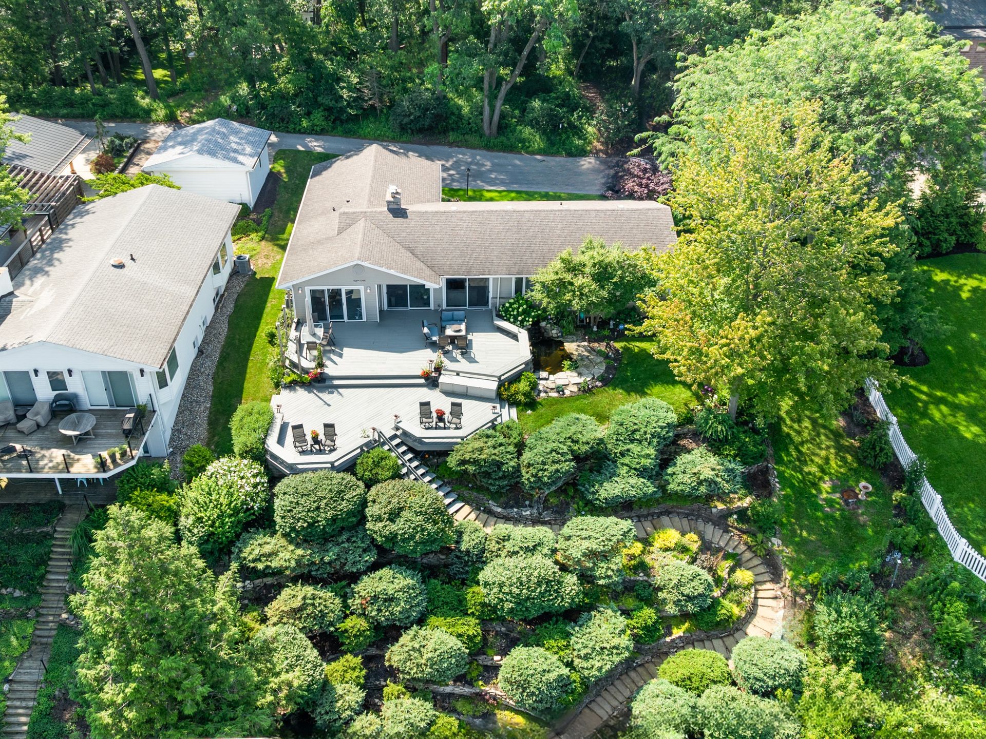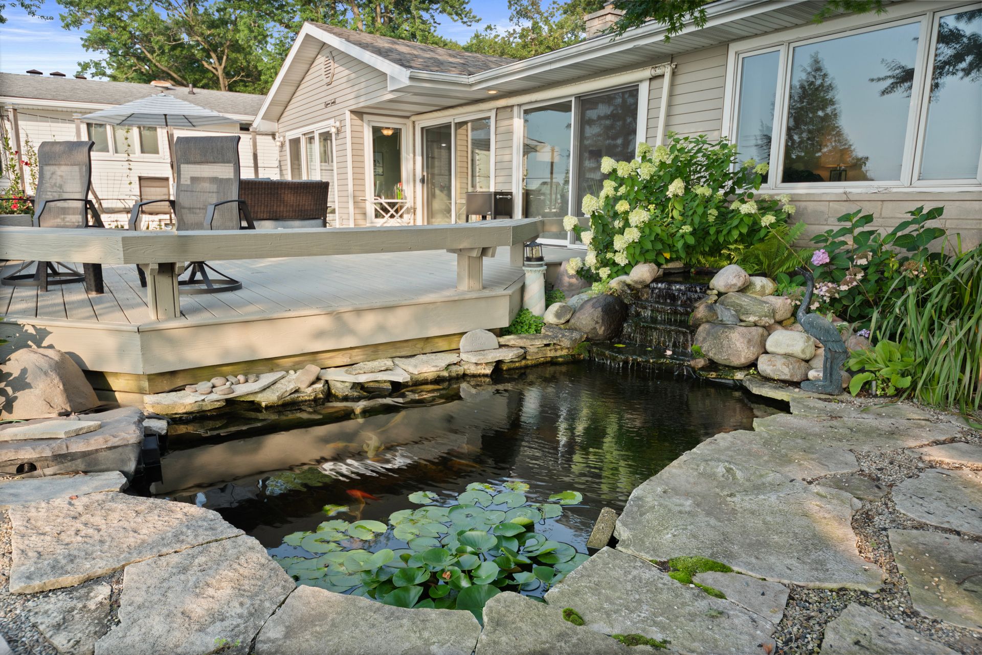 The beautifully landscaped lot includes a serene koi pond and Zen-inspired garden, creating a peaceful outdoor oasis.