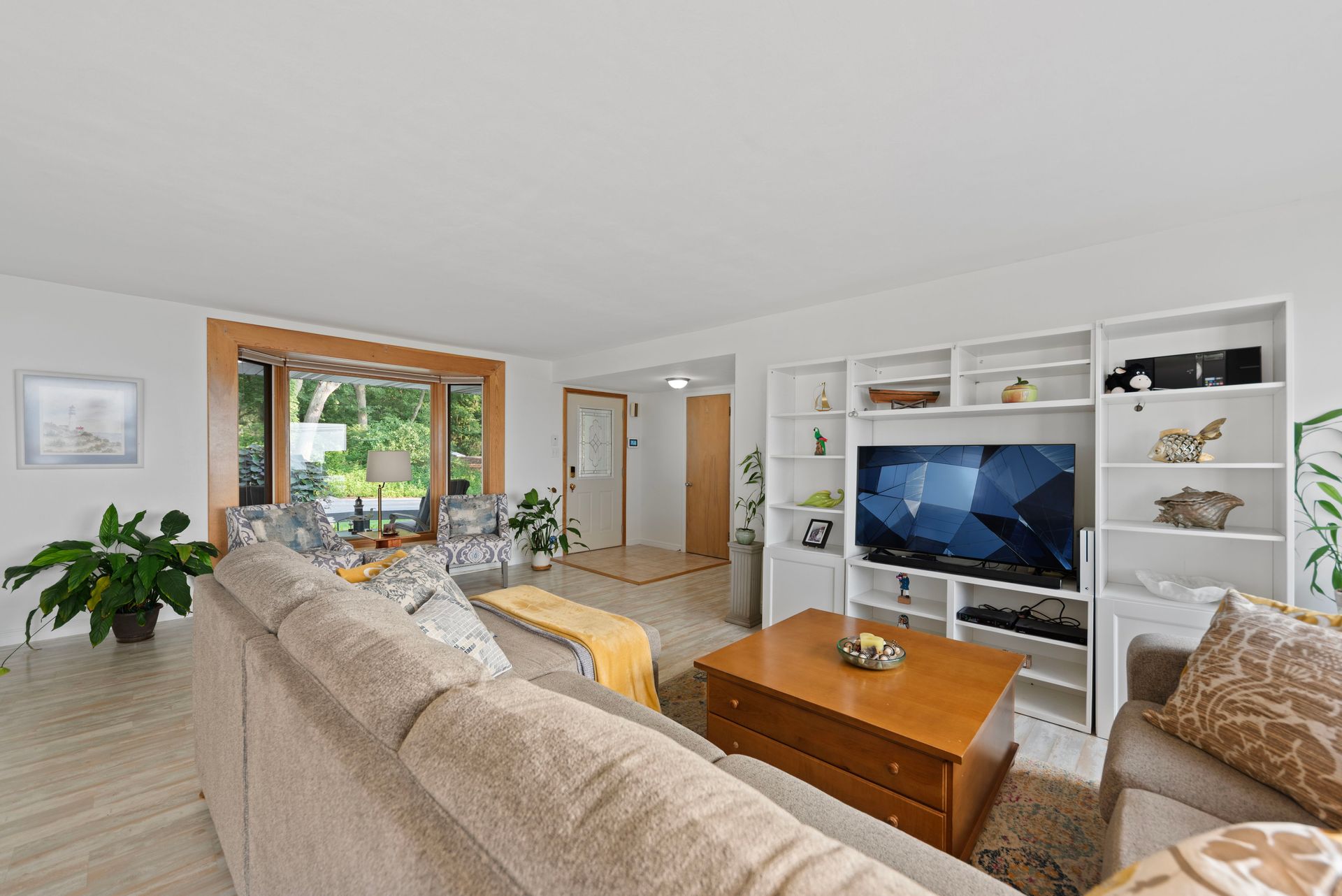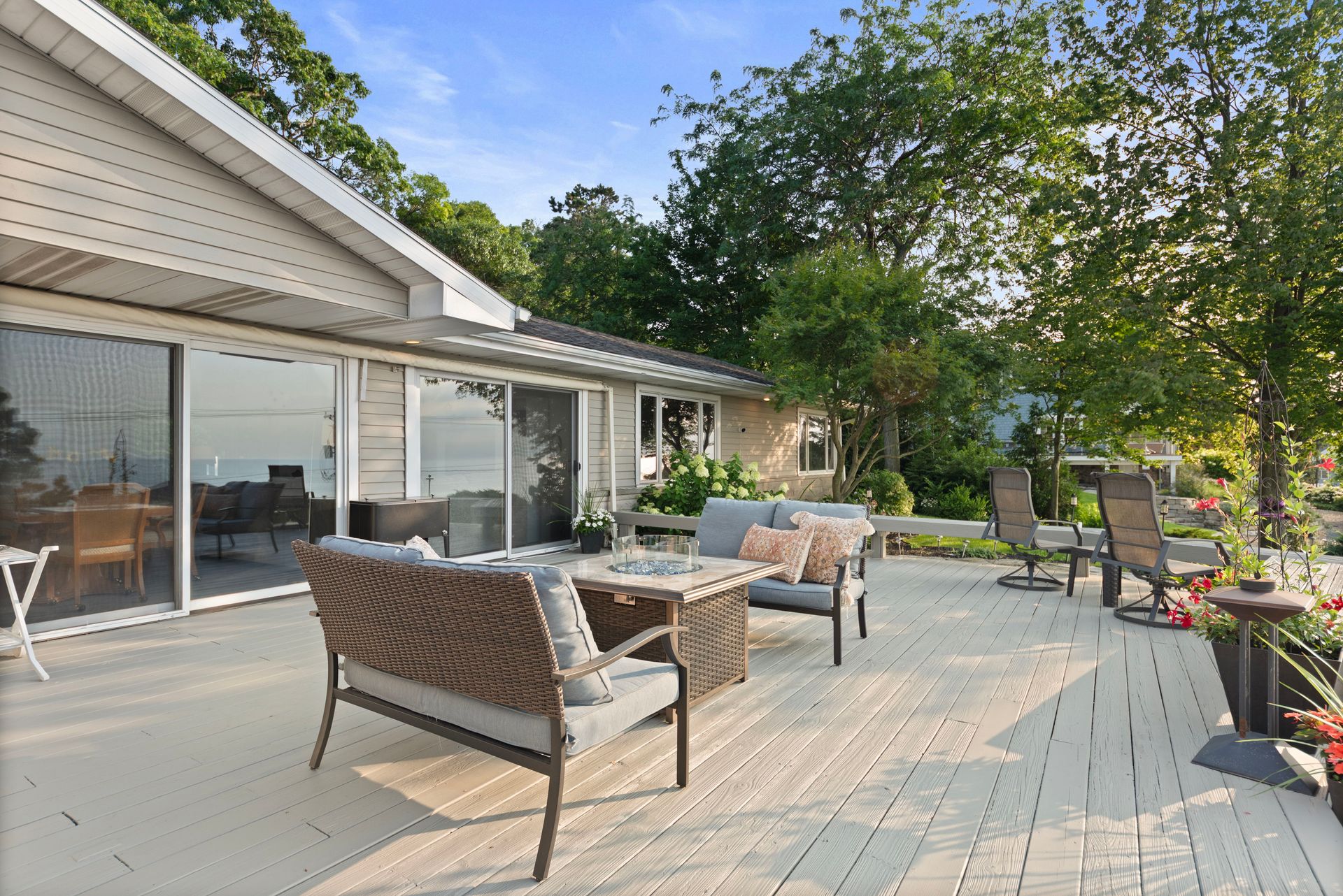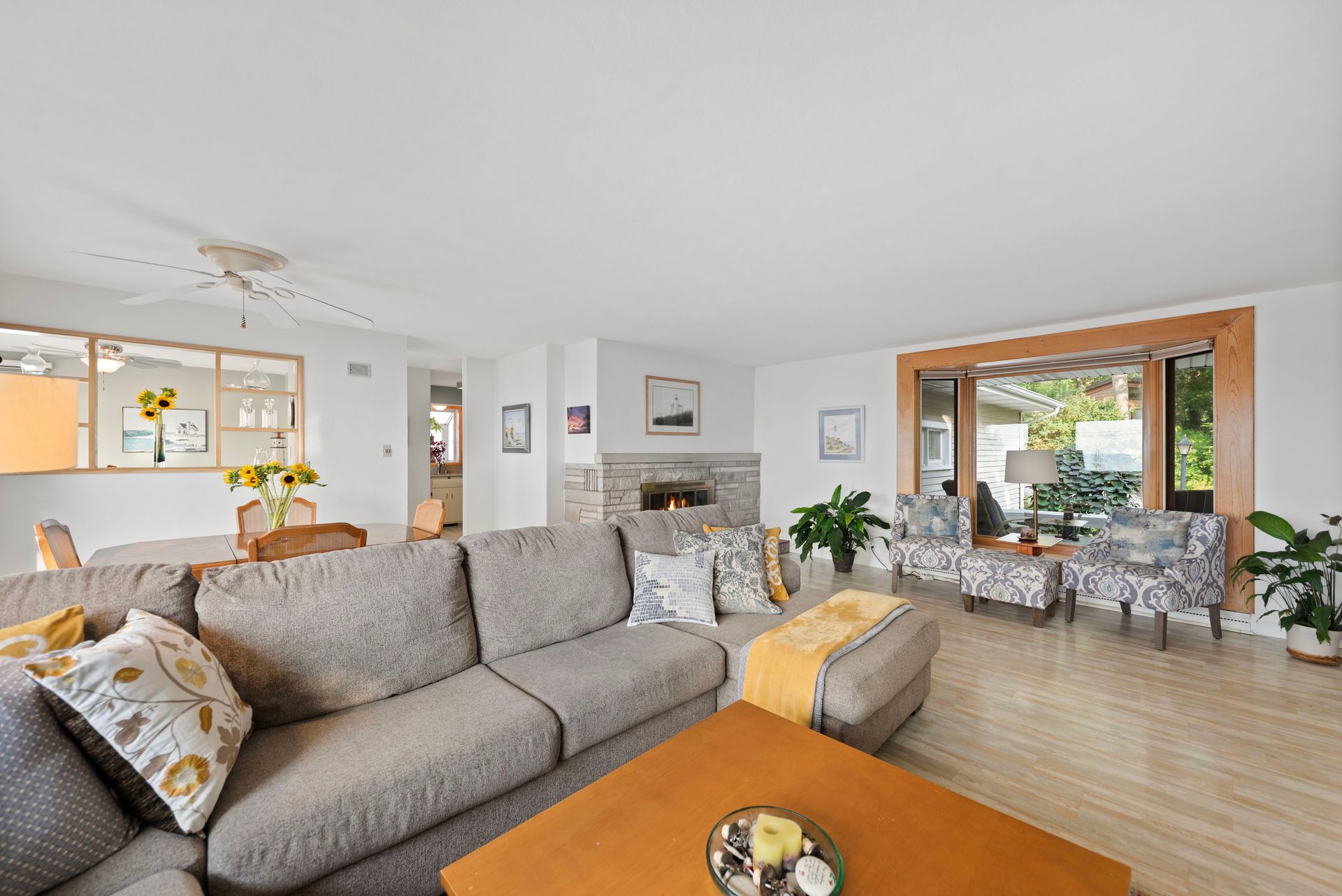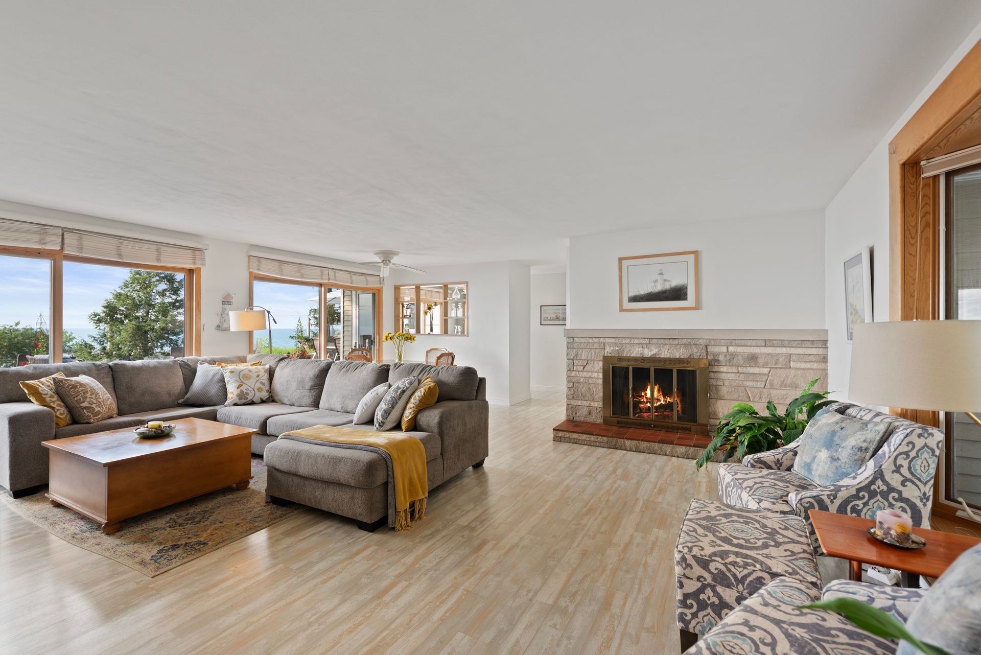 Inside, you'll find easy maintenance laminate floors, a cozy fireplace, and a spacious kitchen with stainless steel appliances and ample cabinetry. The open floor plan enhances natural light and flow throughout. Set on a beautifully landscaped lot in a sought-after Lake Michigan Community, this home blends indoor comfort with exceptional outdoor living.