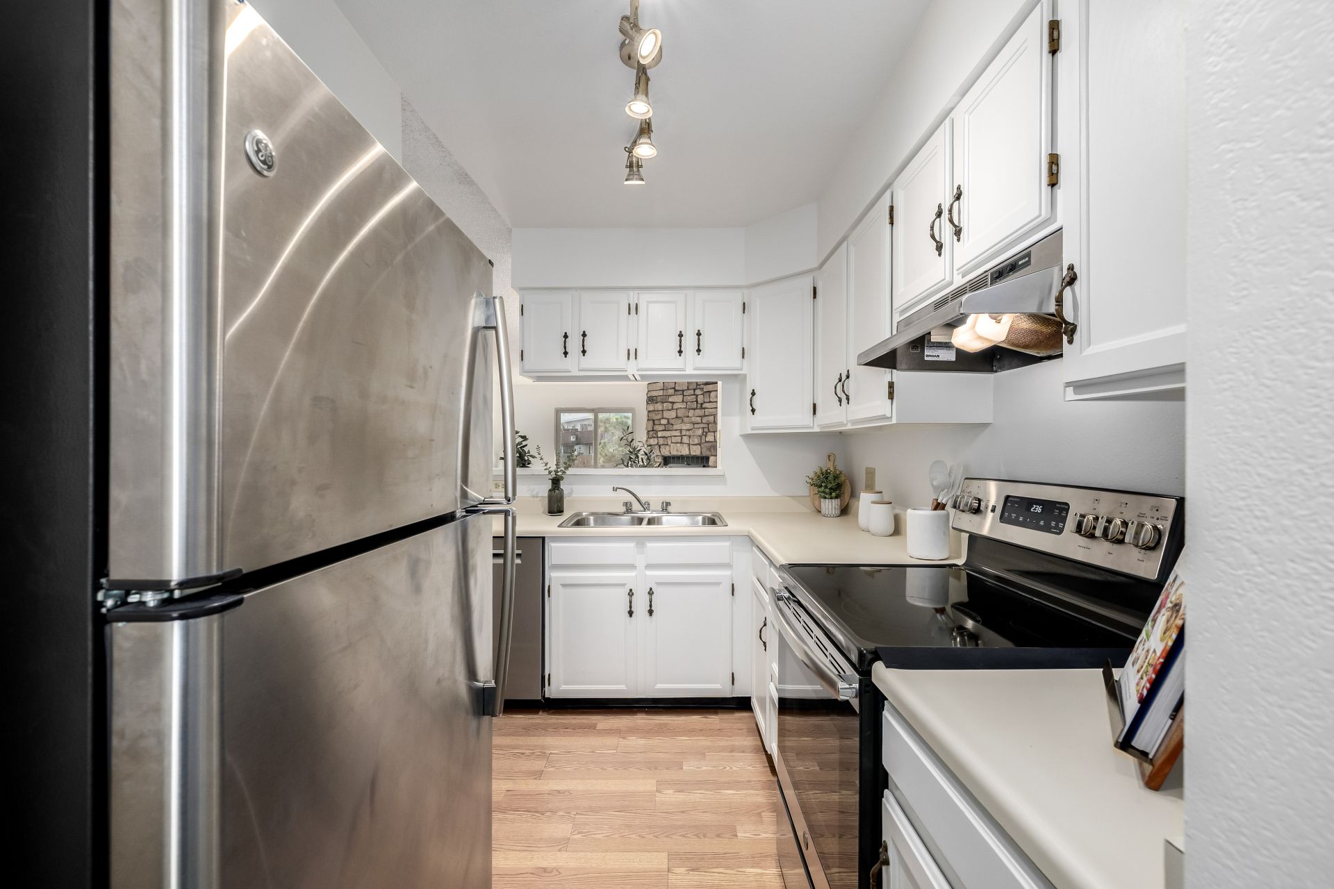 Venture inside and discover the perfect place to call home! This lovely updated 2-bedroom, 2-bath townhome offers comfort, convenience, and a prime location near a park, pond, and walking paths. The main level features a bright, inviting open concept layout and an updated kitchen with fresh paint throughout. New flooring and new carpet provide a clean, modern feel. The spacious living area featuring a rock wood-burning fireplace opens to a private fenced patio overlooking a grassy area — perfect for pets, relaxing outdoors, and easy access to open space. Additional exterior storage is included. Both bathrooms have been thoughtfully updated with stylish finishes. Upstairs laundry adds everyday convenience. Major mechanical updates include a brand-new furnace and hot water heater for added peace of mind. The HOA maintains the community park and pool, enhancing the low-maintenance lifestyle. One exclusive-use parking space is located directly in front of the home, plus open guest parking. Ideally situated near Highway 36 for convenient commuting, shopping, and access to local amenities, this townhome blends comfort, location, and value in a well-maintained community.