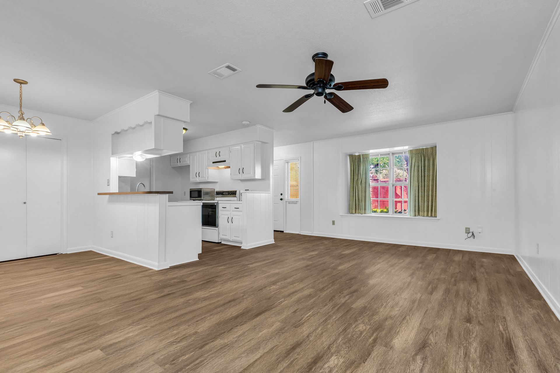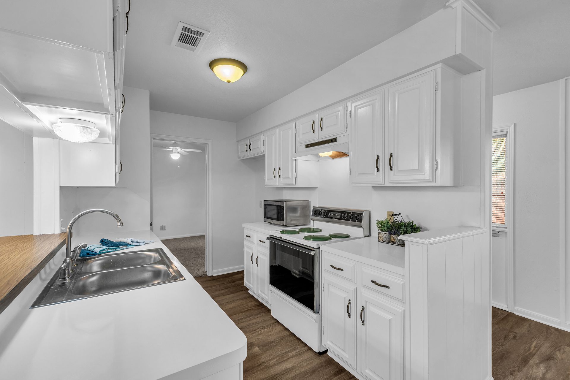 This updated one-story townhome includes A/C and heating in 2024, ducts/insulation in 2025, roof in 2020, exterior paint in 2025, and a fence replaced in 2024. The interior of the townhome features fresh paint throughout, creating a bright and inviting atmosphere. Living, dining, breakfast, bath, and hall areas have vinyl wood-look flooring, while the bedrooms are enhanced with recently installed carpeting. Both bathroom vanities have been replaced, and the second bathroom shower door has been replaced.