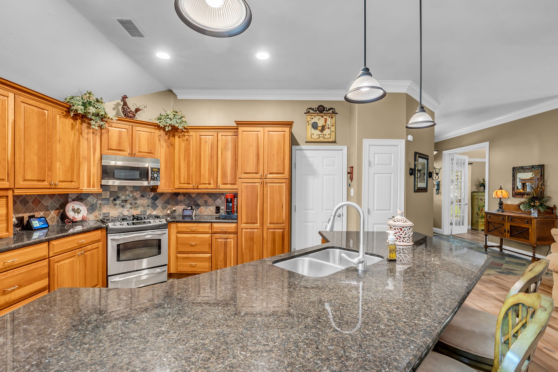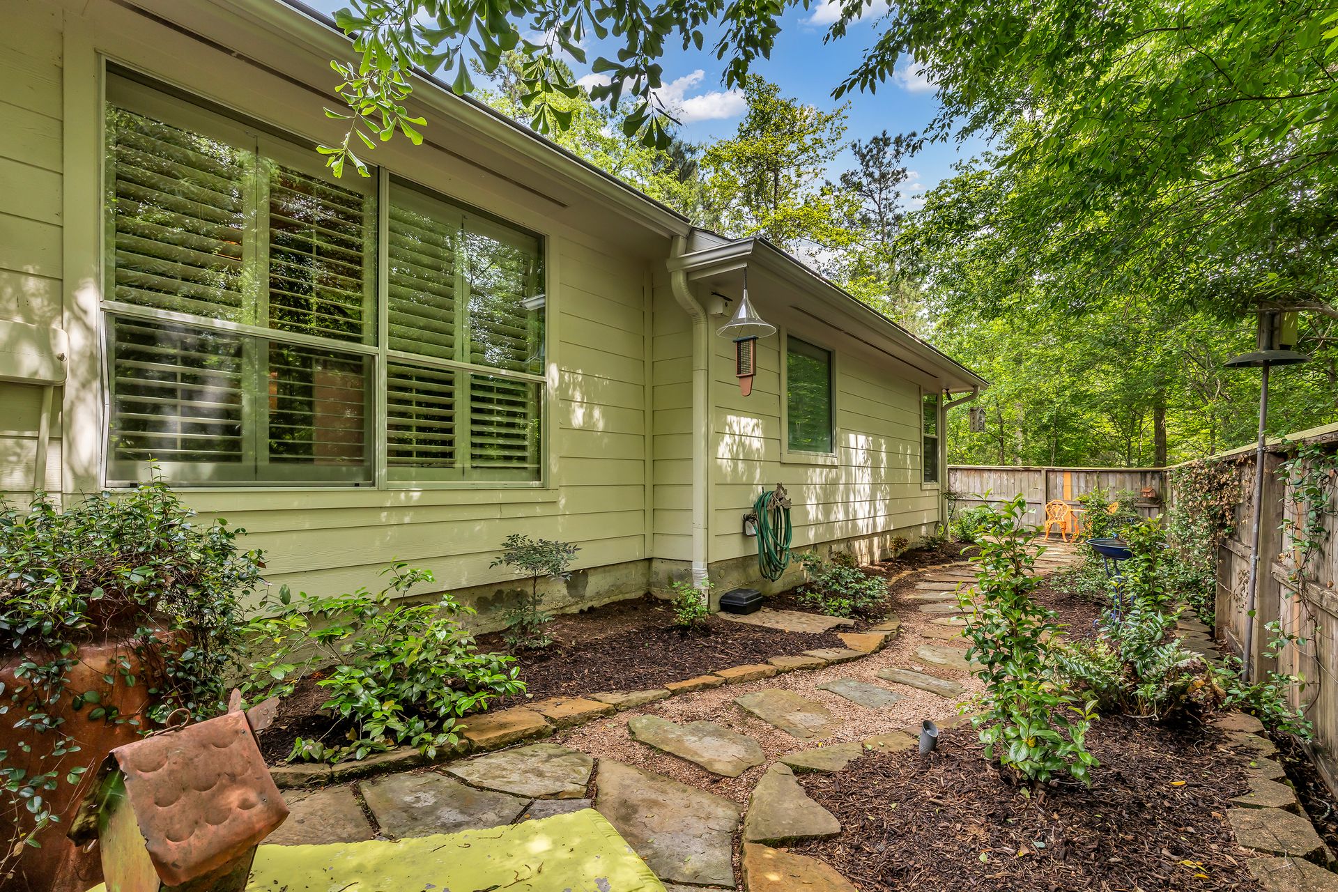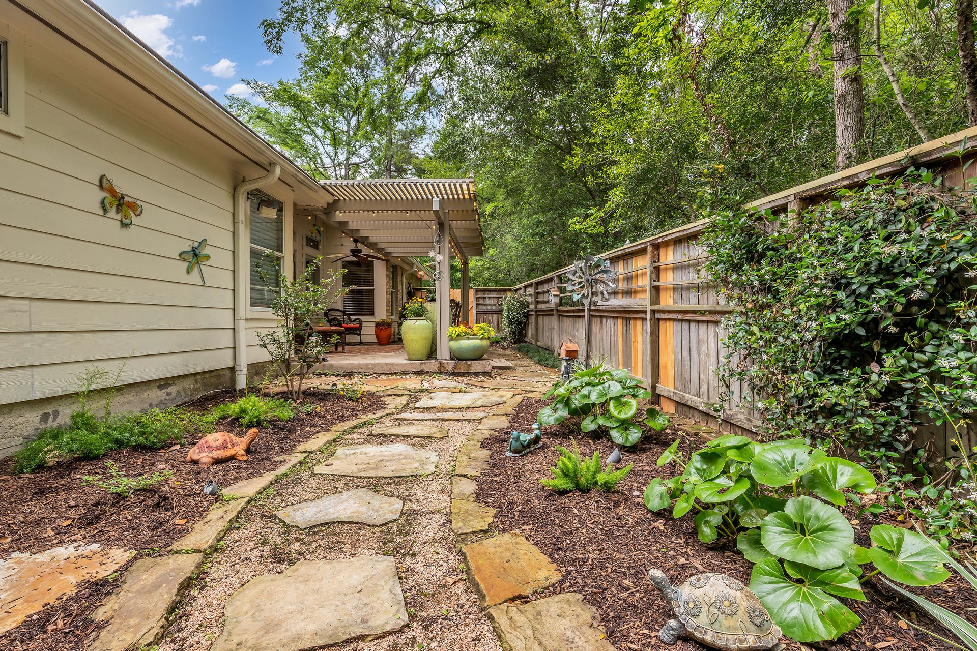 Exceptional former model patio home beautifully positioned with reserves along the side and back, creating a rare, wooded backdrop and remarkable privacy. Lush landscaping, winding stone pathways, and extensive upgrades deliver standout curb appeal and a true garden retreat. Custom wood fence panels open to capture peaceful reserve and greenbelt views, ideal for birdwatching and outdoor enjoyment. Inside, refined finishes include quality wood flooring, rich cherry cabinetry with pull outs, crown molding, pendant lighting, and a detailed fireplace mantel. The designer kitchen opens seamlessly to the family and dining room for easy entertaining. A private study with built-in desk offers an ideal home office. Spacious primary suite with elegant double vanity, two walk-in closets, separate shower, and soaking tub. Two secondary bedrooms and hall bath, with one being a flex space. Covered patio with nice views complete this beautifully appointed home.