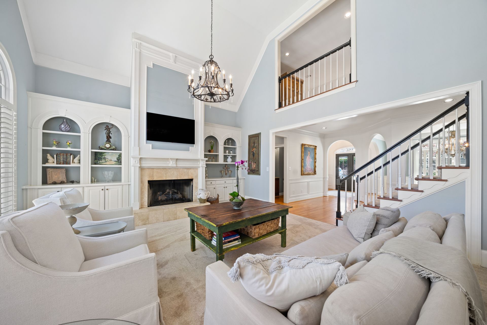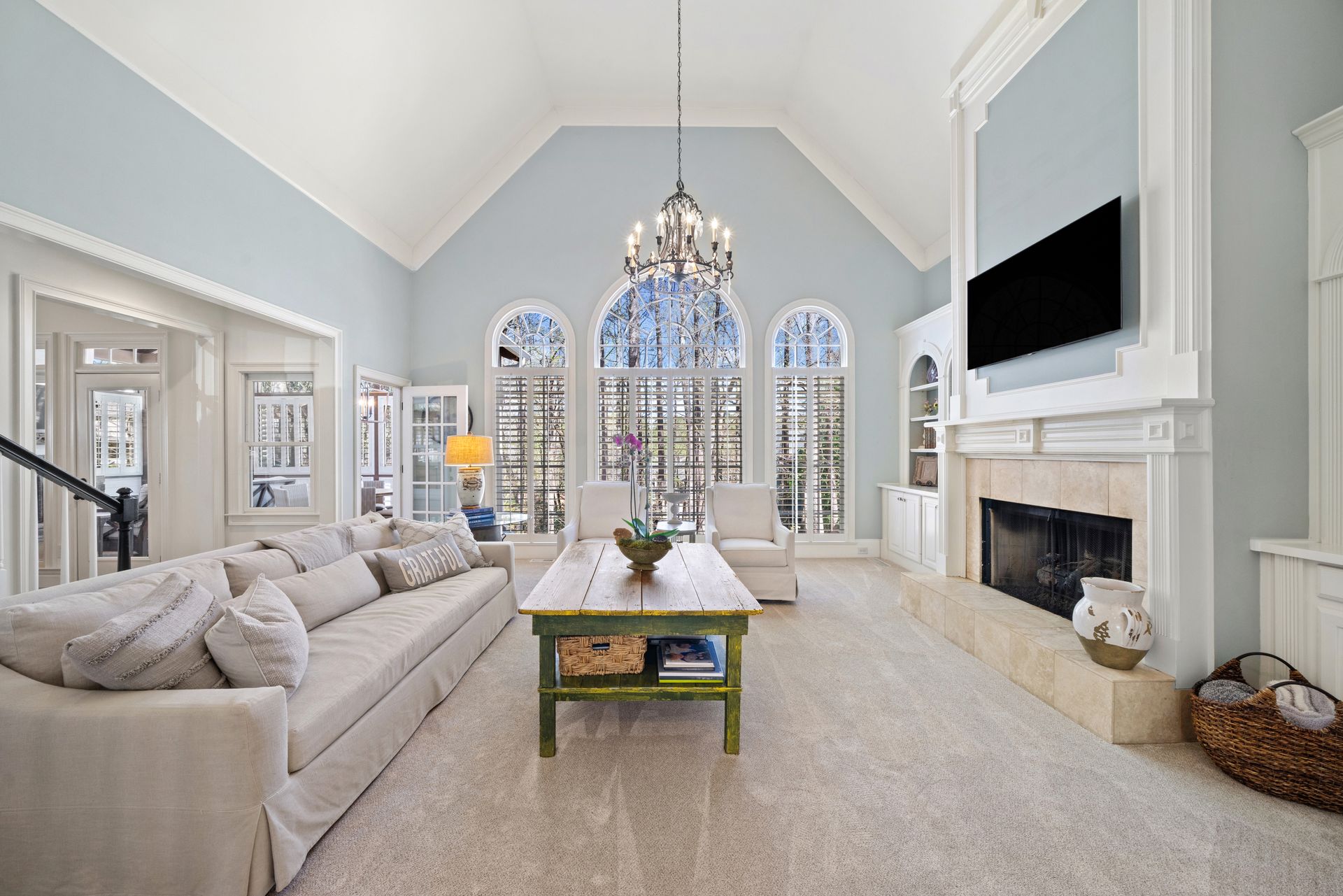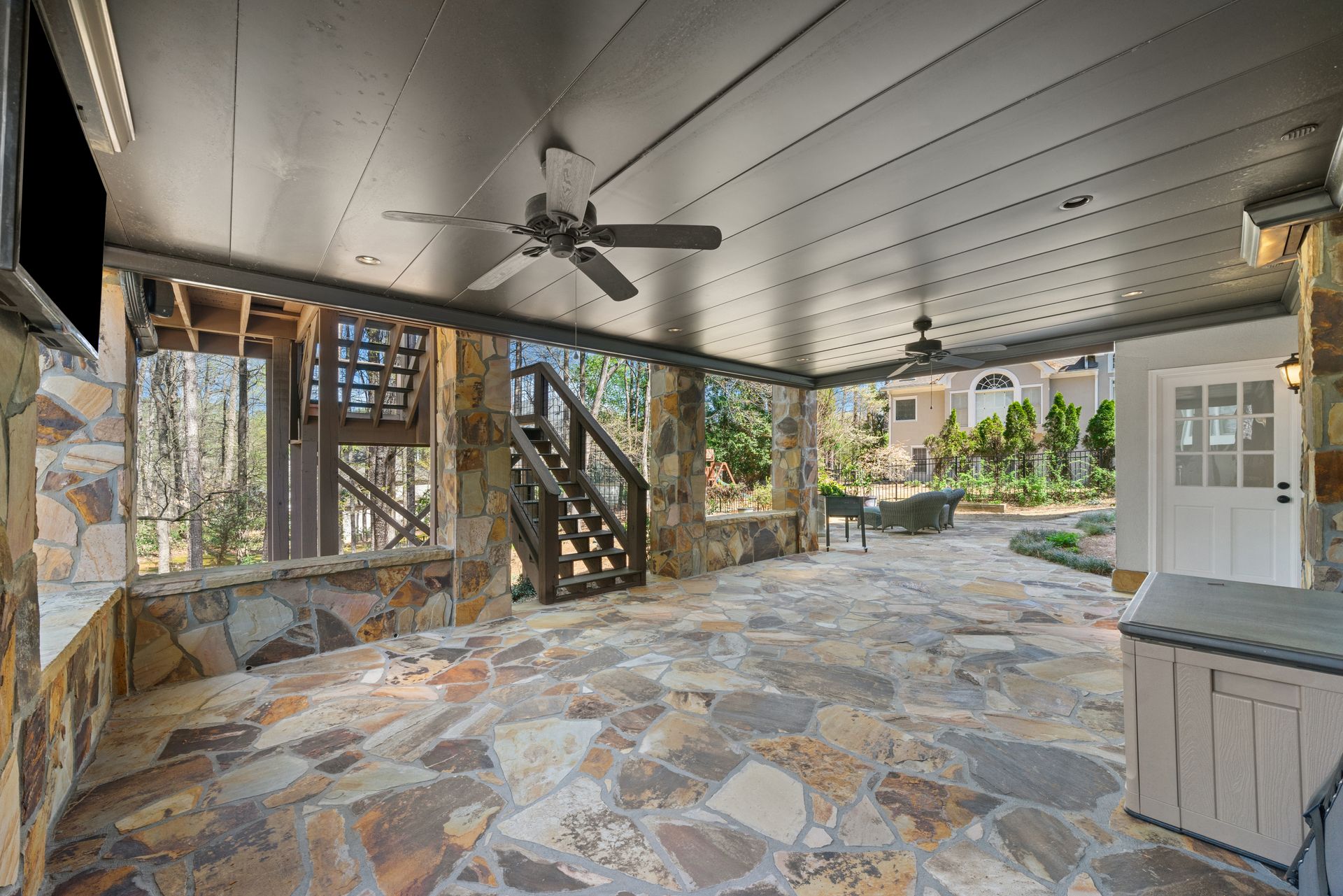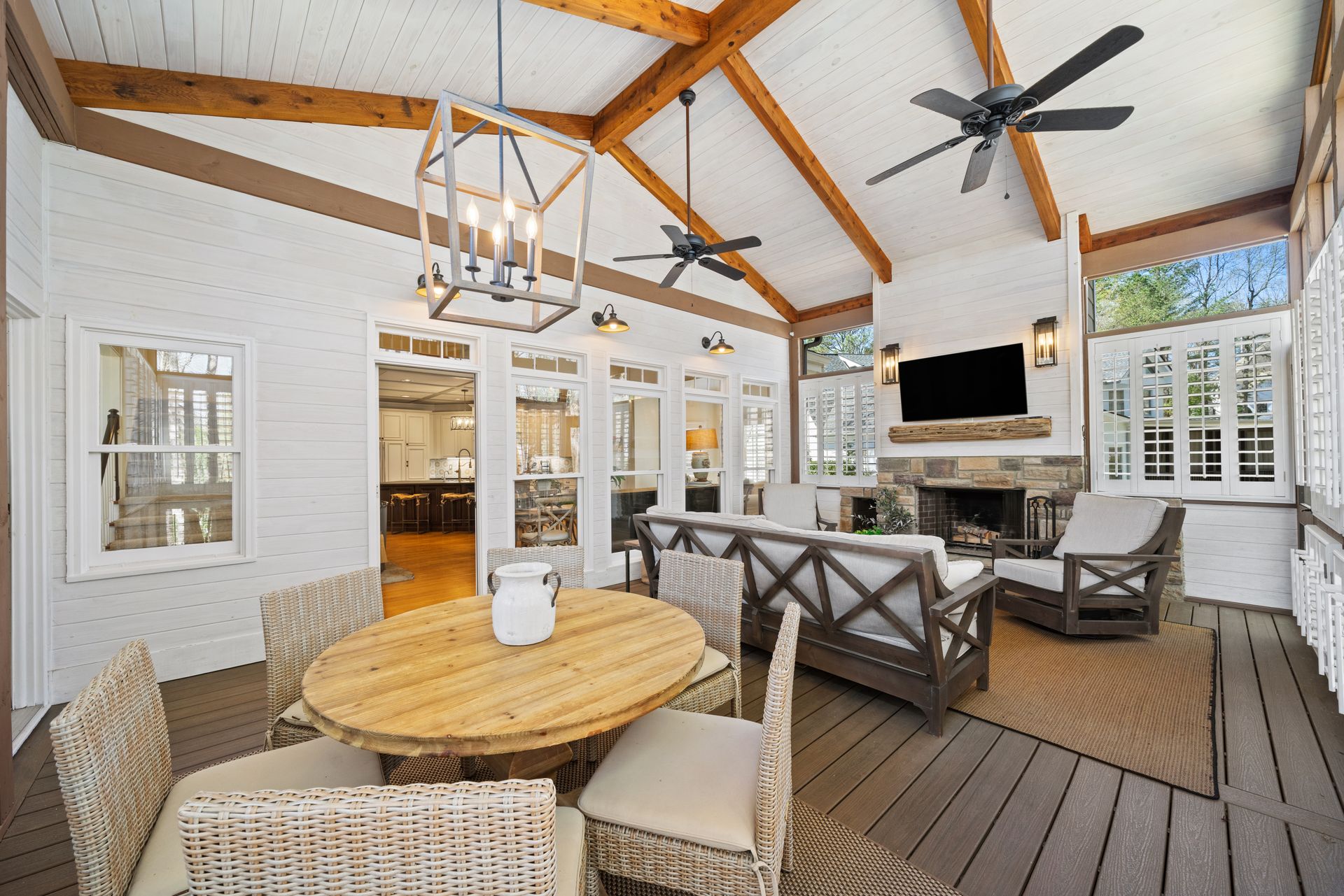 This approximately 6,355 square foot home offers five bedrooms and four and a half bathrooms. The main level features a spacious outdoor living space with a fireplace and soaring beamed ceiling, as well as a stone patio and a private backyard. The interior boasts hardwood floors and new carpeting throughout.