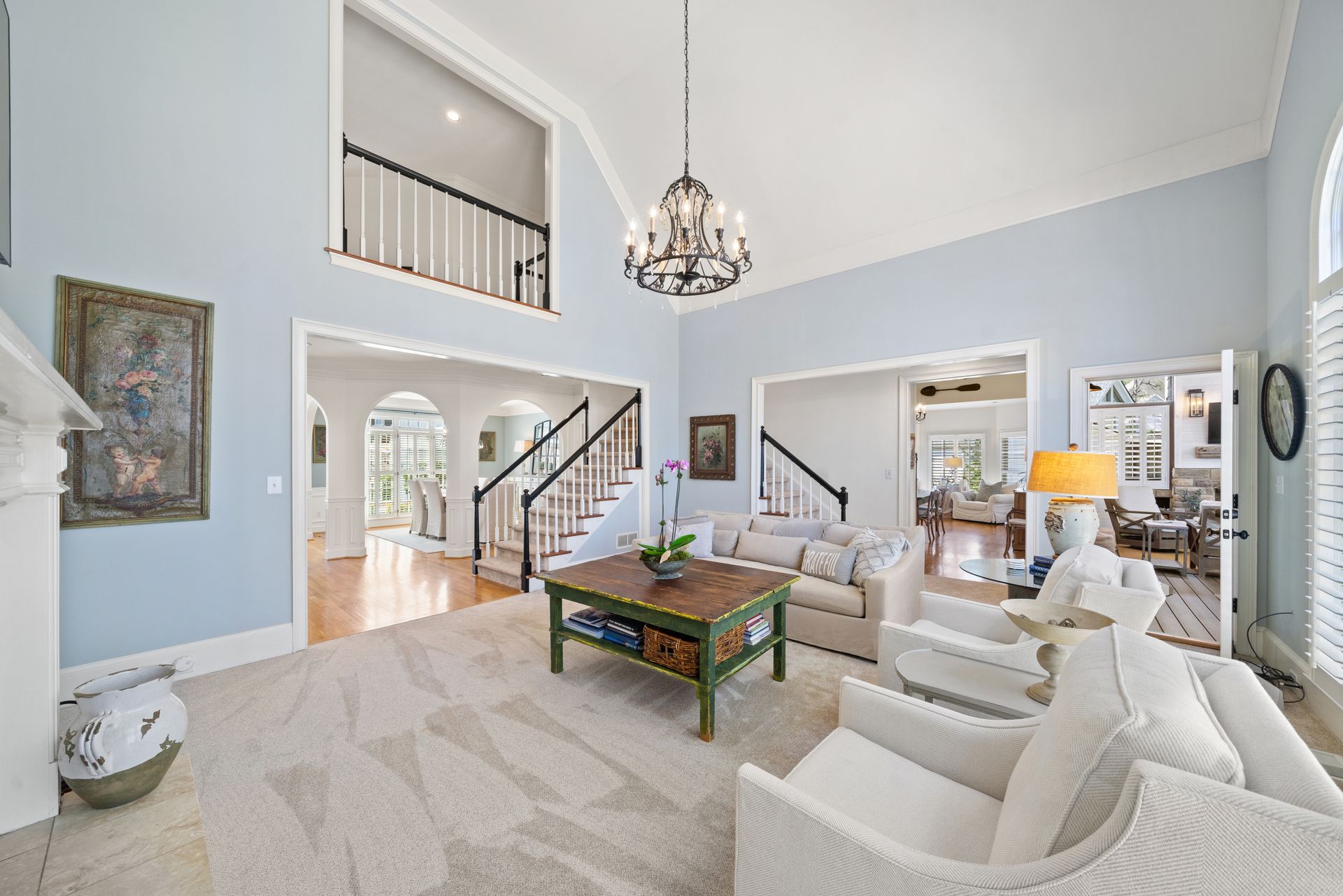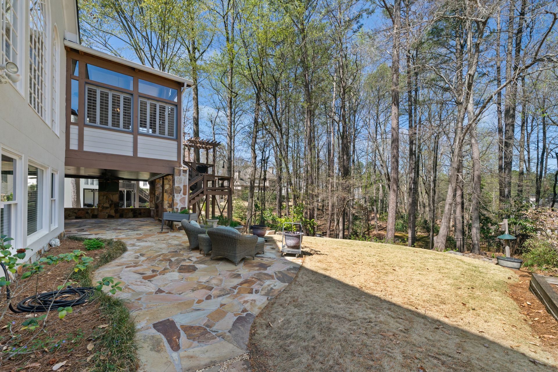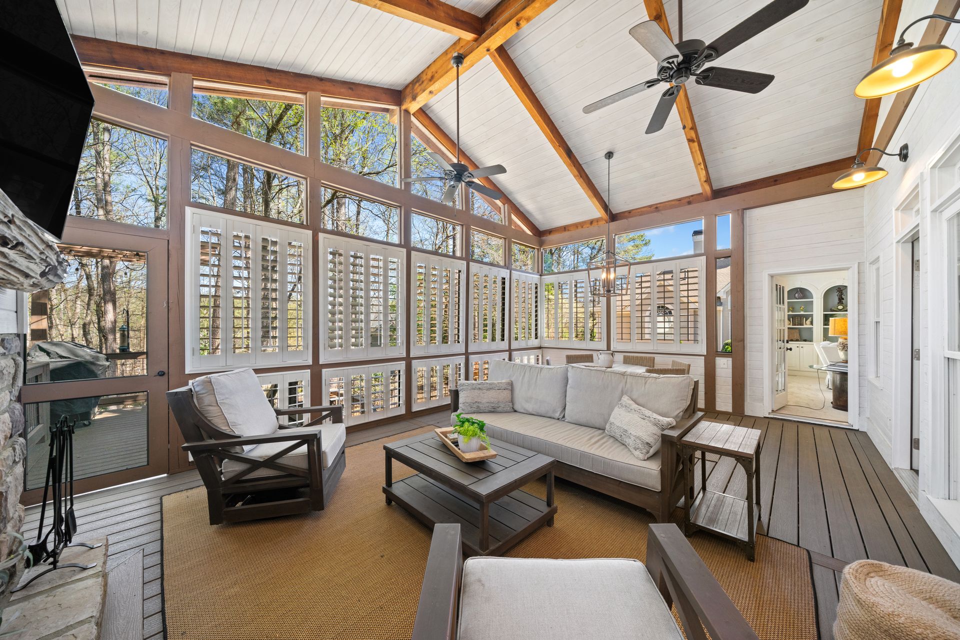 This approximately 6,355 square foot home offers five bedrooms and four and a half bathrooms. The main level features a spacious outdoor living space with a fireplace and soaring beamed ceiling, as well as a stone patio and a private backyard. The interior boasts hardwood floors and new carpeting throughout.
