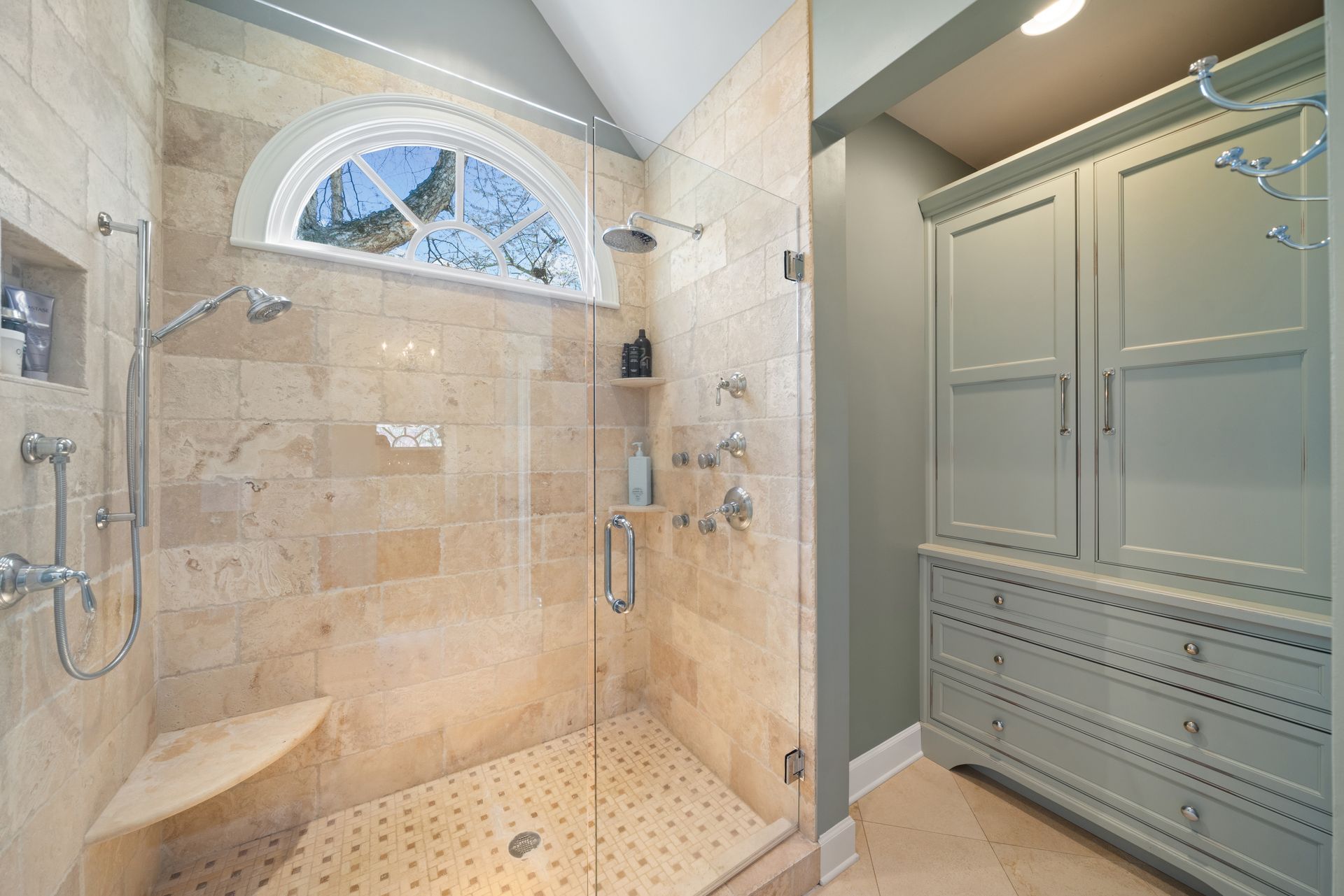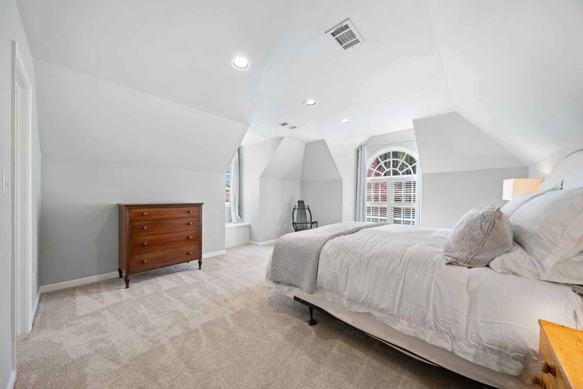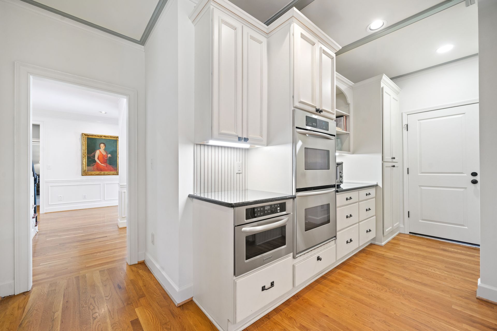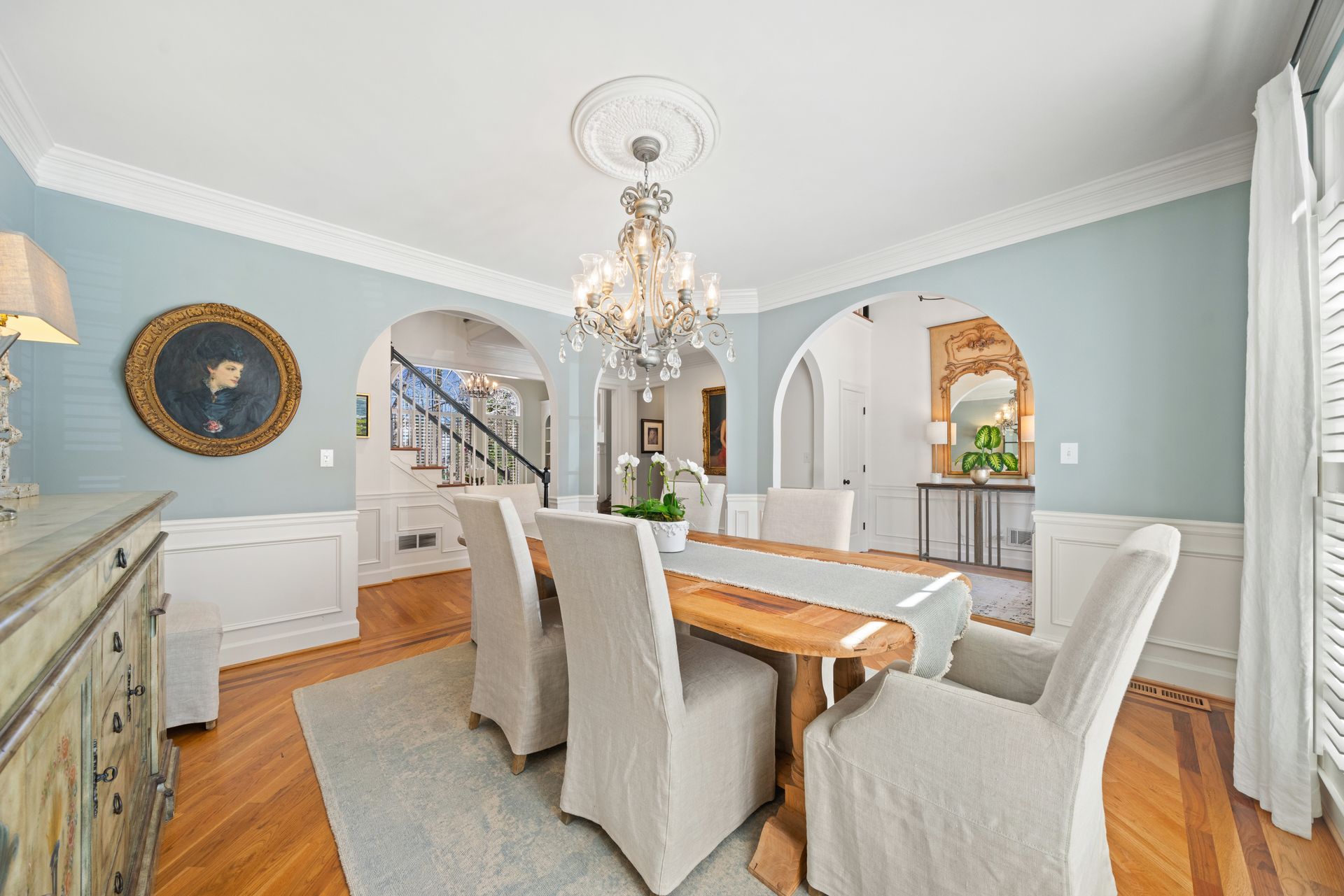 The primary bedroom is located on the main level and has been recently renovated, as has the kitchen. The kitchen is equipped with new stainless steel appliances, including a six-burner Dacor range. There is also a large formal dining room and a spacious living room with a fireplace and built-in bookcases.