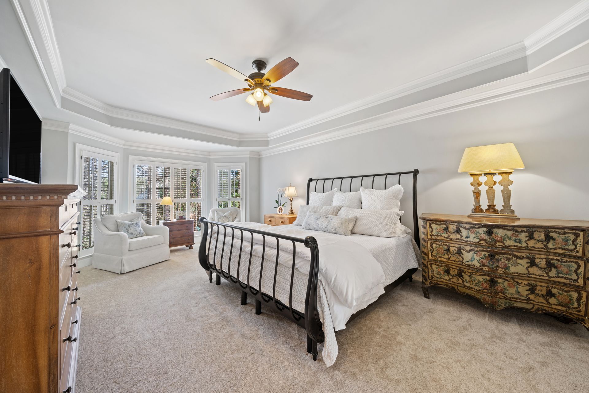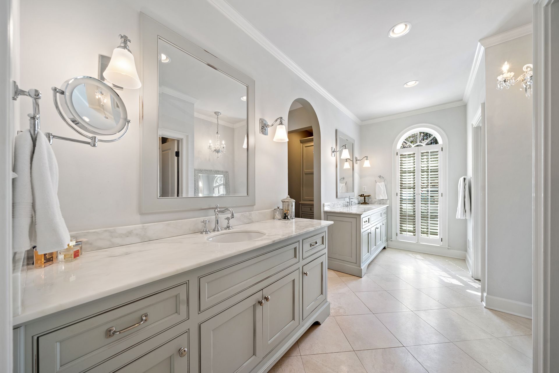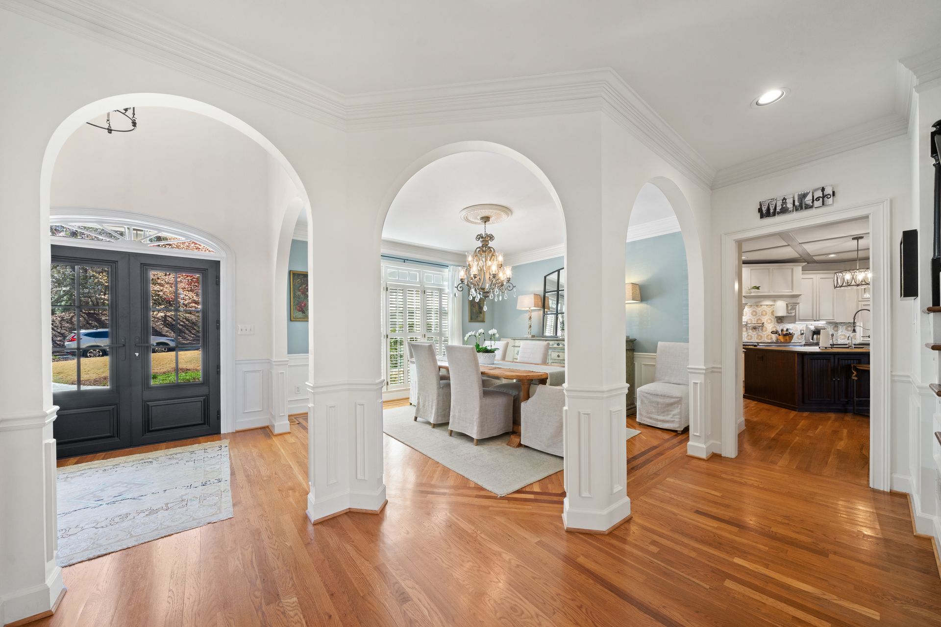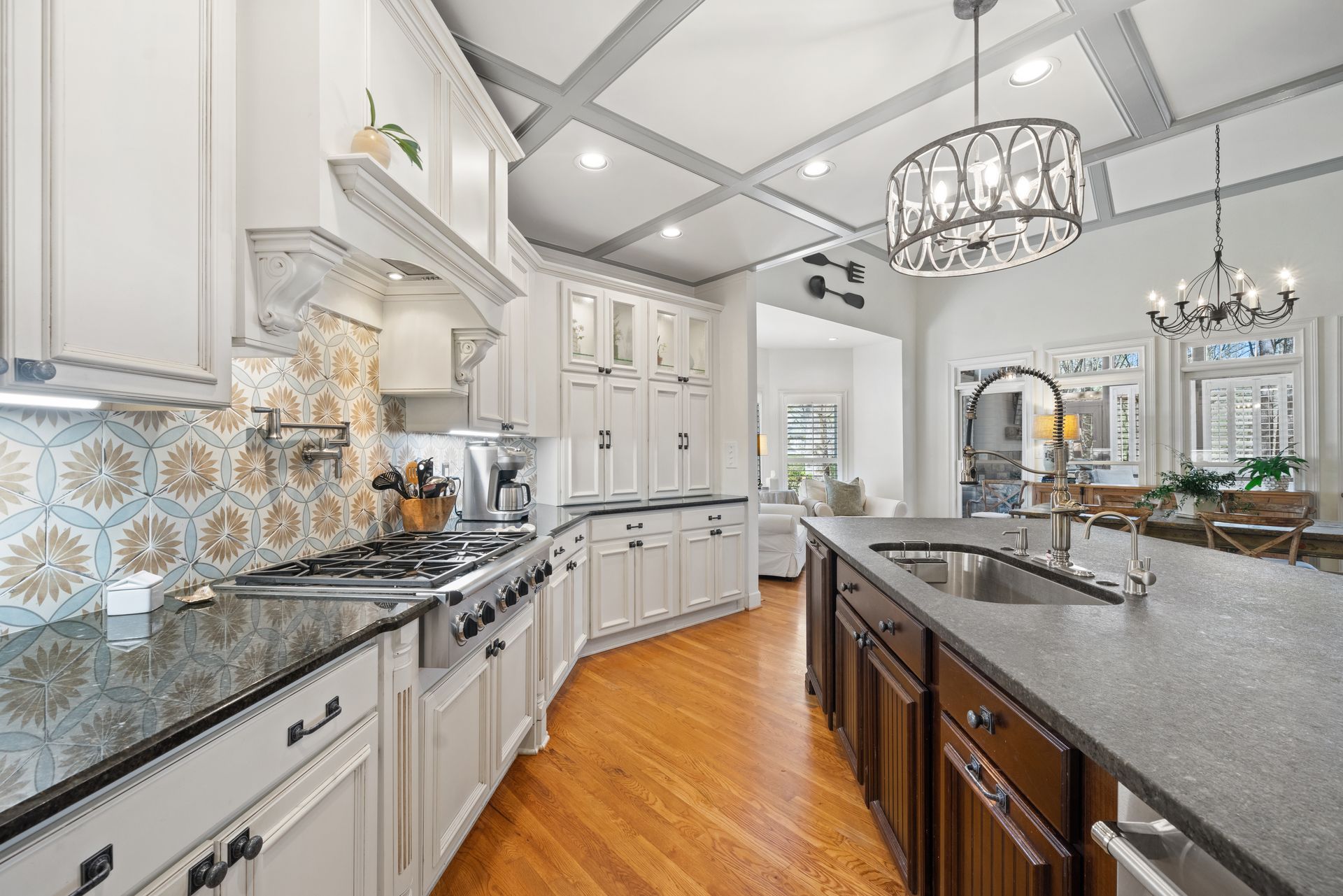 The primary bedroom is located on the main level and has been recently renovated, as has the kitchen. The kitchen is equipped with new stainless steel appliances, including a six-burner Dacor range. There is also a large formal dining room and a spacious living room with a fireplace and built-in bookcases.