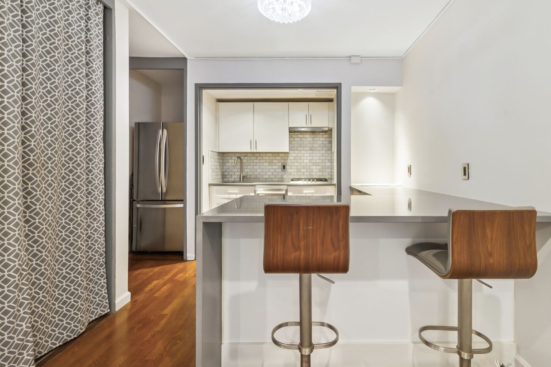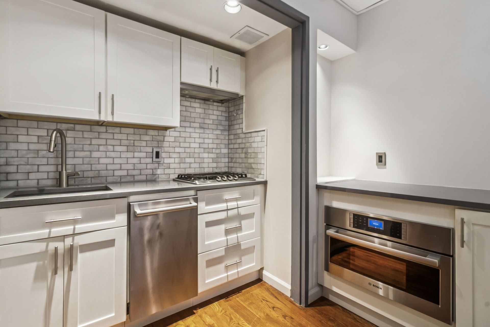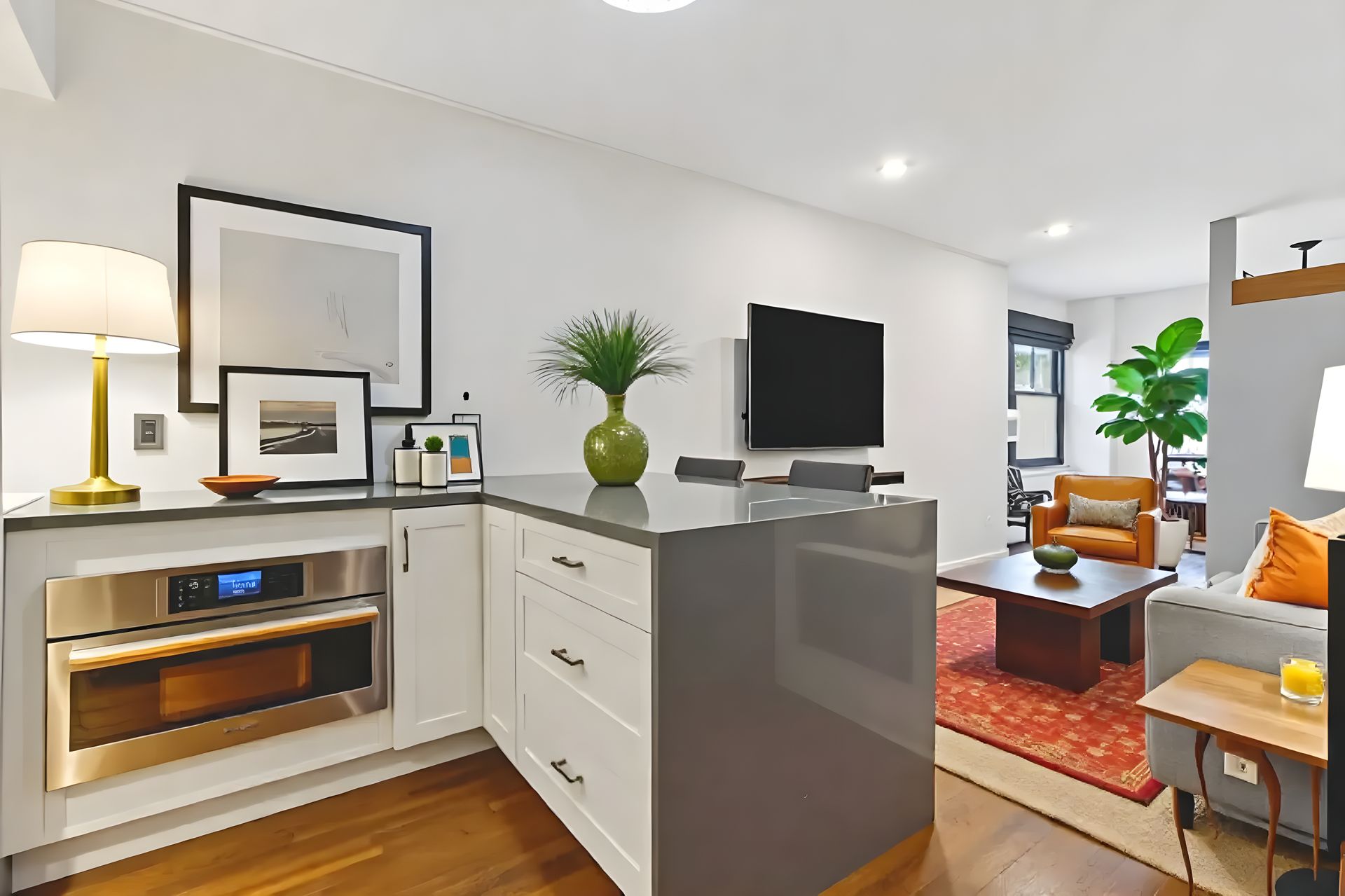 This renovated studio at 3050 Edwin Avenue, #2D in Fort Lee’s Linwood Park blends style with smart design. The open kitchen features Bosch stainless steel appliances, a steam oven, a full-size French door refrigerator, quartz counters, a breakfast bar, recessed lighting, and sleek cabinetry. Dark hardwood floors flow through the space, while custom California Closets and Elfa systems—including a rare walk-in closet—to maximize storage. The bathroom is updated and fresh.