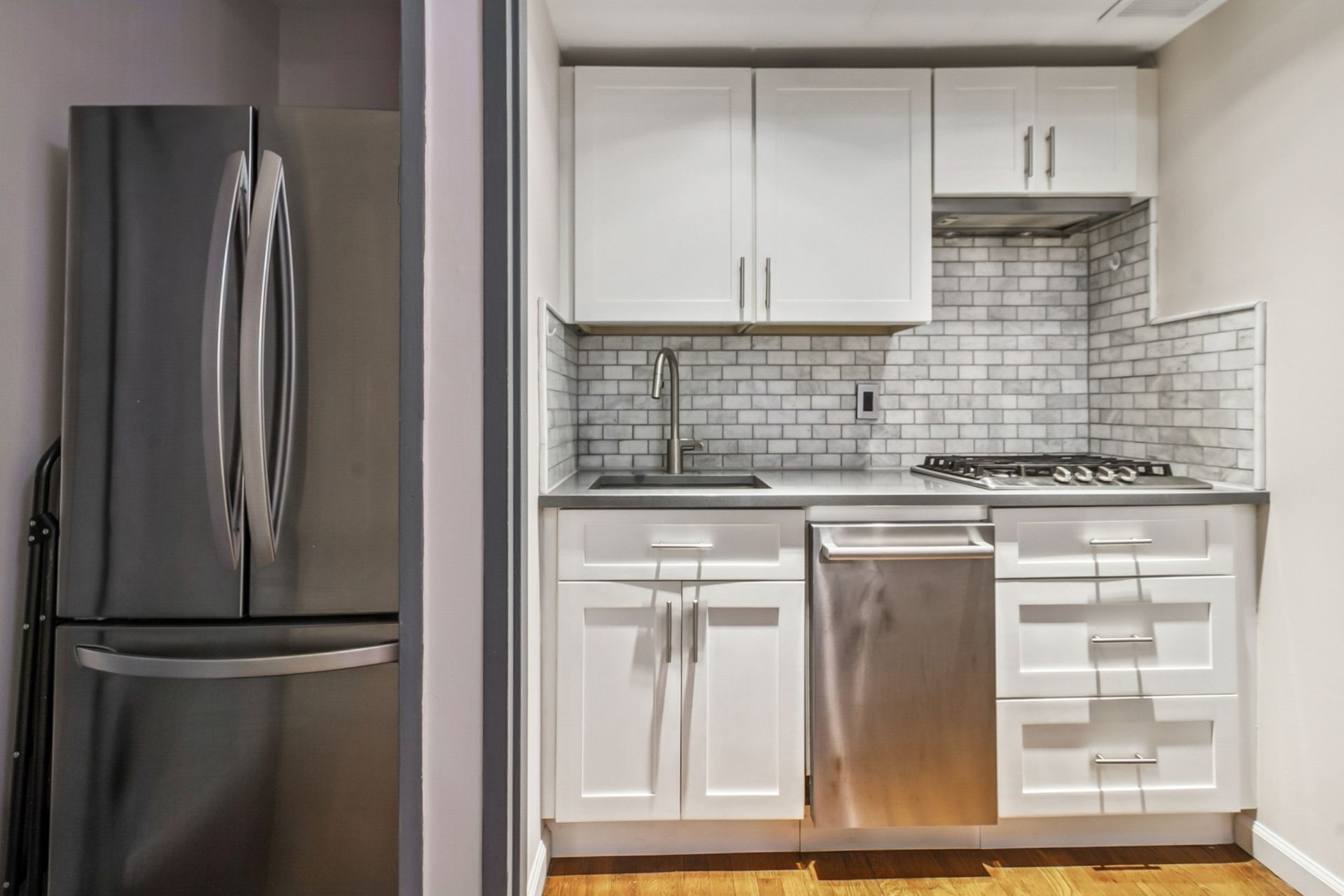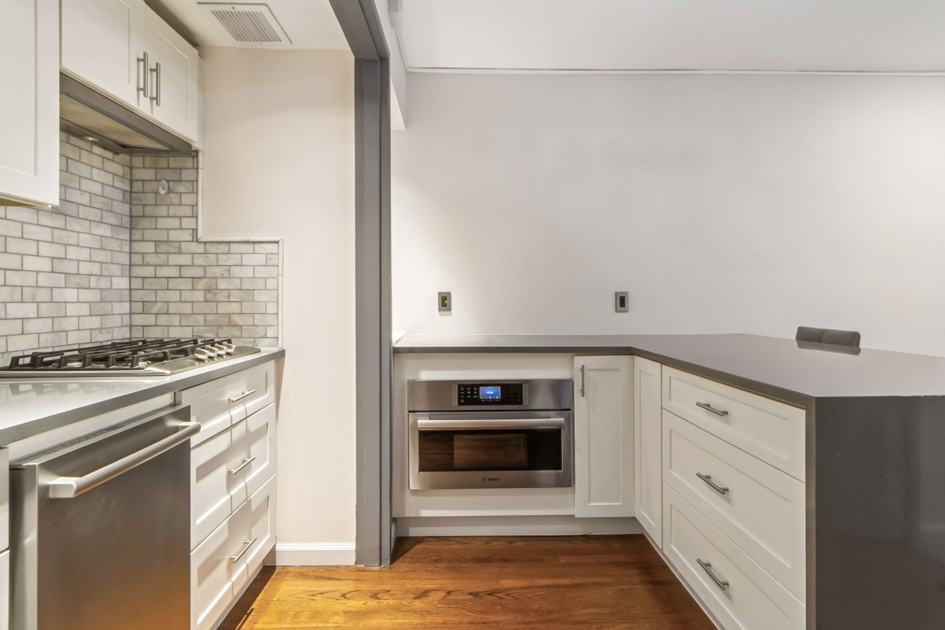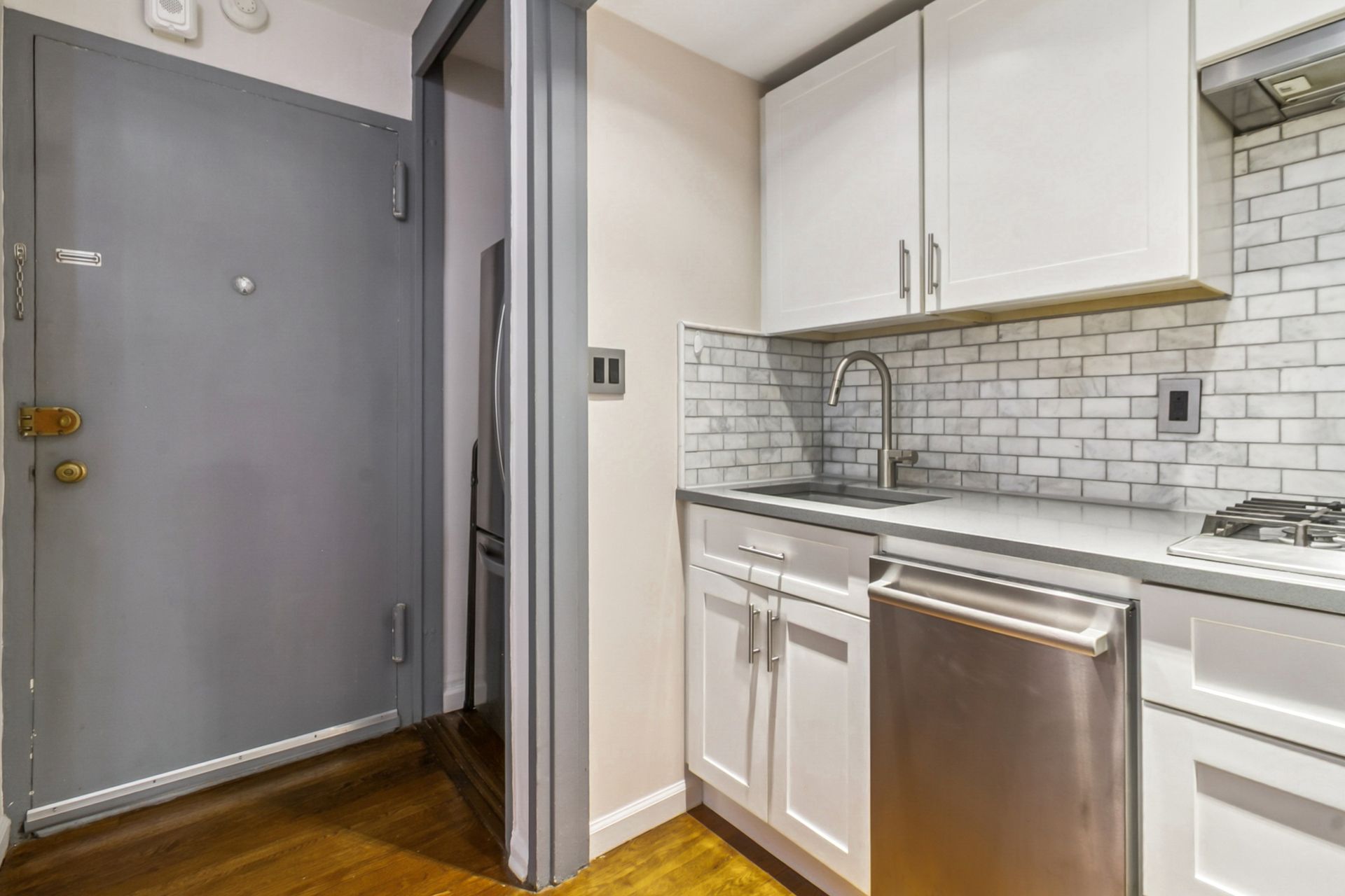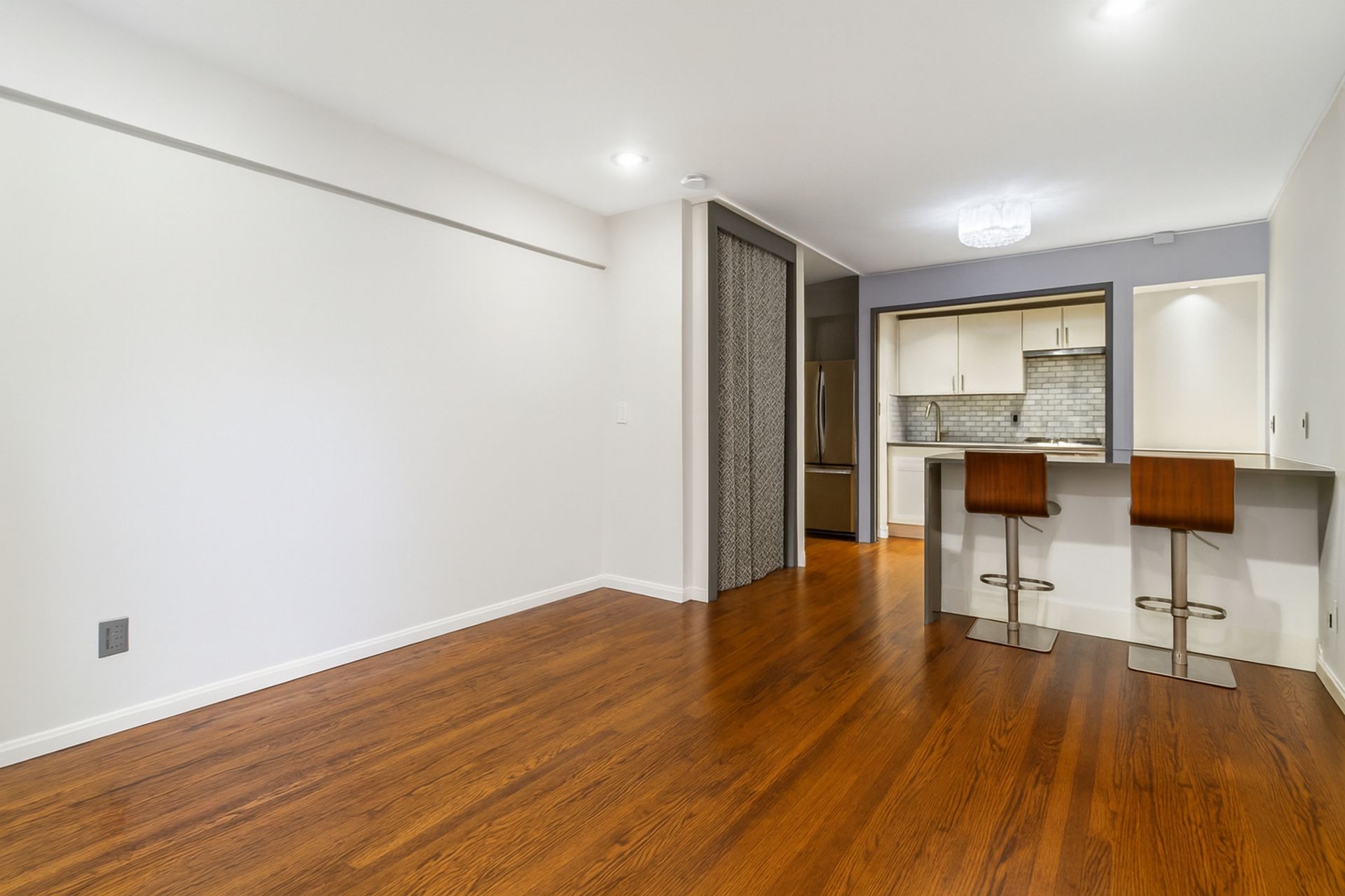 This renovated studio at 3050 Edwin Avenue, #2D in Fort Lee’s Linwood Park blends style with smart design. The open kitchen features Bosch stainless steel appliances, a steam oven, a full-size French door refrigerator, quartz counters, a breakfast bar, recessed lighting, and sleek cabinetry. Dark hardwood floors flow through the space, while custom California Closets and Elfa systems—including a rare walk-in closet—to maximize storage. The bathroom is updated and fresh.