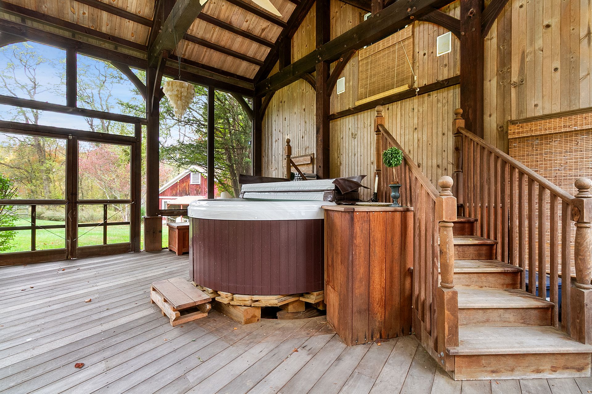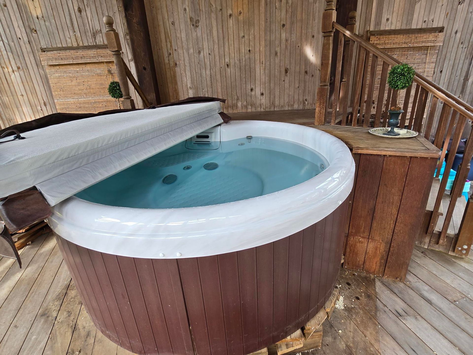 The property also includes a hot tub, offering a relaxing retreat after a long day. The surrounding landscape and potential for privacy make this an ideal setting for those seeking a peaceful, natural environment.