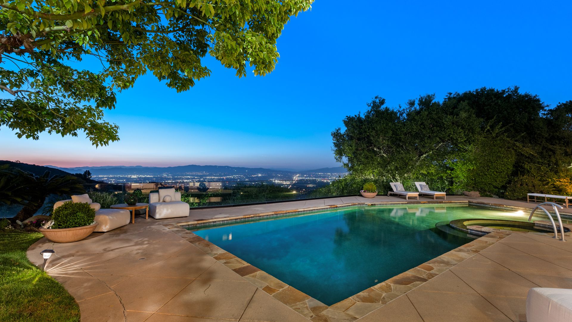Perched atop a tranquil, gated street with sweeping canyon and city light views, this exquisite tennis estate offers privacy, elegance, and impeccable craftsmanship. Nestled within lush, park-like grounds, the property features a full-size lighted tennis court, resort-style pool and spa, and a seamless indoor-outdoor flow. Colorful gardens, vibrant sunsets, and serene sunrises create a truly magical setting, enhanced by modern security and updated systems for effortless living.