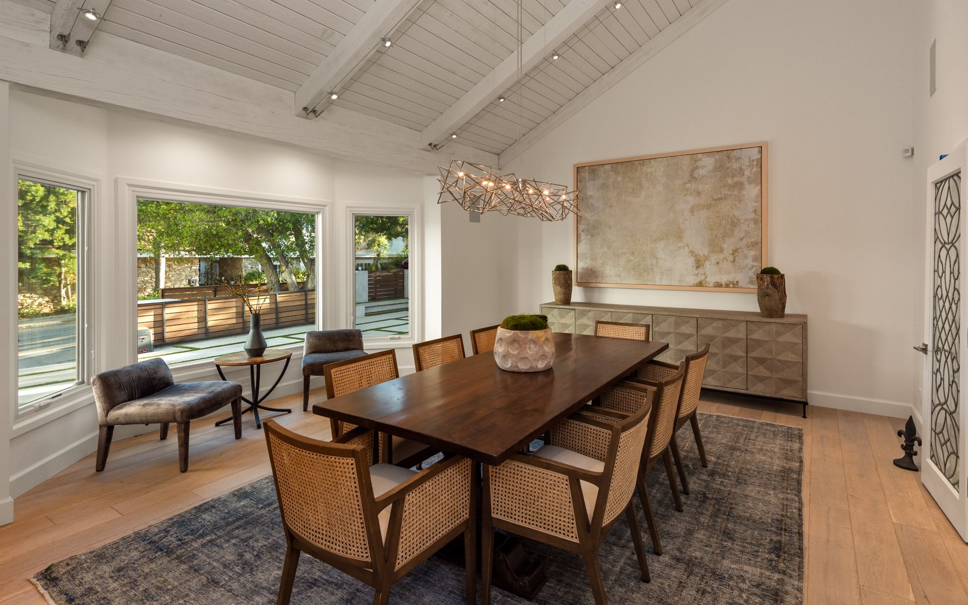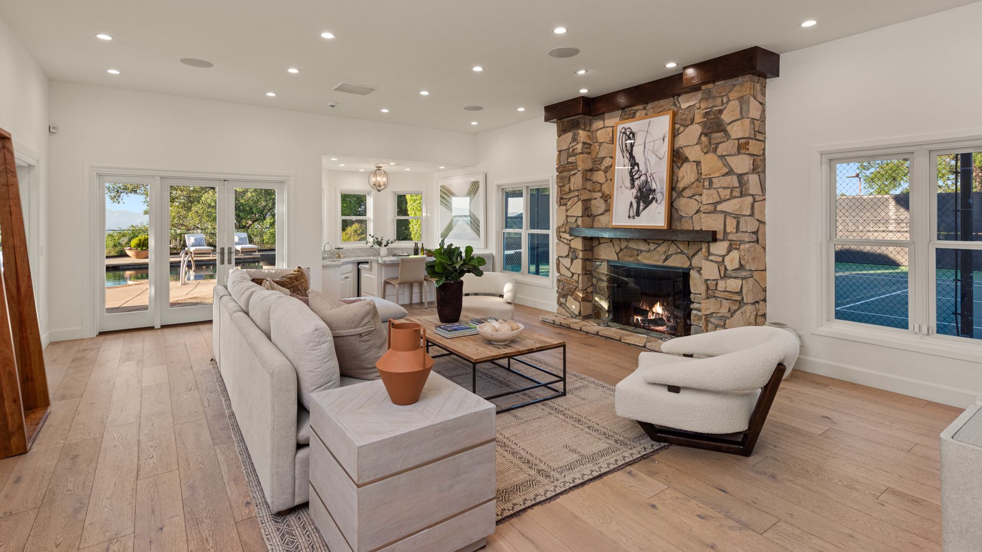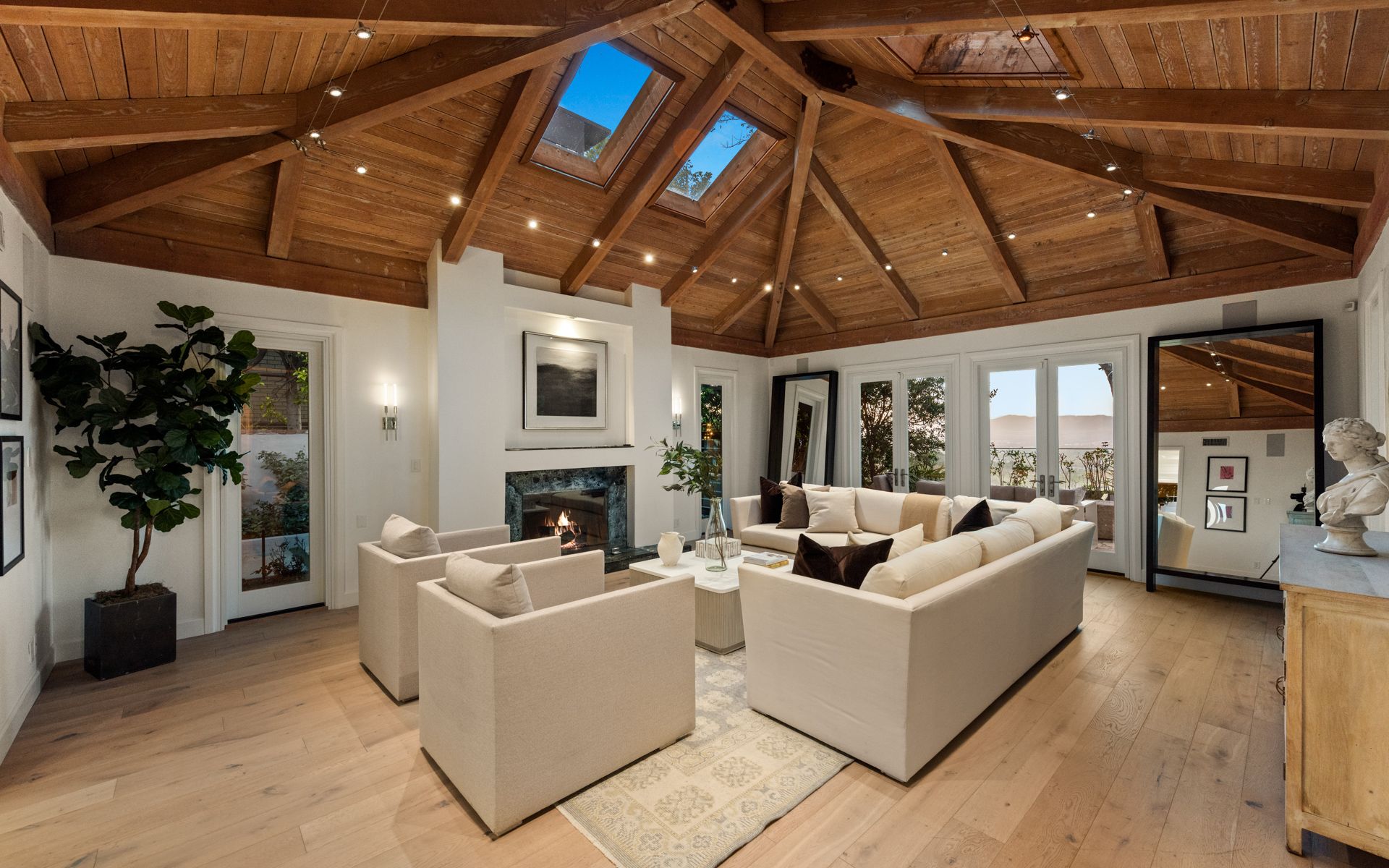 Inside, soaring wood-beamed ceilings, rich wood and stone floors, and expansive windows set a warm, inviting tone. The updated kitchen and baths feature tasteful design and premium finishes, while skylights bathe the interiors in natural light. A formal dining room with butler’s pantry, cozy den/library, and a stylish family room with full bar and wine storage elevate the living experience.