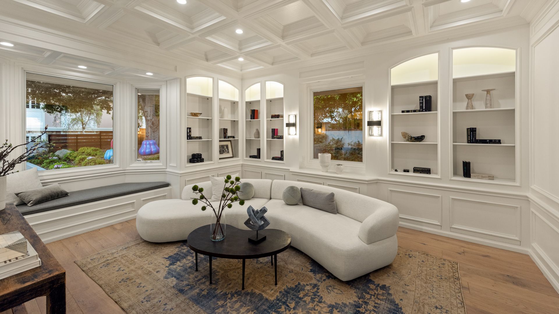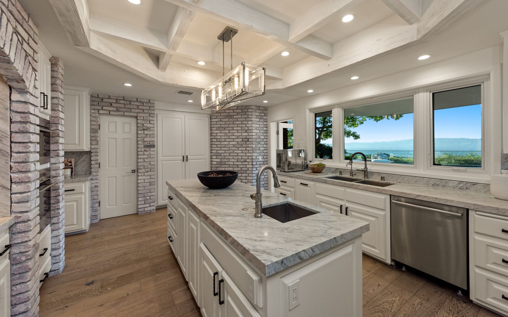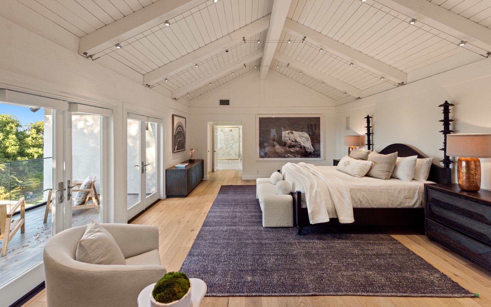 Inside, soaring wood-beamed ceilings, rich wood and stone floors, and expansive windows set a warm, inviting tone. The updated kitchen and baths feature tasteful design and premium finishes, while skylights bathe the interiors in natural light. A formal dining room with butler’s pantry, cozy den/library, and a stylish family room with full bar and wine storage elevate the living experience.