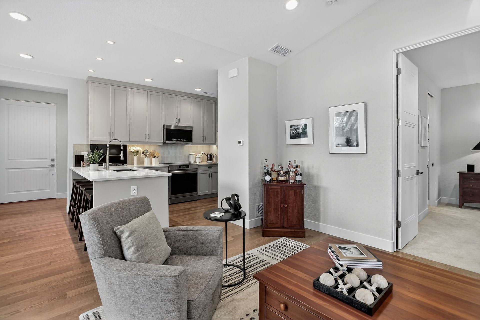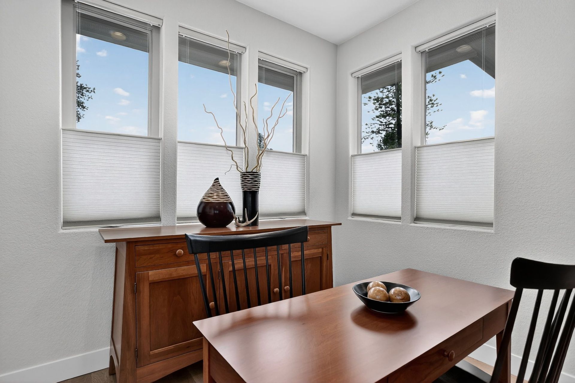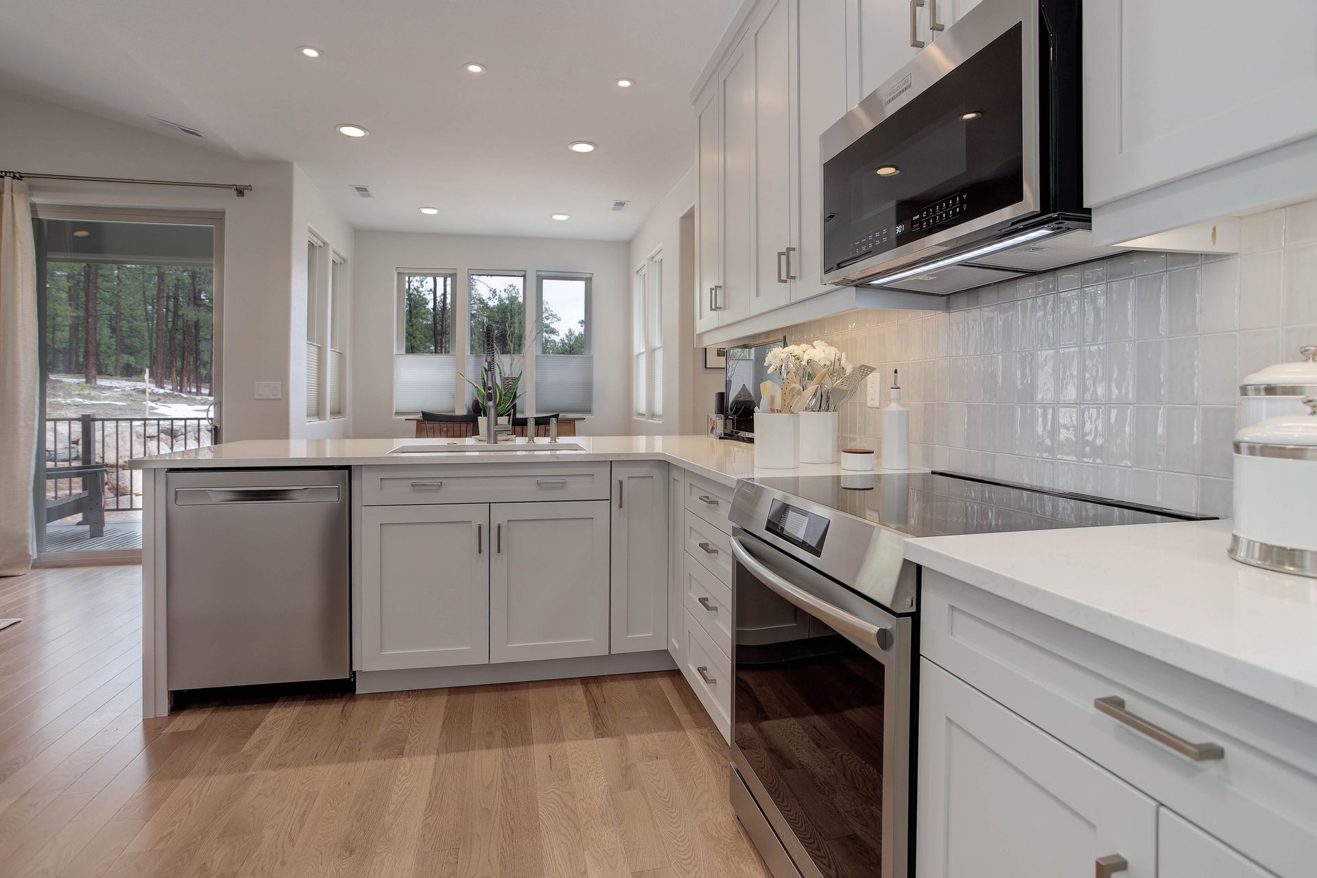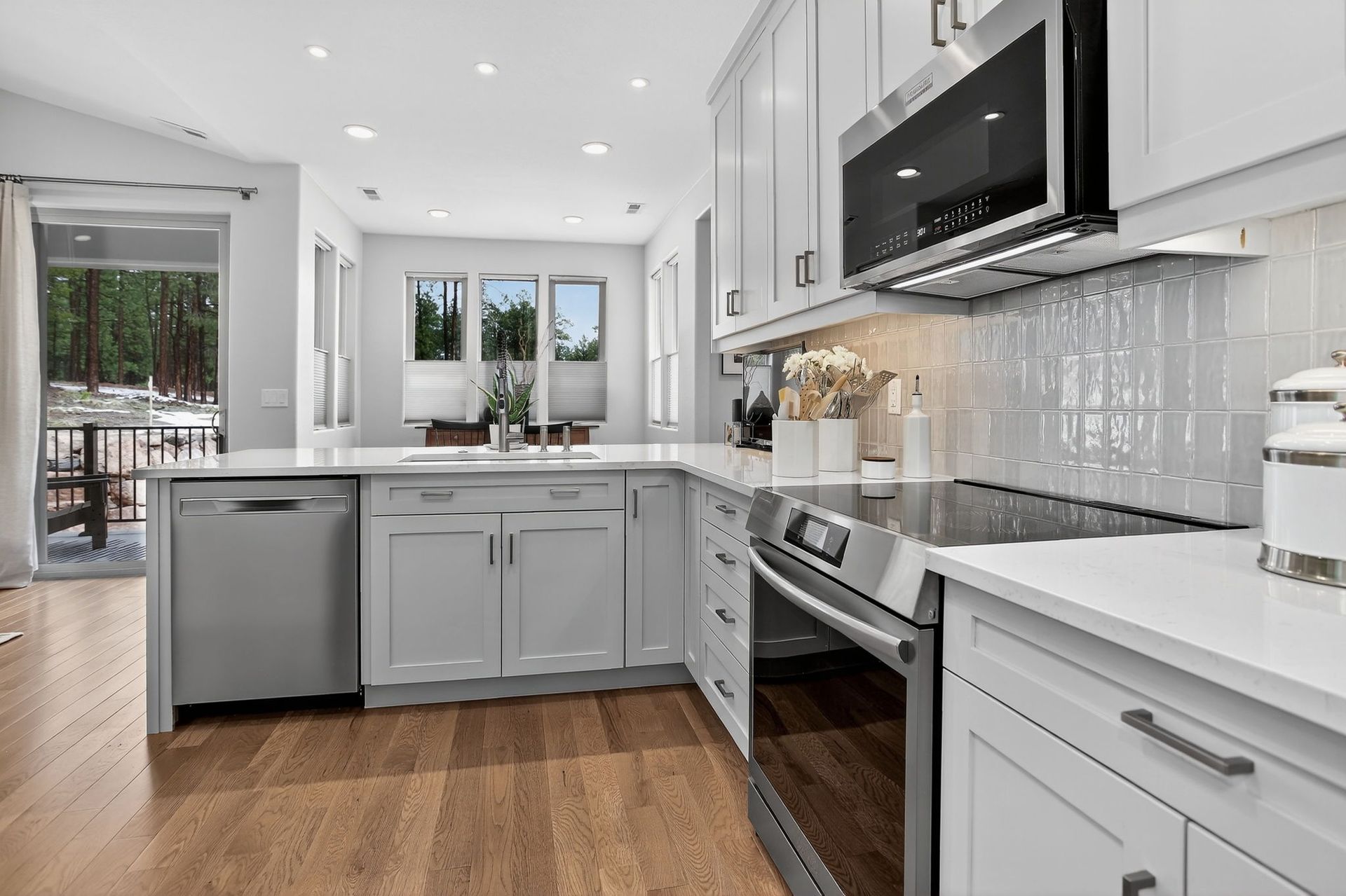 This stunning low-maintenance home welcomes you with a bright, airy main living space that flows seamlessly from the foyer into the dining and sitting/living areas, all highlighted by wood flooring, soaring ceilings, and serene forest views. The chef’s kitchen is a showstopper with quartz countertops, a glazed subway tile backsplash, stainless steel appliances—including an induction cooktop, convection/air-fry microwave, and convection oven—and 48" soft-close cabinets with pull-out drawers. Quartz surfaces carry into the laundry room and baths, creating a seamless, sophisticated finish throughout.