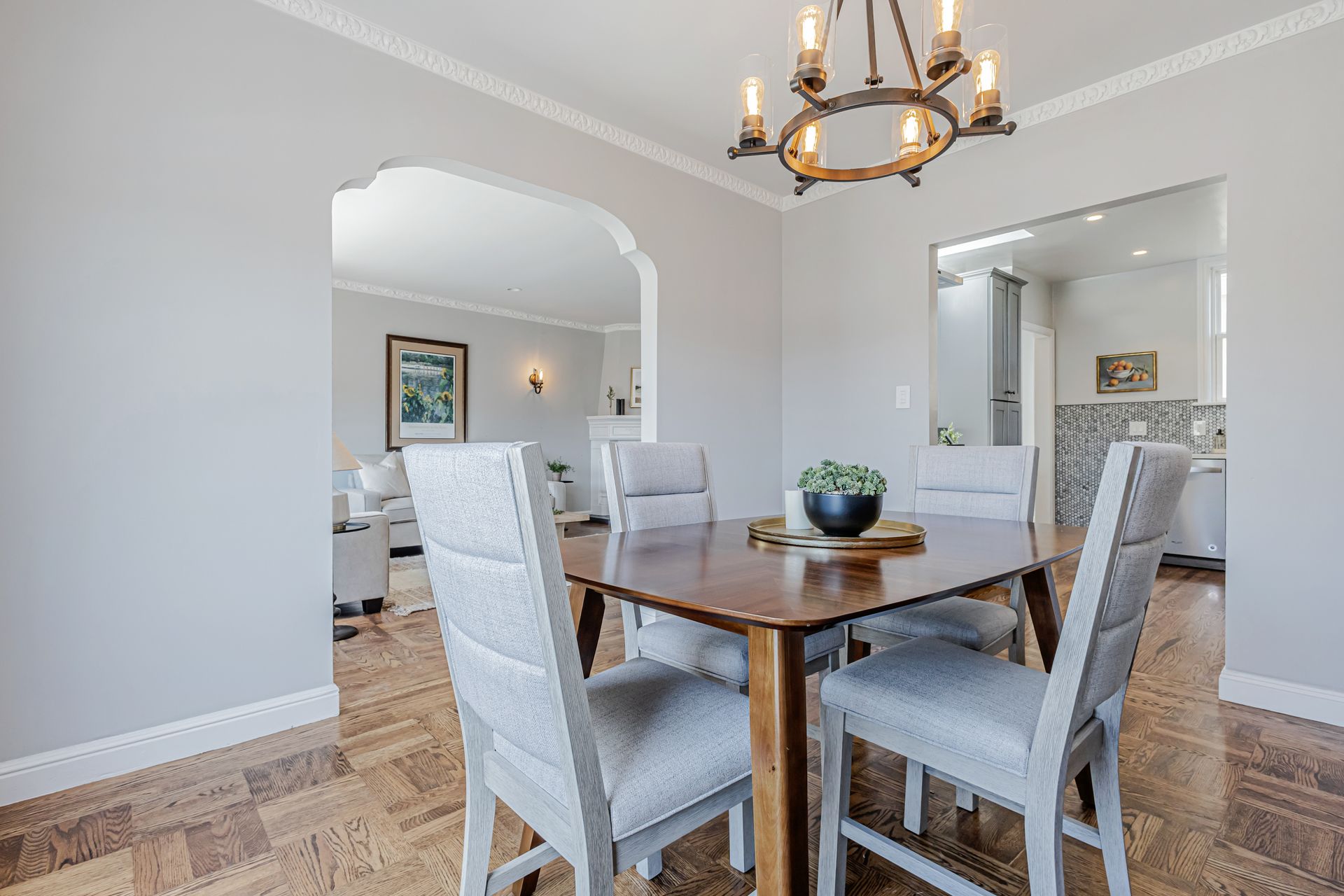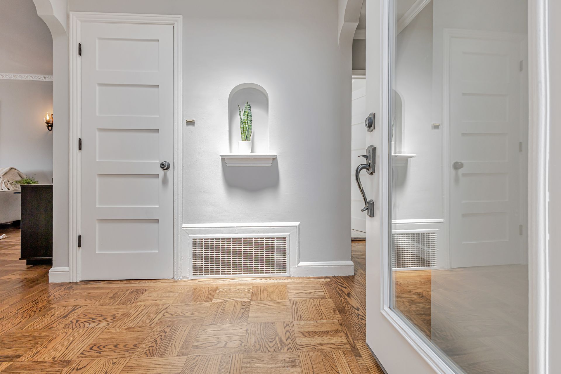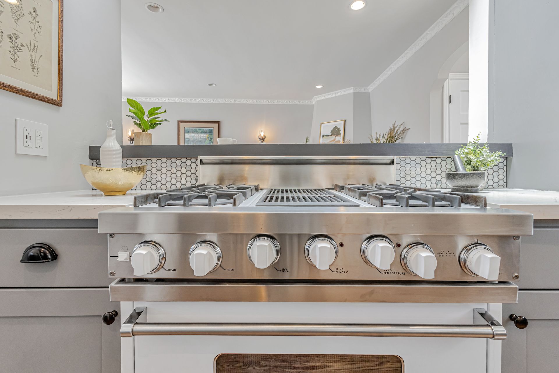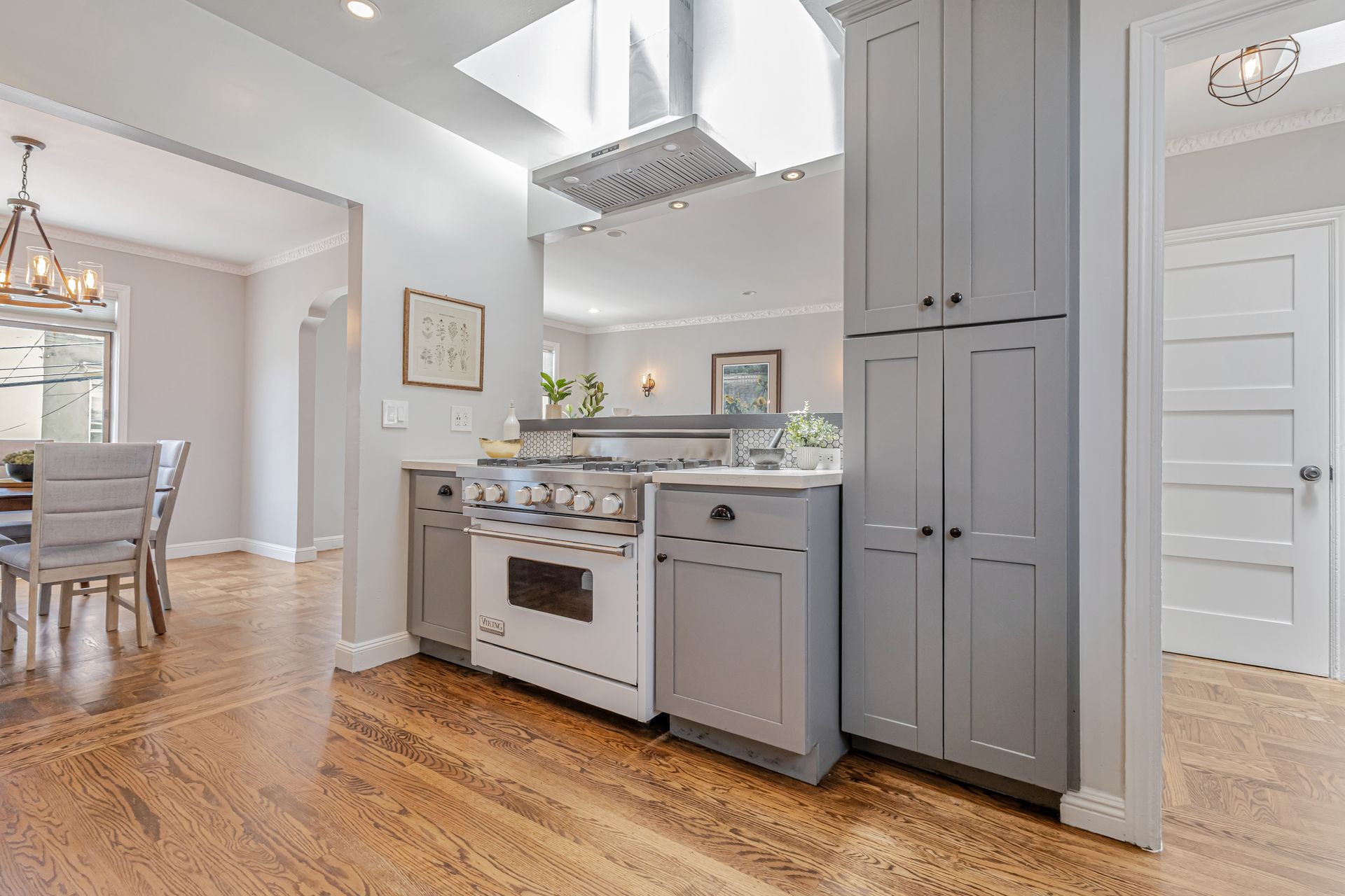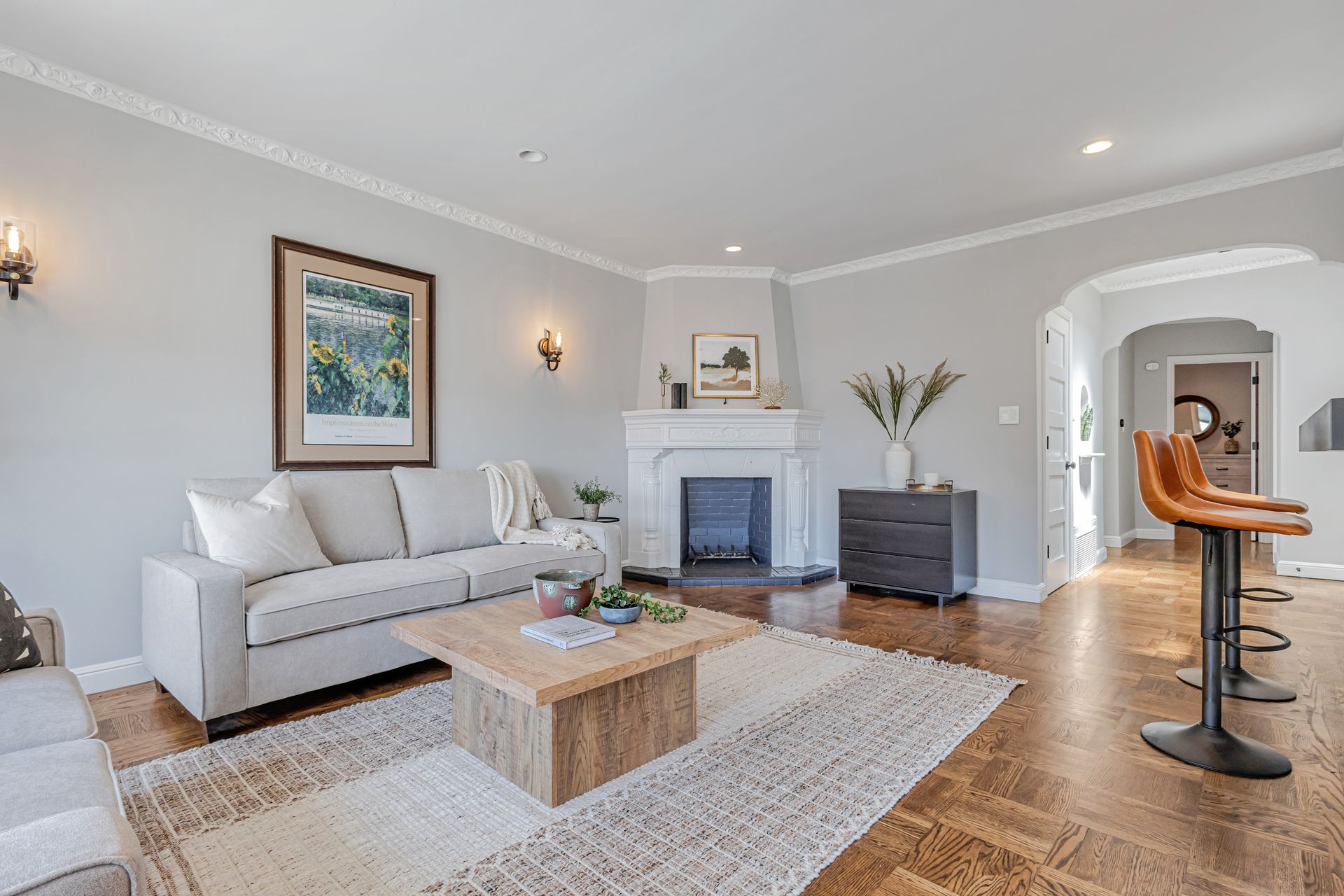 Enter into a charming exterior foyer that enhances the home's warm welcome. A stylish glass front door opens into a sunlit main level, where parquet hardwood floors and abundant windows create a bright, spacious atmosphere. The expansive living room features a cozy fireplace and flows seamlessly into a gourmet eat-in kitchen, complete with high-end appliances — including a striking red Wolf stove — ample counter space, and elegant cabinetry, making it ideal for both cooking and entertaining.