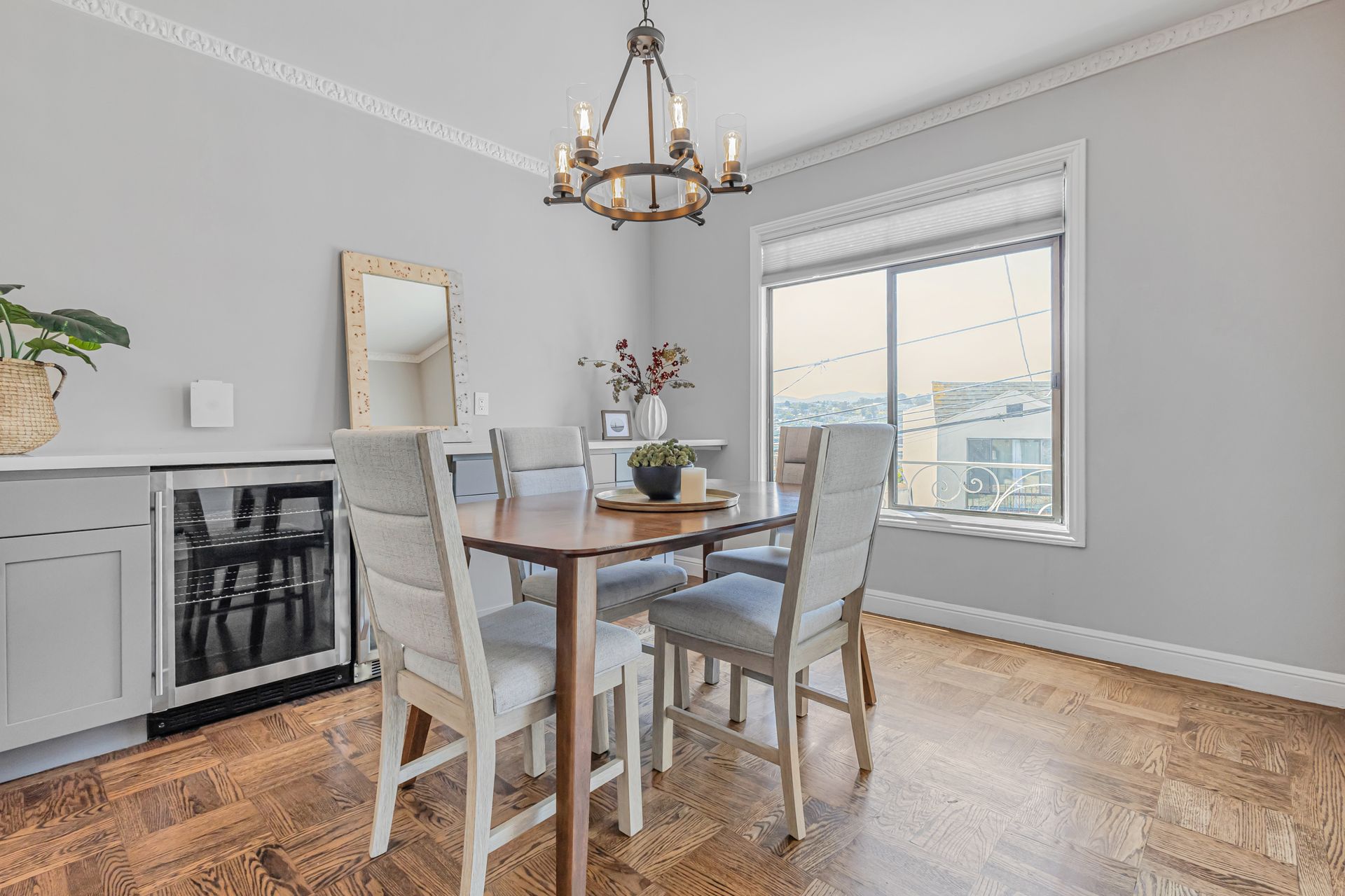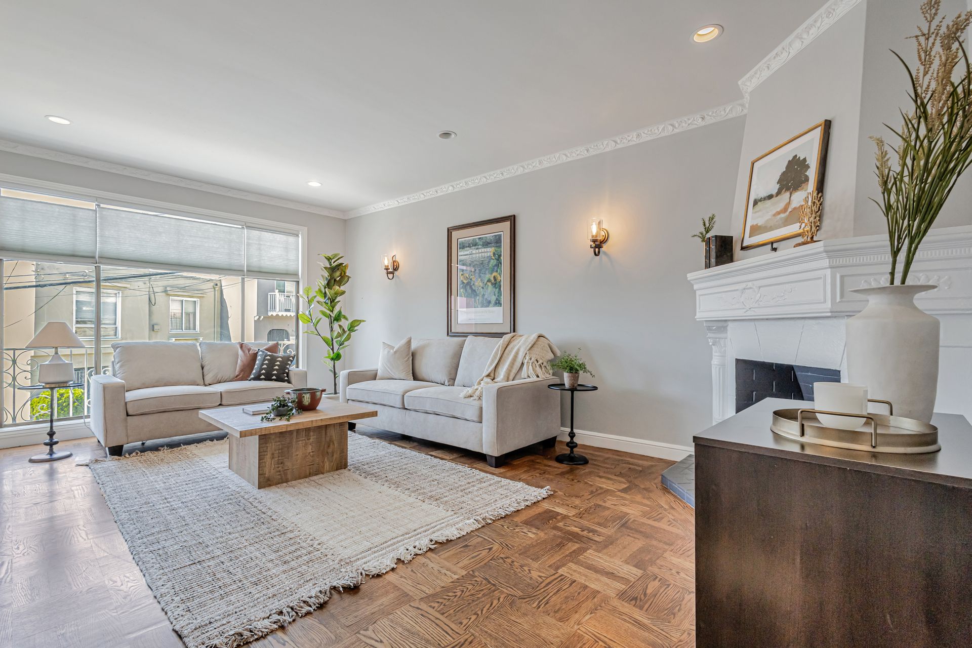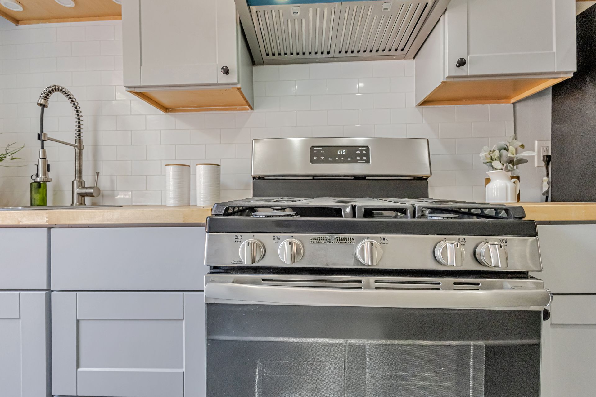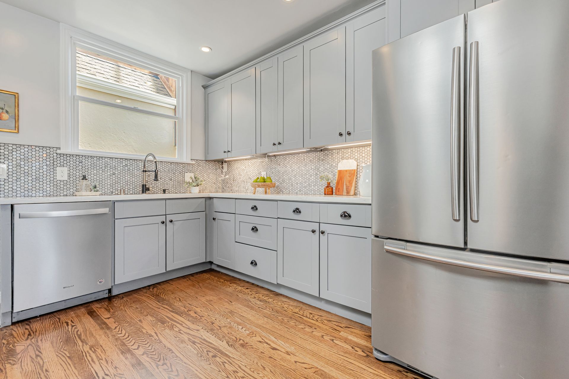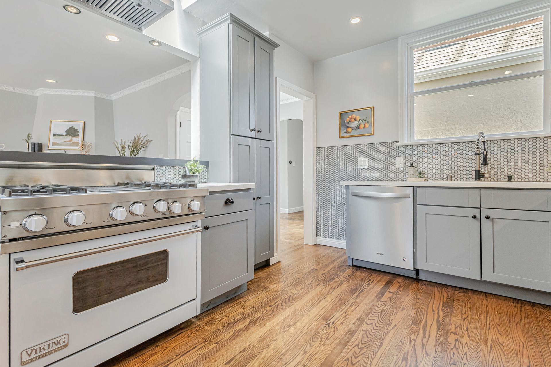 Enter into a charming exterior foyer that enhances the home's warm welcome. A stylish glass front door opens into a sunlit main level, where parquet hardwood floors and abundant windows create a bright, spacious atmosphere. The expansive living room features a cozy fireplace and flows seamlessly into a gourmet eat-in kitchen, complete with high-end appliances — including a striking red Wolf stove — ample counter space, and elegant cabinetry, making it ideal for both cooking and entertaining.