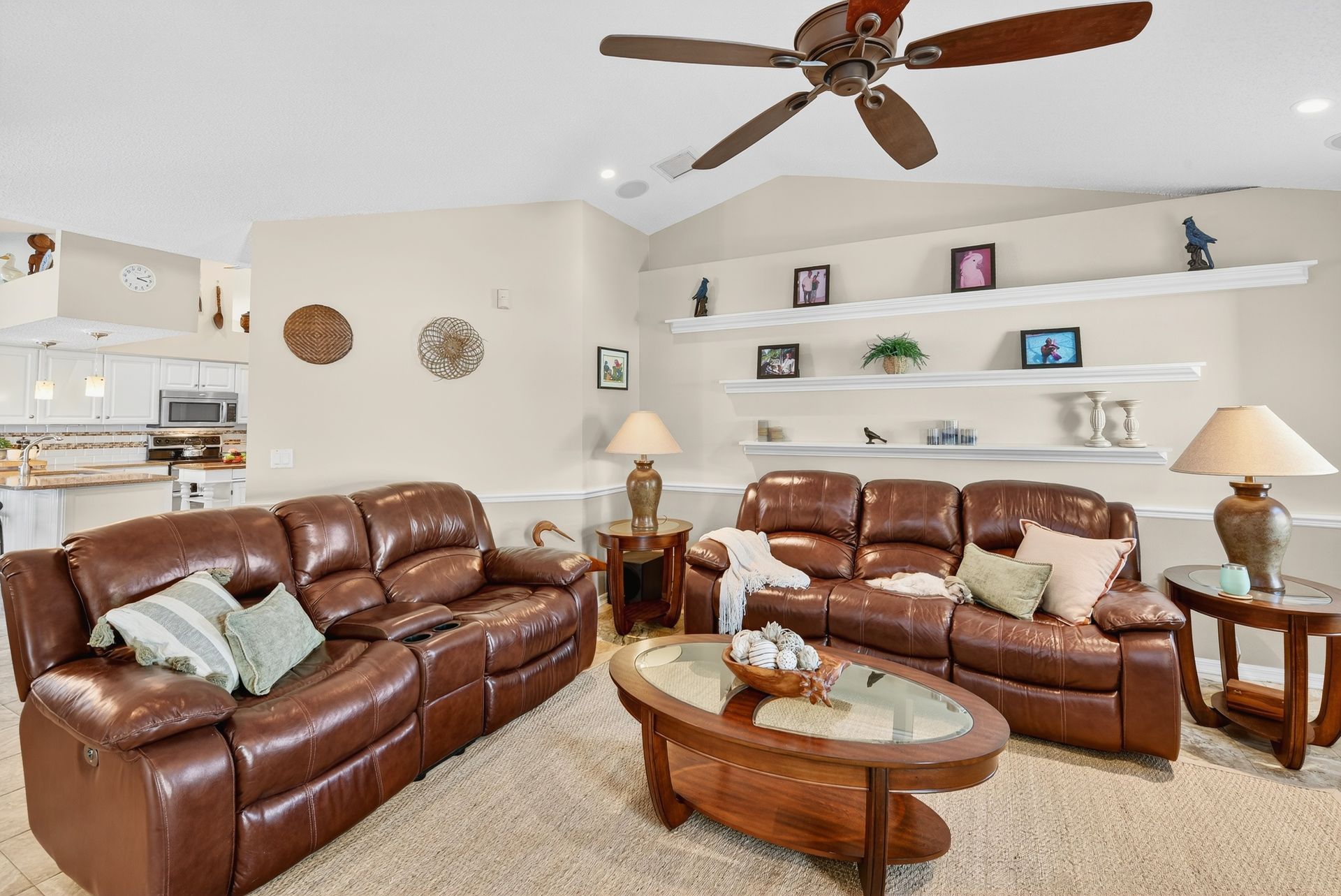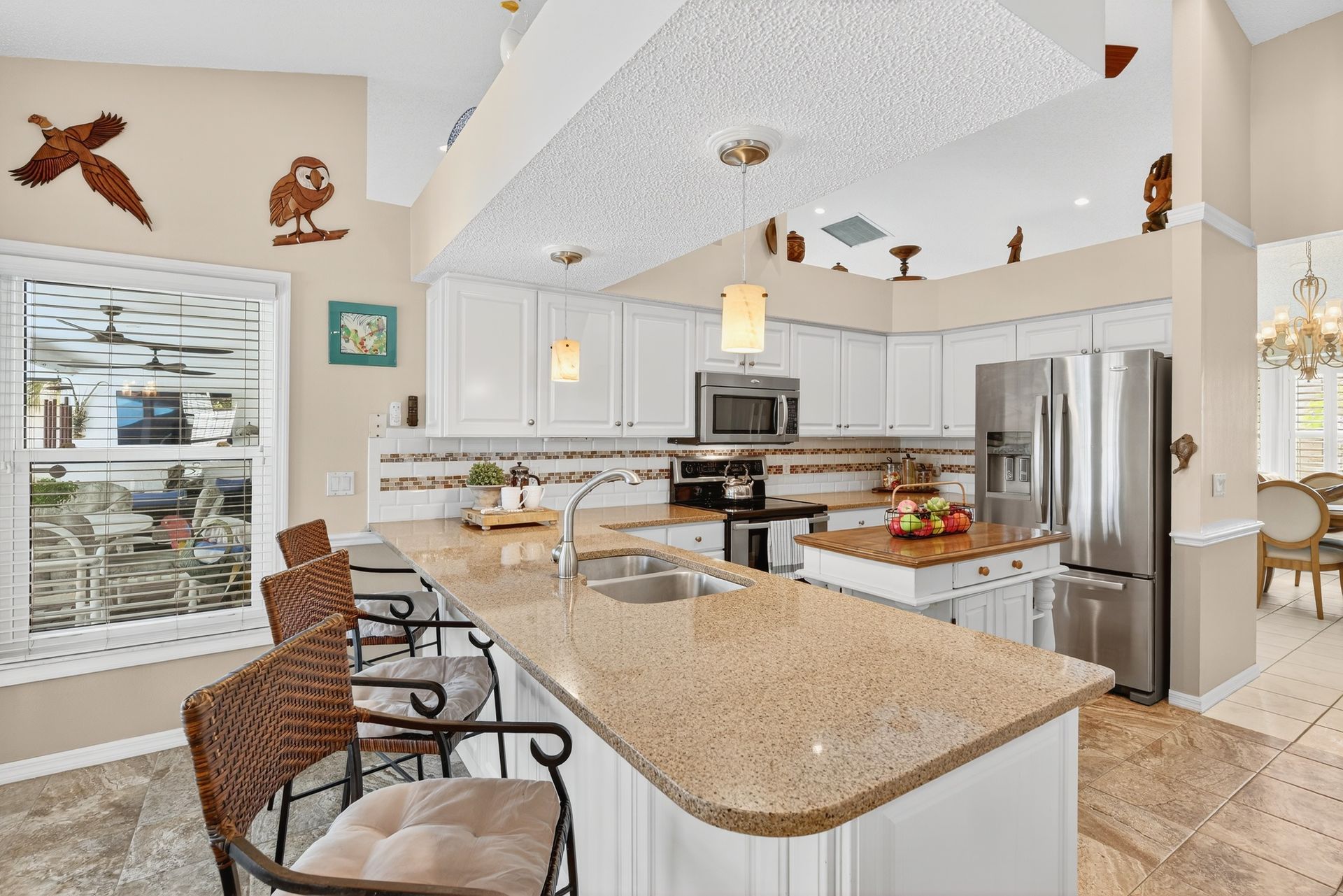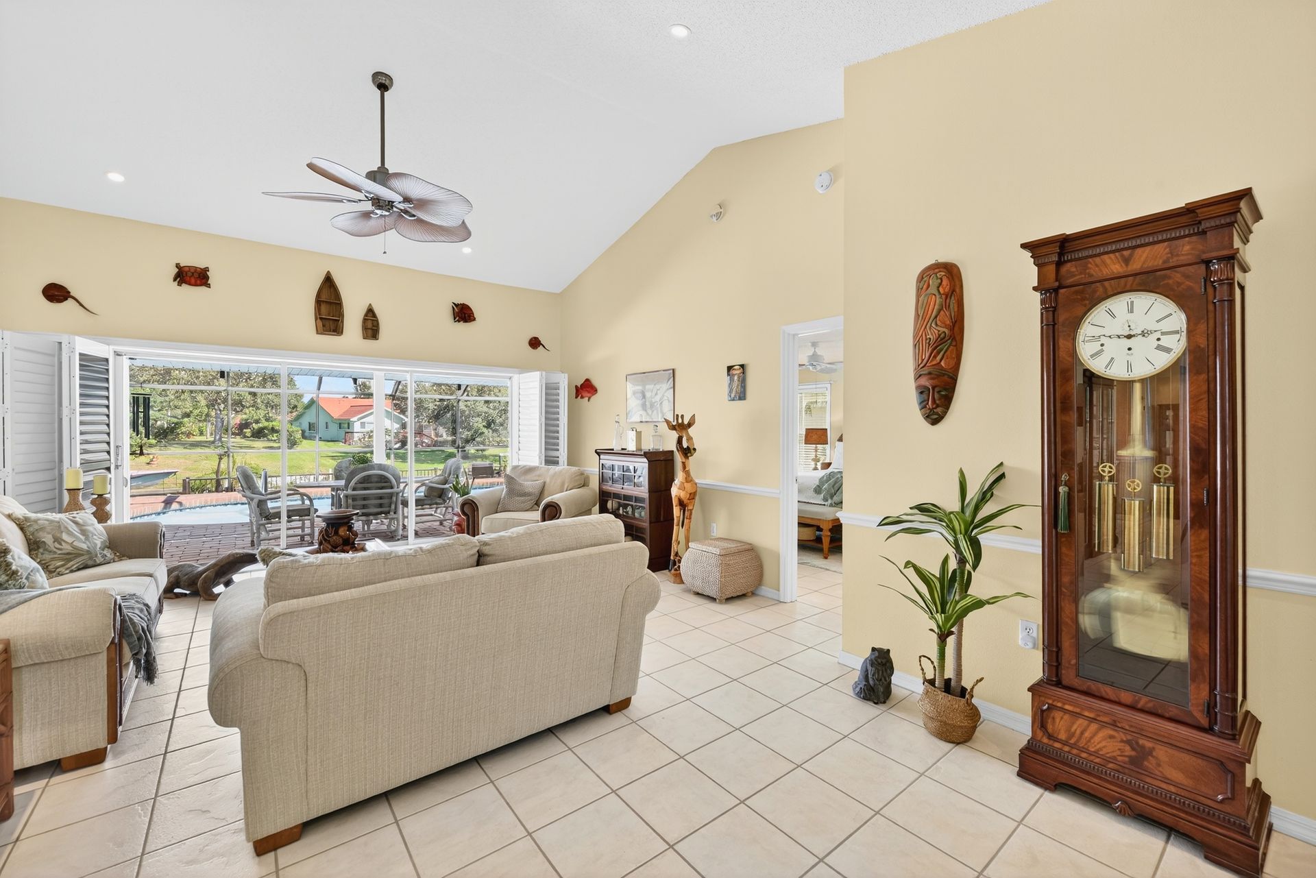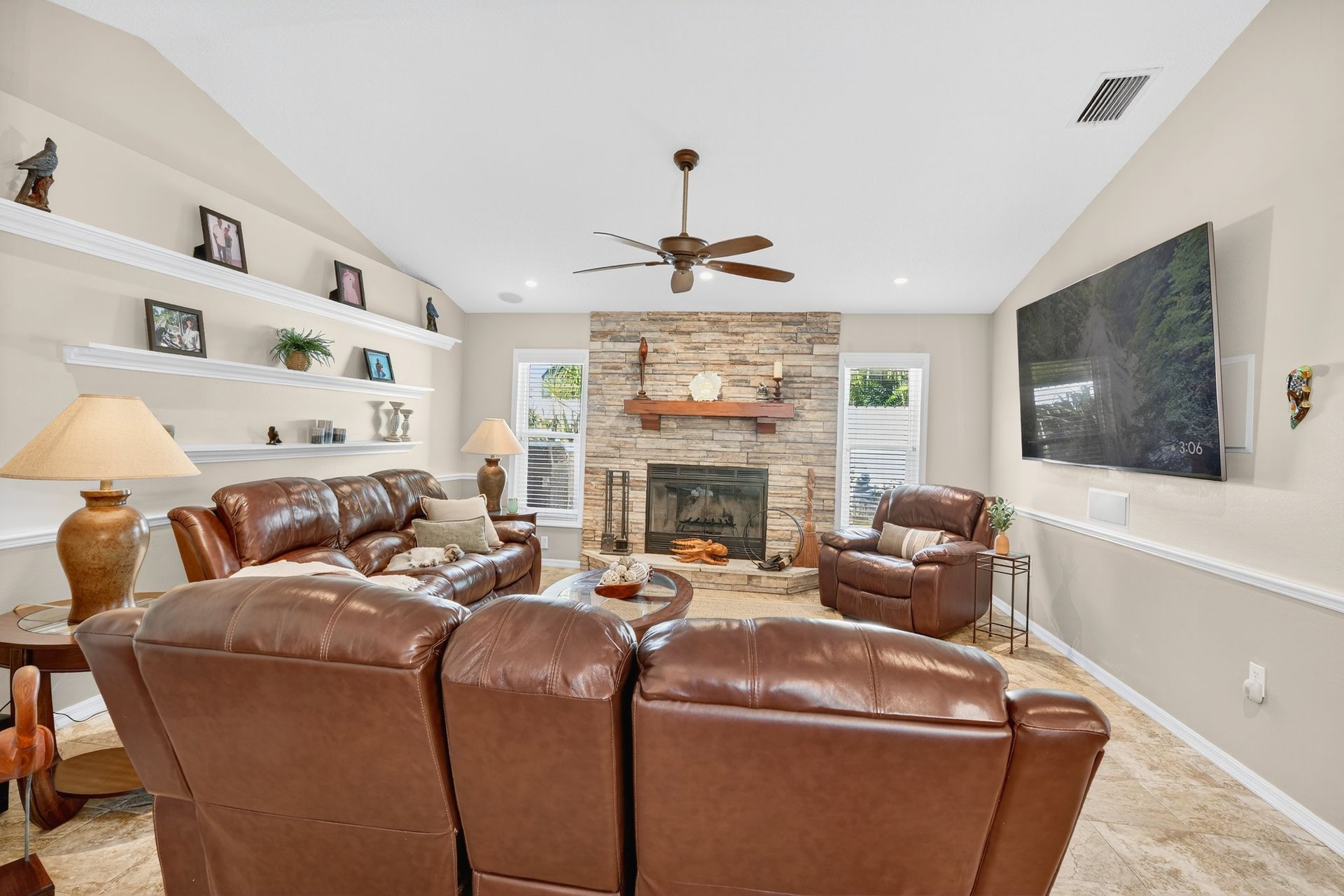 Inside, high ceilings and ceramic tile flow through a bright, open plan. The kitchen offers granite counters, walk-in pantry, and a breakfast bar for four. Four sets of pocket sliders open to the lanai for seamless indoor-outdoor living. The primary suite features dual walk-in closets and a spa-style bath with rain shower and abundant storage. Two generous guest bedrooms each include walk-in closets and ceiling fans. A split floor plan provides privacy, with a great room (fireplace), formal living room, and formal dining room for flexible entertaining.