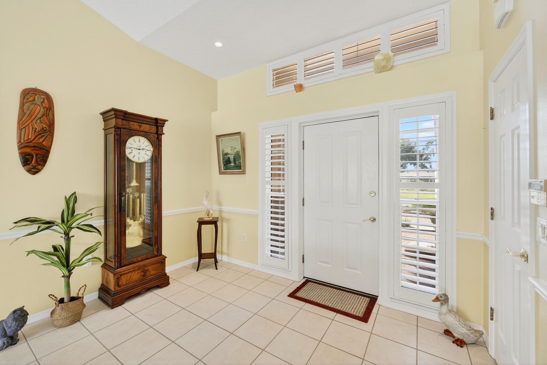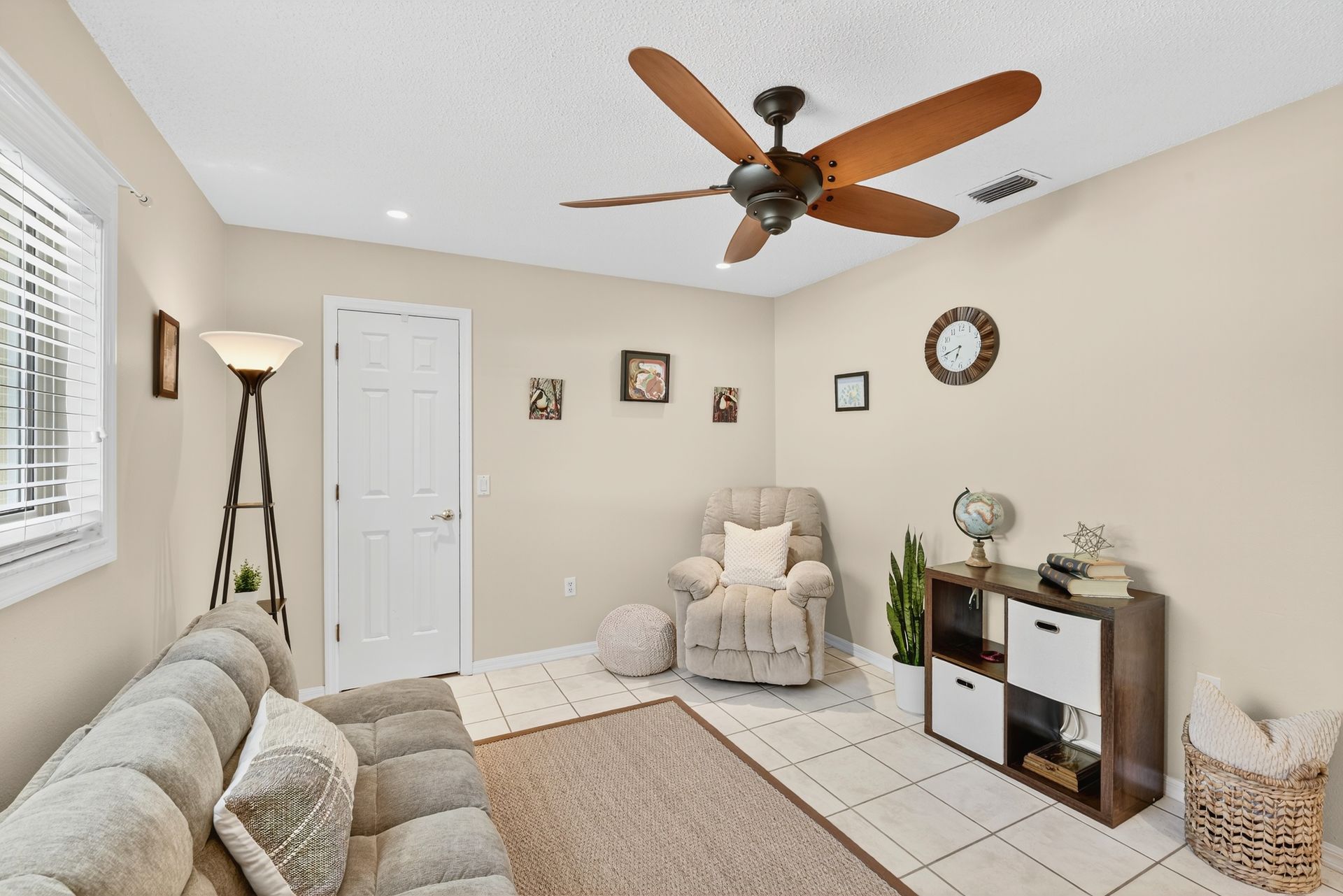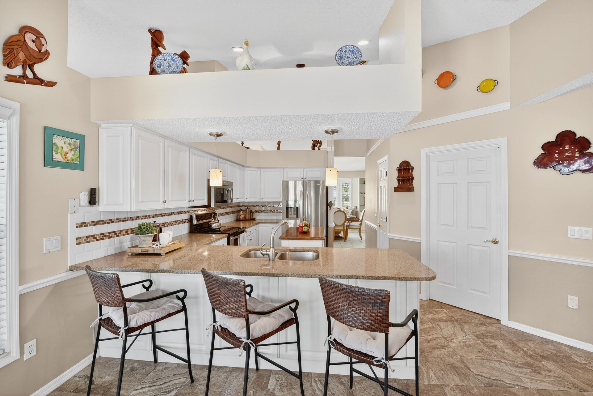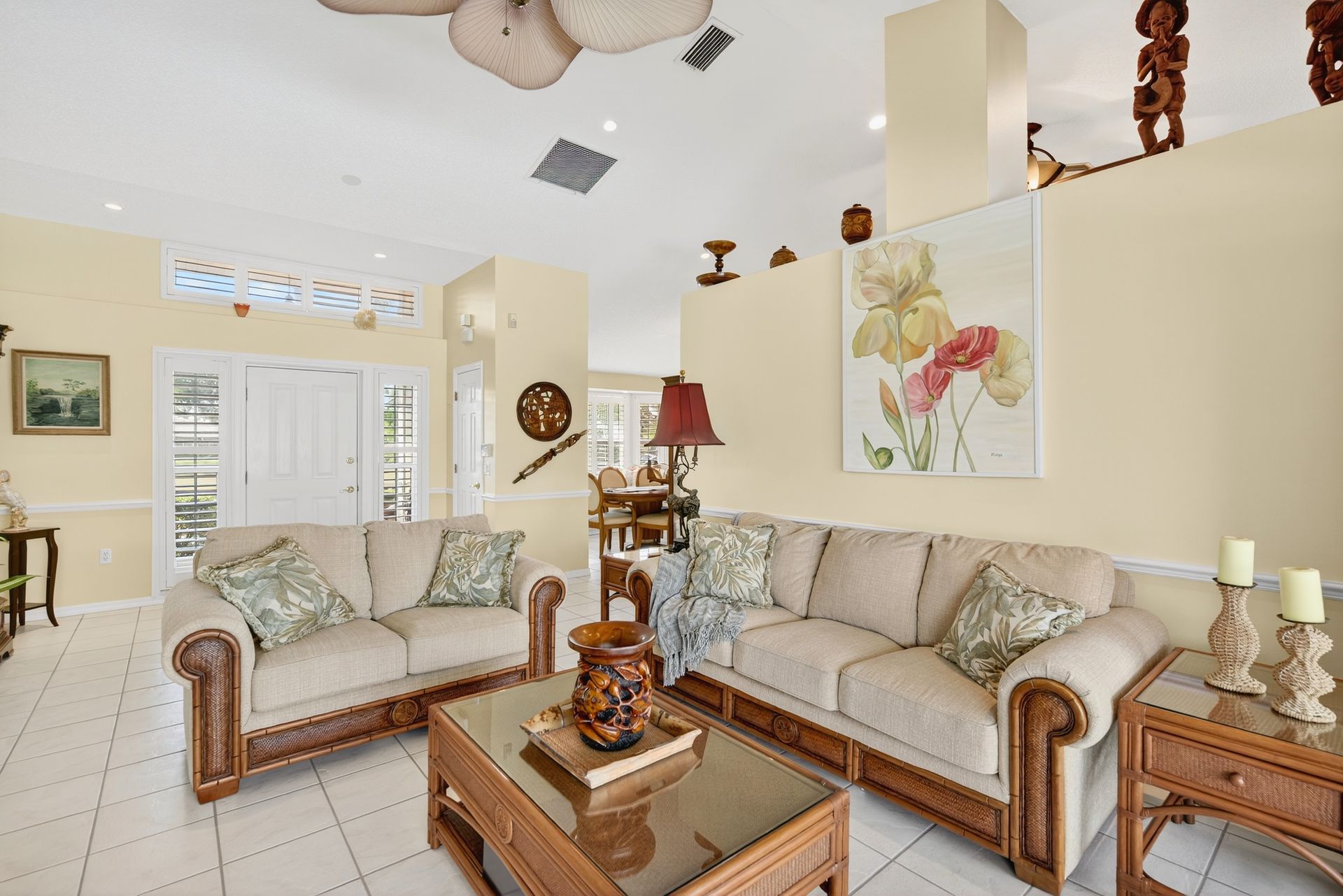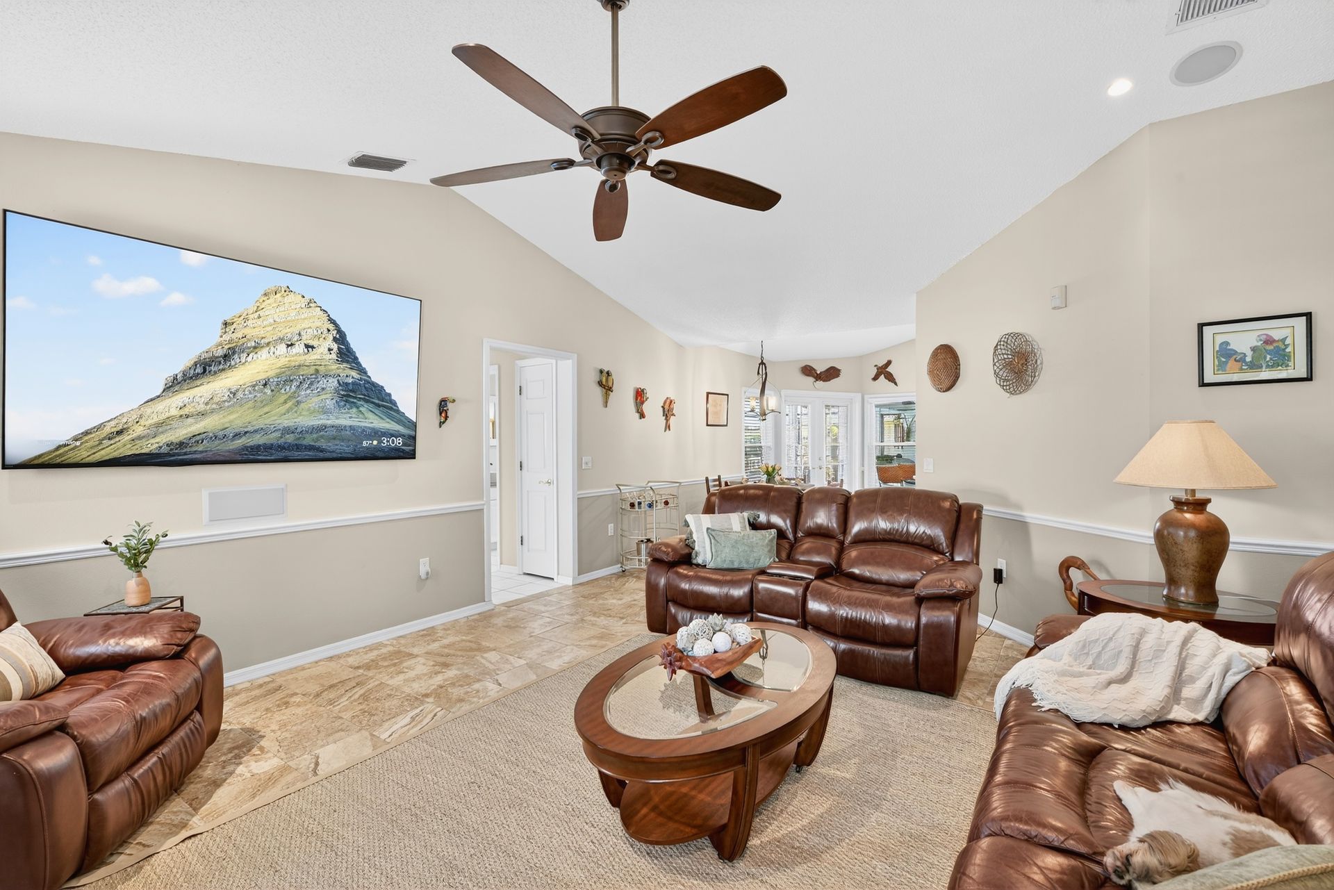 Inside, high ceilings and ceramic tile flow through a bright, open plan. The kitchen offers granite counters, walk-in pantry, and a breakfast bar for four. Four sets of pocket sliders open to the lanai for seamless indoor-outdoor living. The primary suite features dual walk-in closets and a spa-style bath with rain shower and abundant storage. Two generous guest bedrooms each include walk-in closets and ceiling fans. A split floor plan provides privacy, with a great room (fireplace), formal living room, and formal dining room for flexible entertaining.