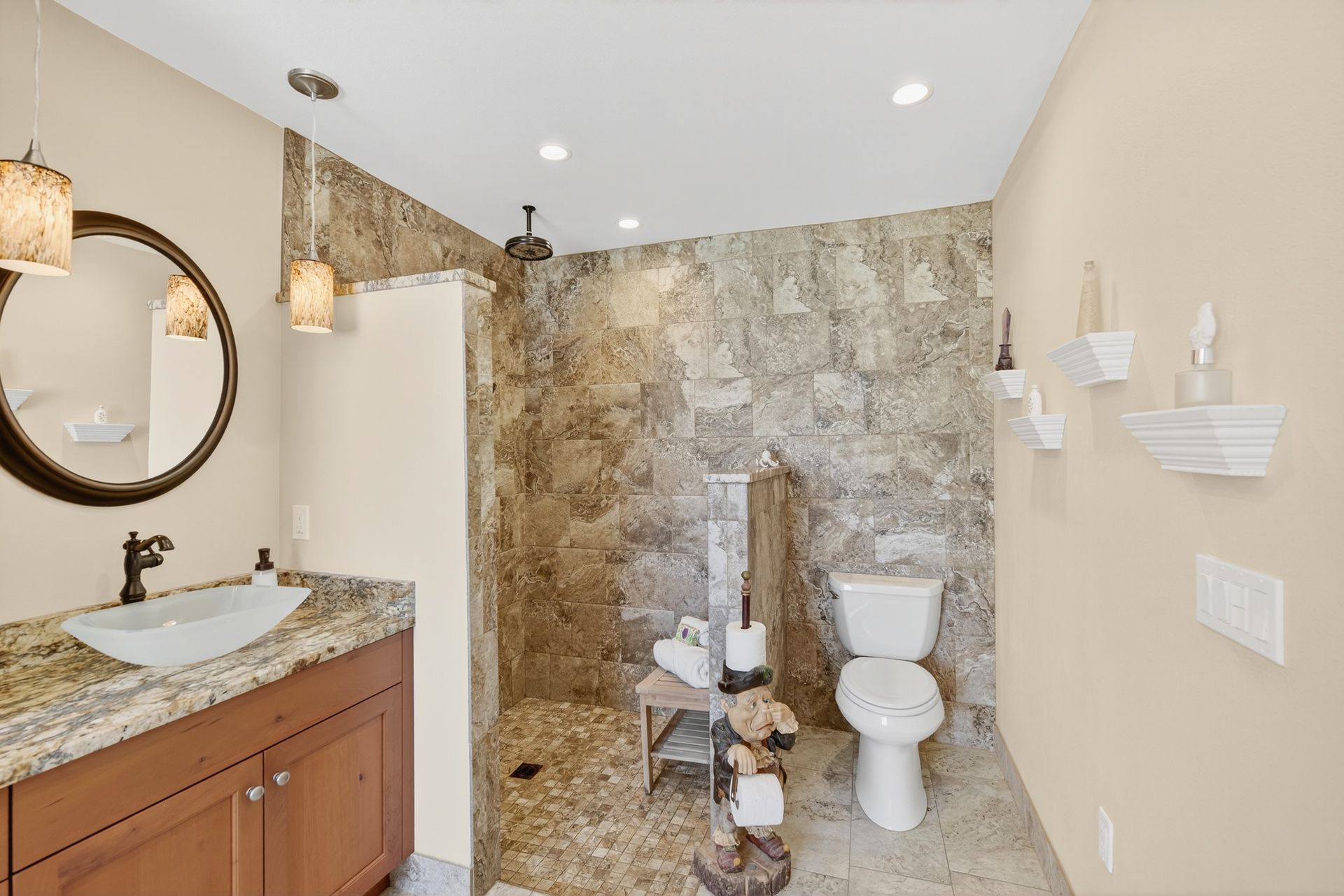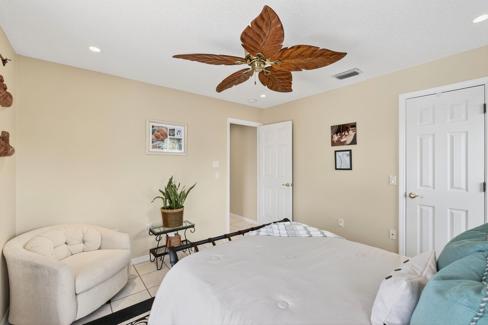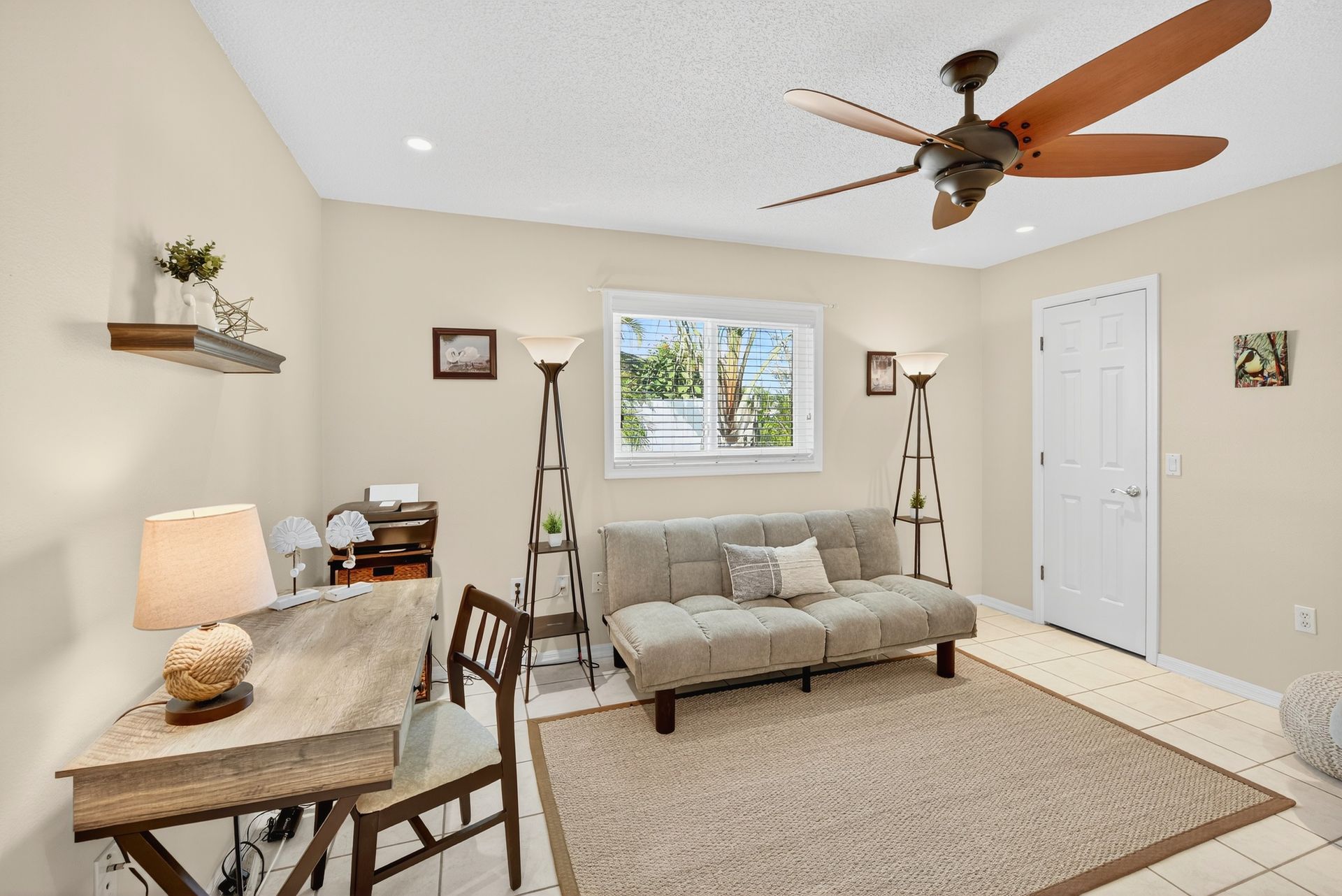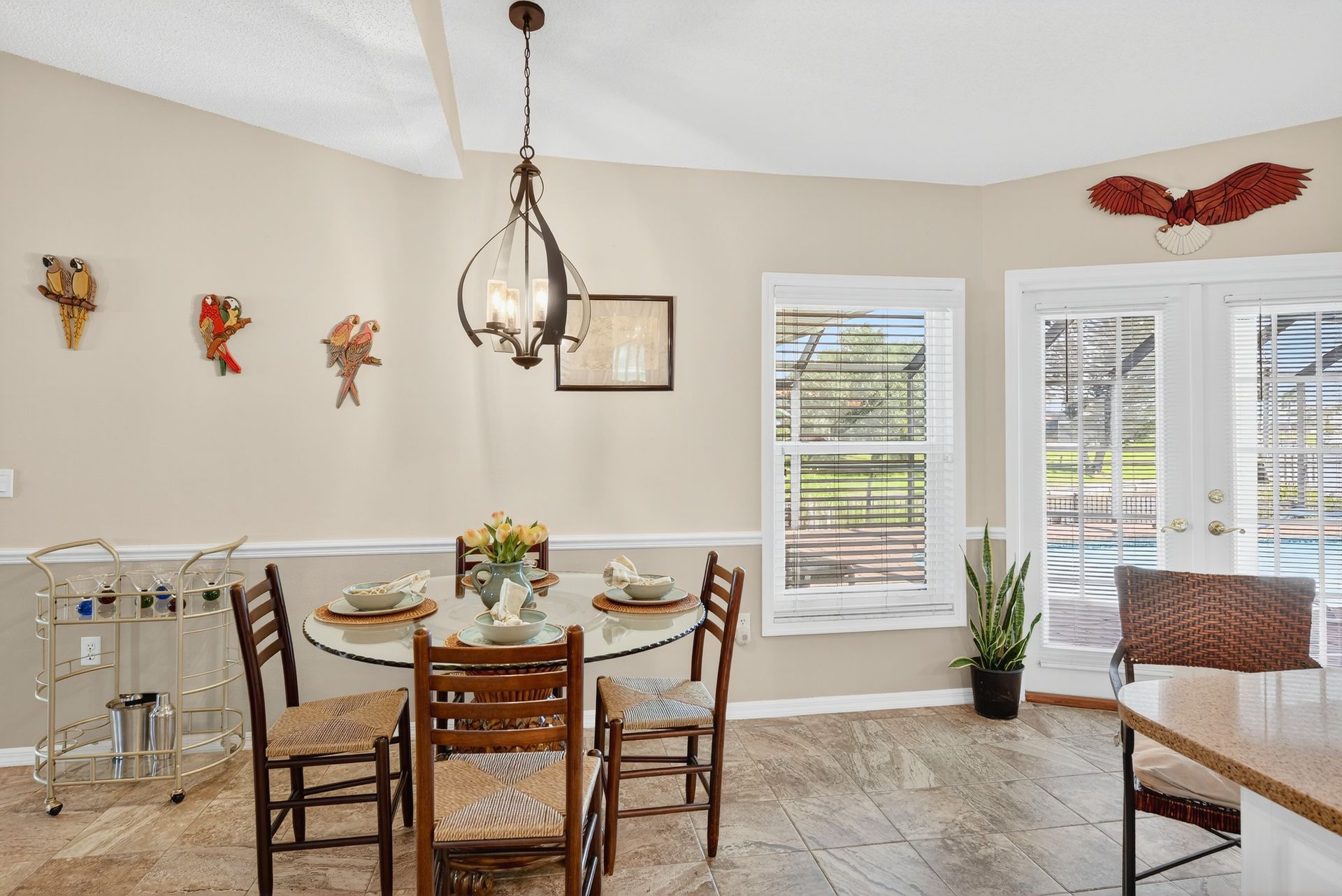 Inside, high ceilings and ceramic tile flow through a bright, open plan. The kitchen offers granite counters, walk-in pantry, and a breakfast bar for four. Four sets of pocket sliders open to the lanai for seamless indoor-outdoor living. The primary suite features dual walk-in closets and a spa-style bath with rain shower and abundant storage. Two generous guest bedrooms each include walk-in closets and ceiling fans. A split floor plan provides privacy, with a great room (fireplace), formal living room, and formal dining room for flexible entertaining.