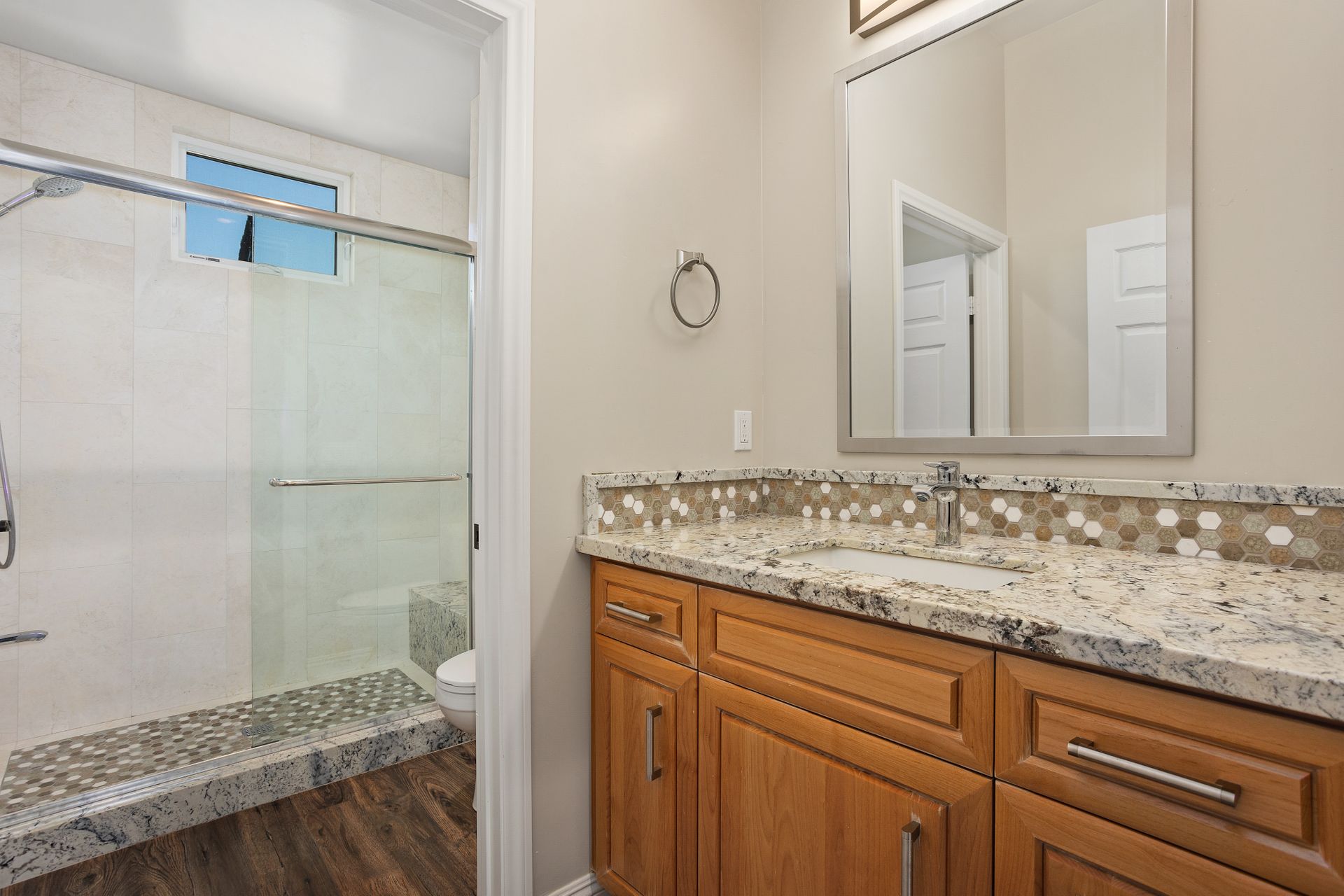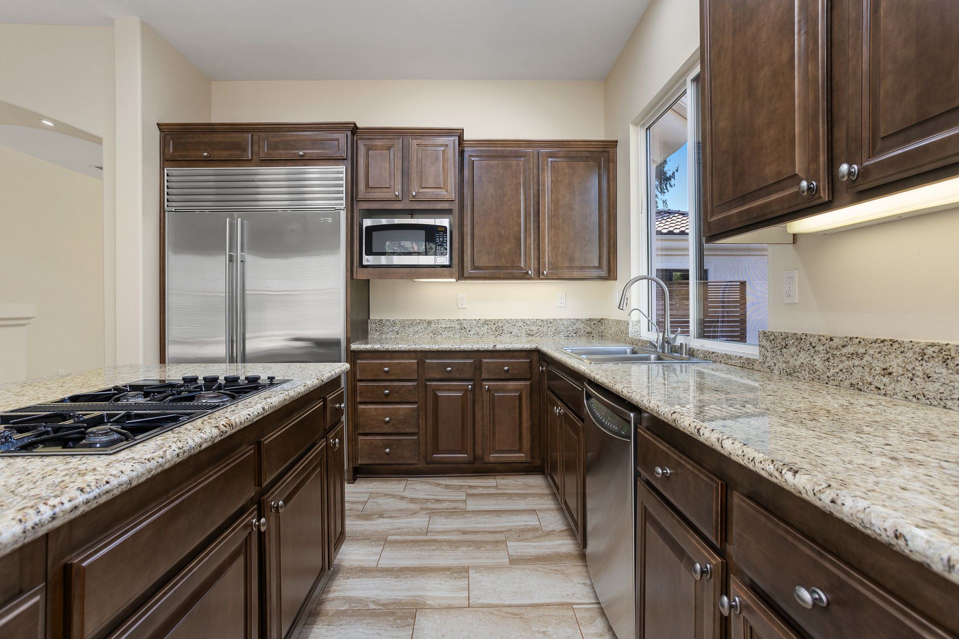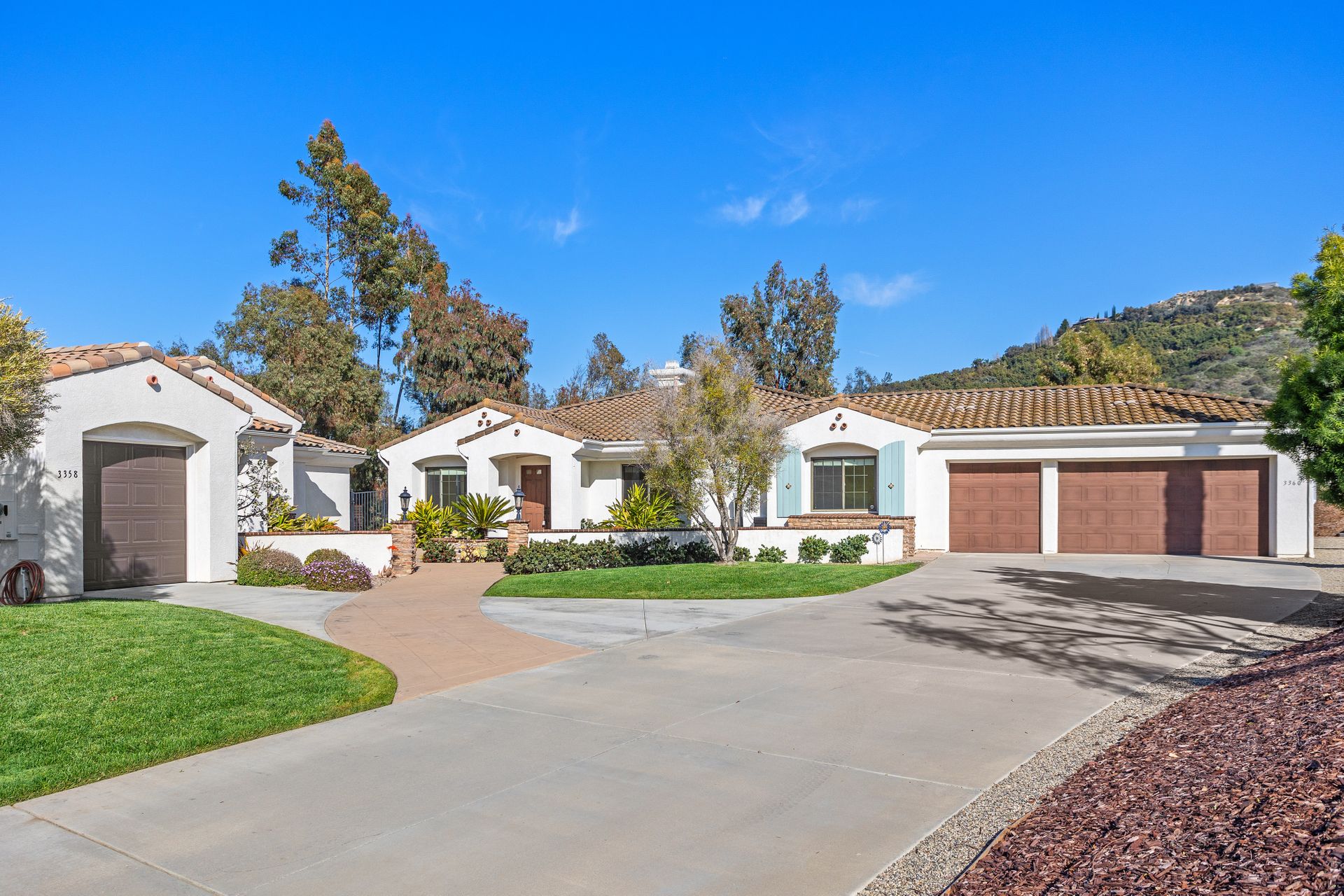 This stunning single-level home with a detached casita is move-in ready and a rare find, with the added bonus of no HOA. Located in Sycamore Ranch at the end of a peaceful cul-de-sac on an acre lot, the property features a welcoming courtyard entrance that leads to a spacious 2,600 square foot main house with three bedrooms and two and one-half bathrooms including fully remodeled bathrooms with elegant travertine and stone finishes.