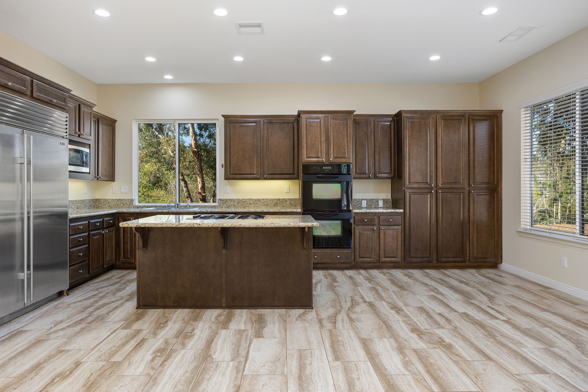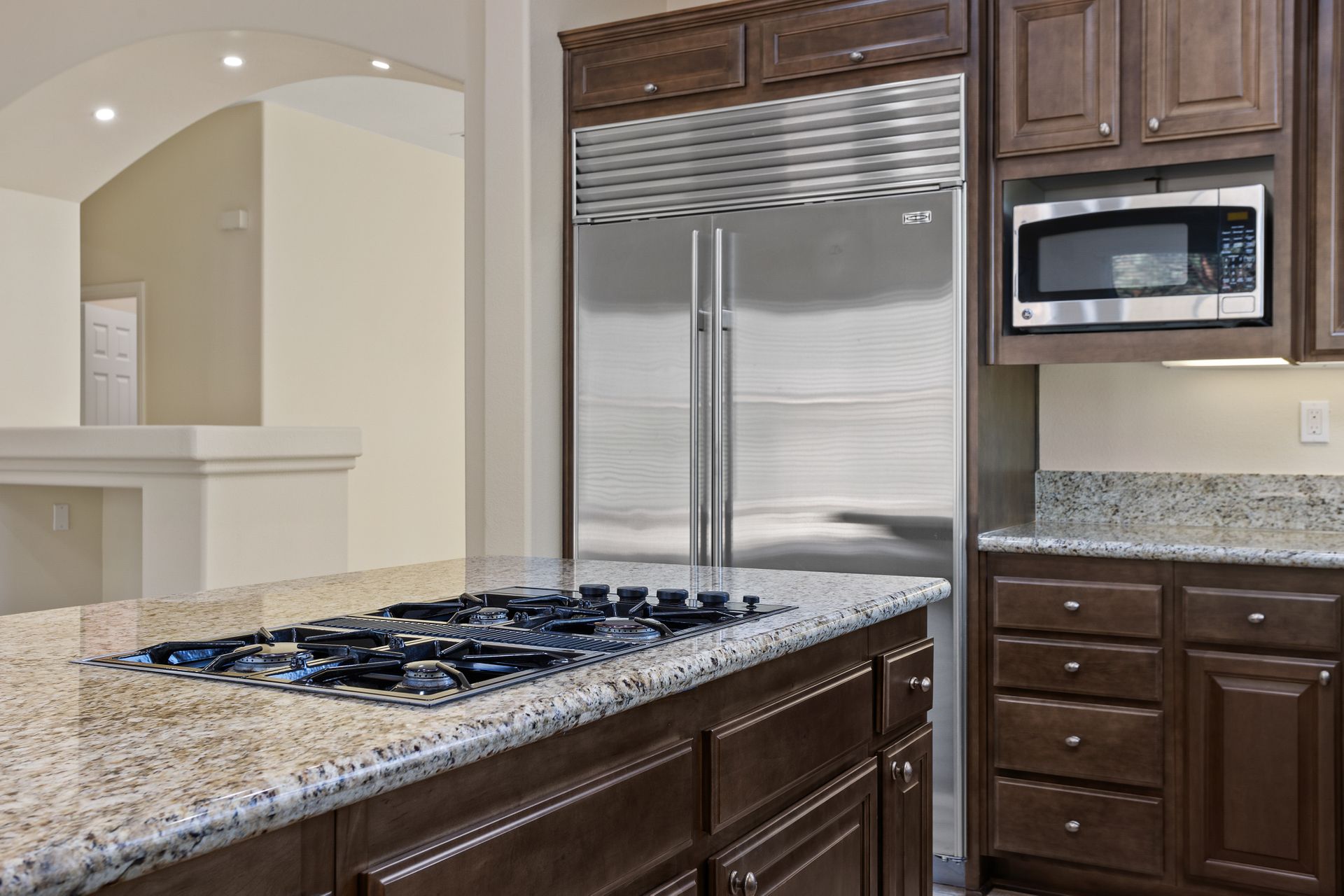 Inside, enjoy the inviting livable, and dining spaces with porcelain tile flooring and 10-foot ceilings. The custom kitchen features freshly stained cabinets, granite countertops, a built-in stainless-steel refrigerator, dual ovens, and an island with a cooktop stove. The primary bedroom is a peaceful retreat with French doors opening to the backyard, a comfortable sitting area, and custom walk-in closet. Newly installed carpet in all bedrooms adds warmth and comfort.